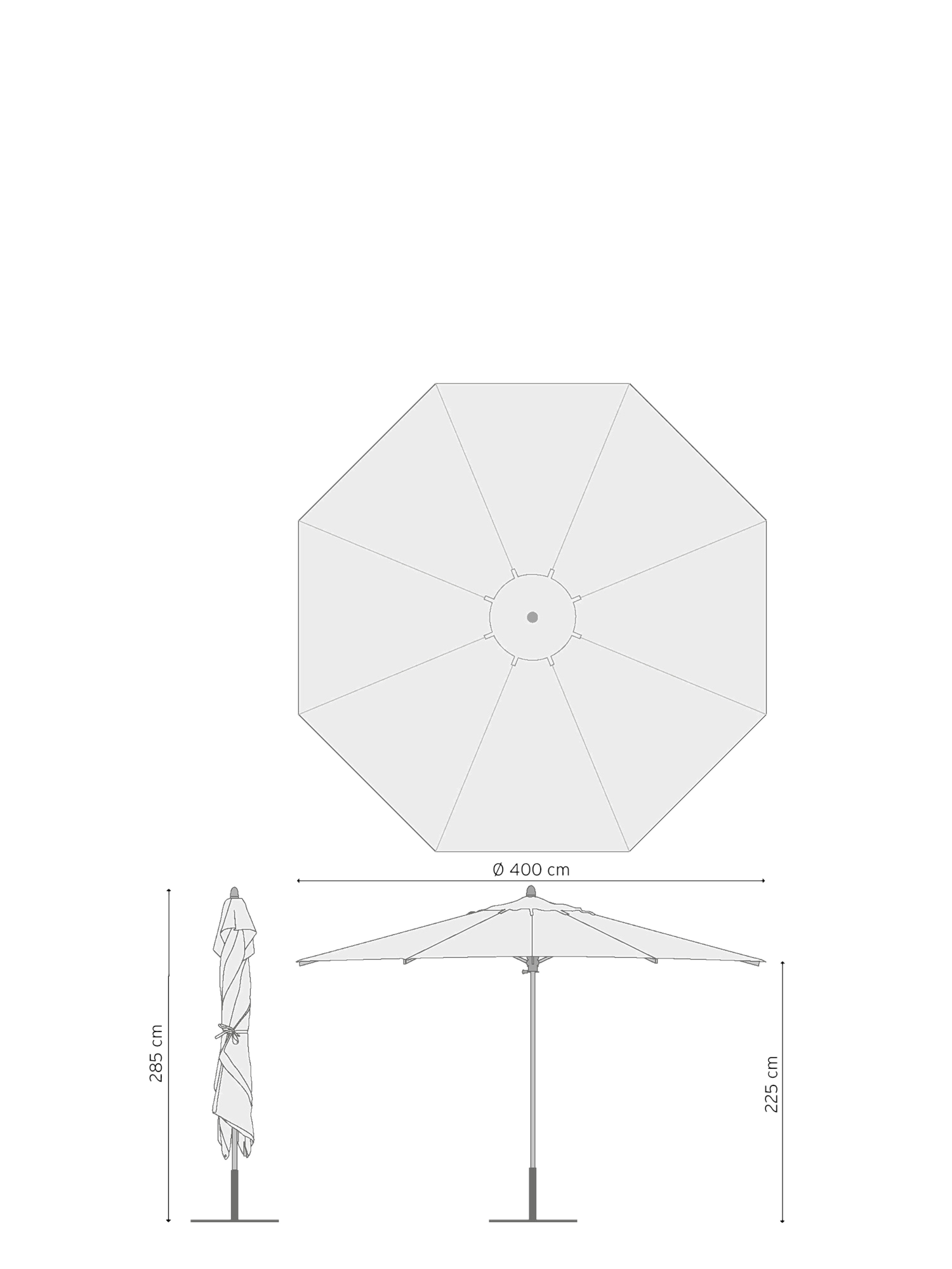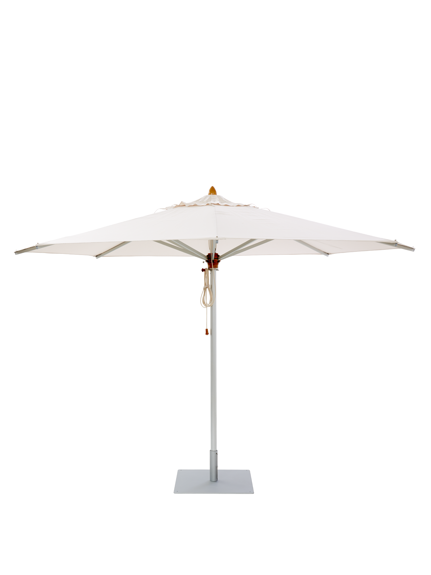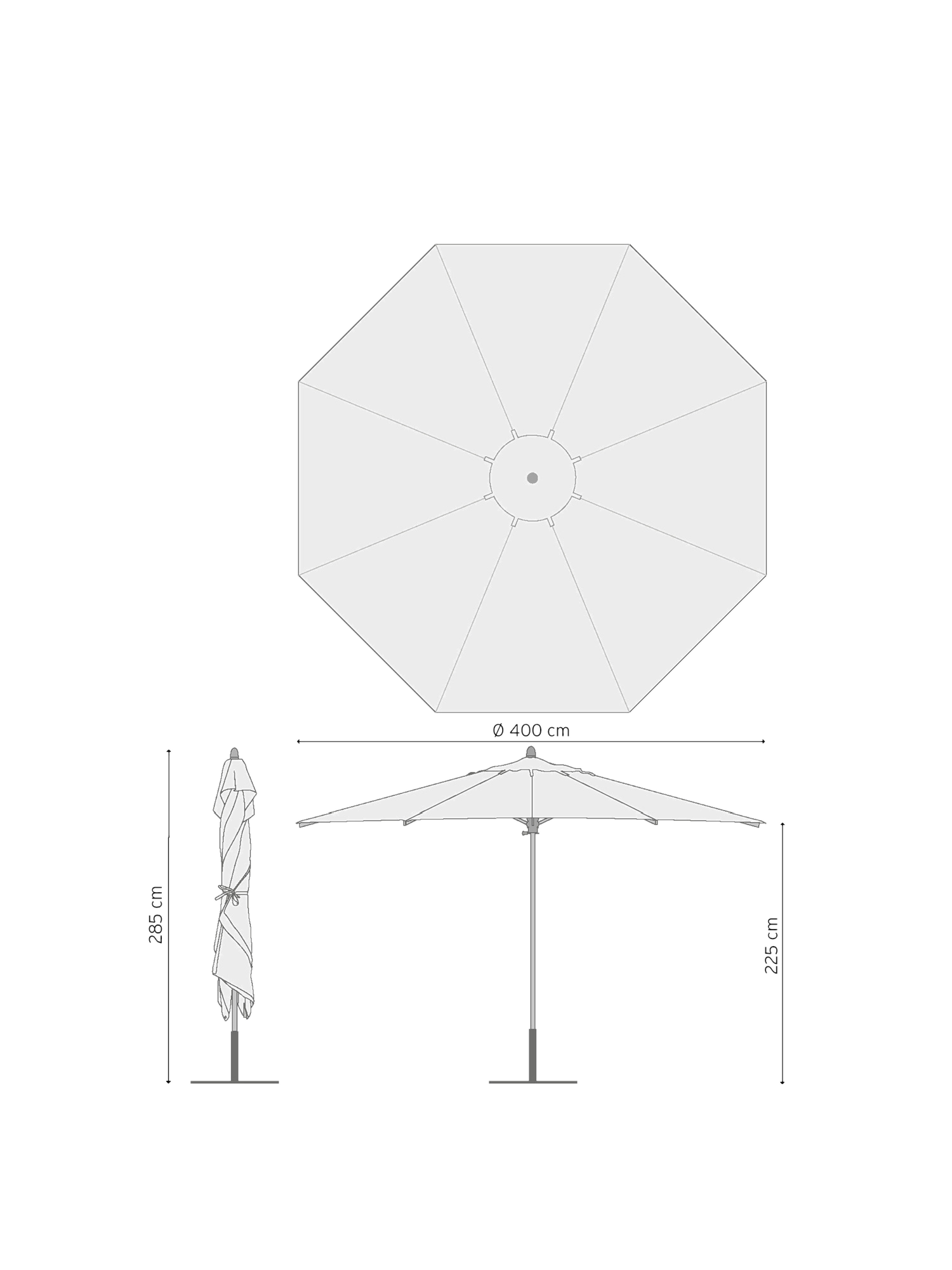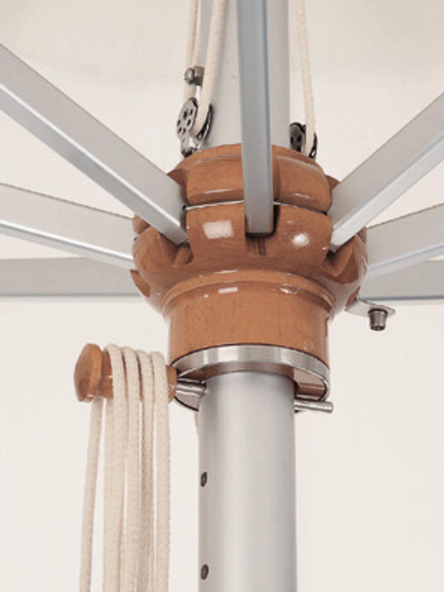 Mast, Gabel und Streben der Calabria Schirme bestehen aus eloxiertem, silberweißem Aluminium; Mastspitze, Krone und Schieber aus lackiertem Hartholz, das schlicht und fein gedrechselt ist.
