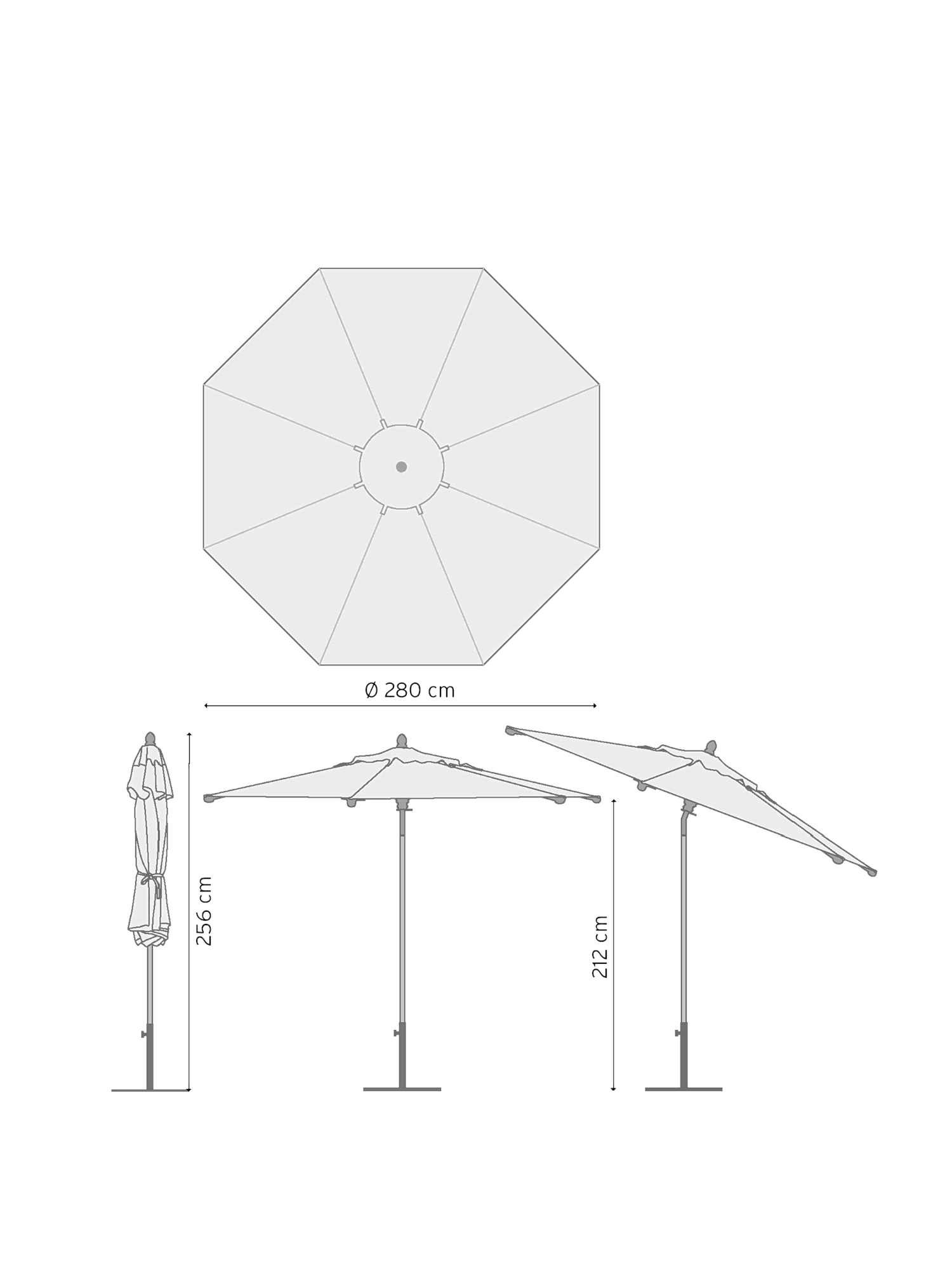 Der runde Schirm hat einen Durchmesser von 2,80 m und eignet sich besonders für kleine Sitzgruppen.