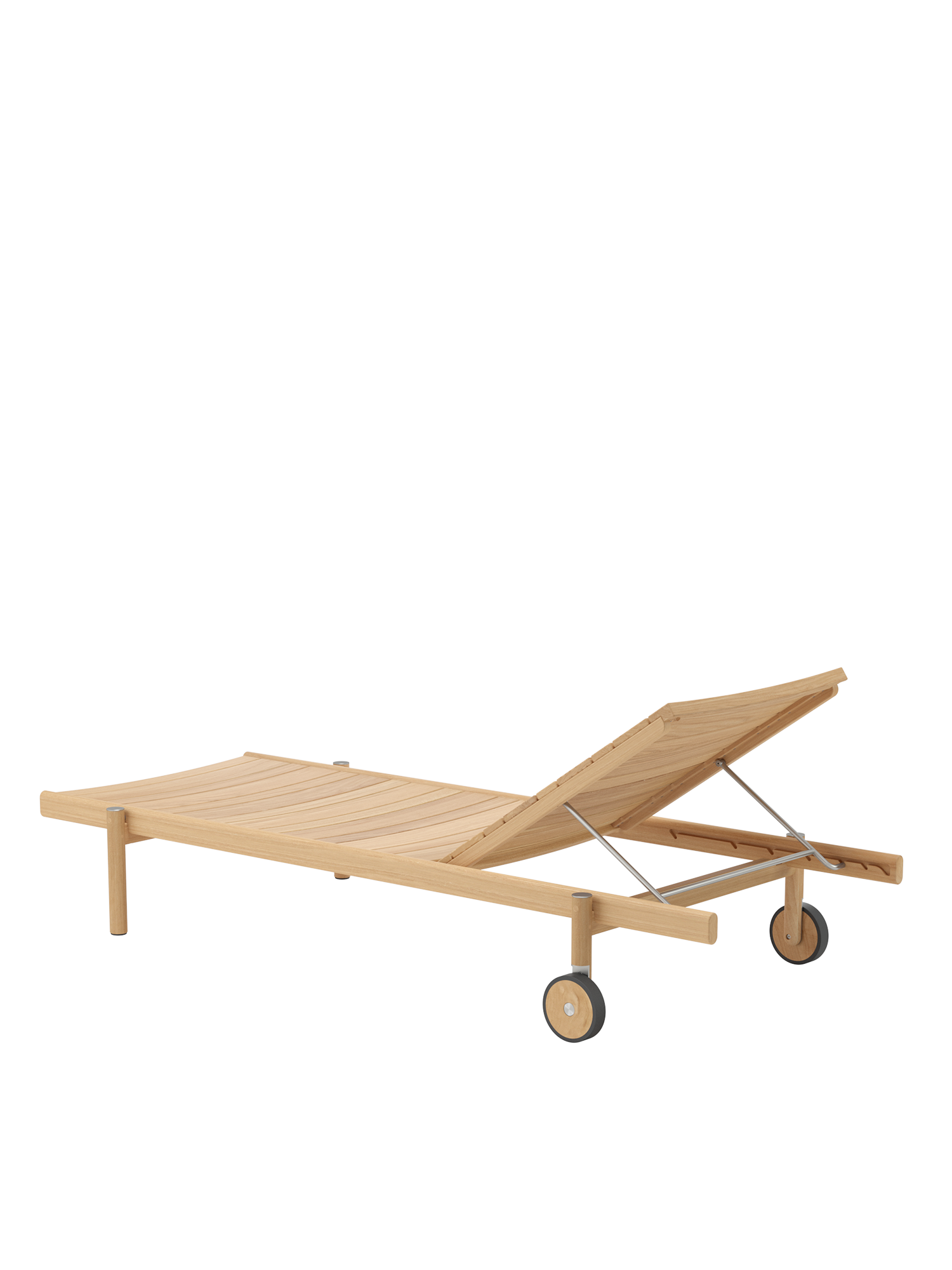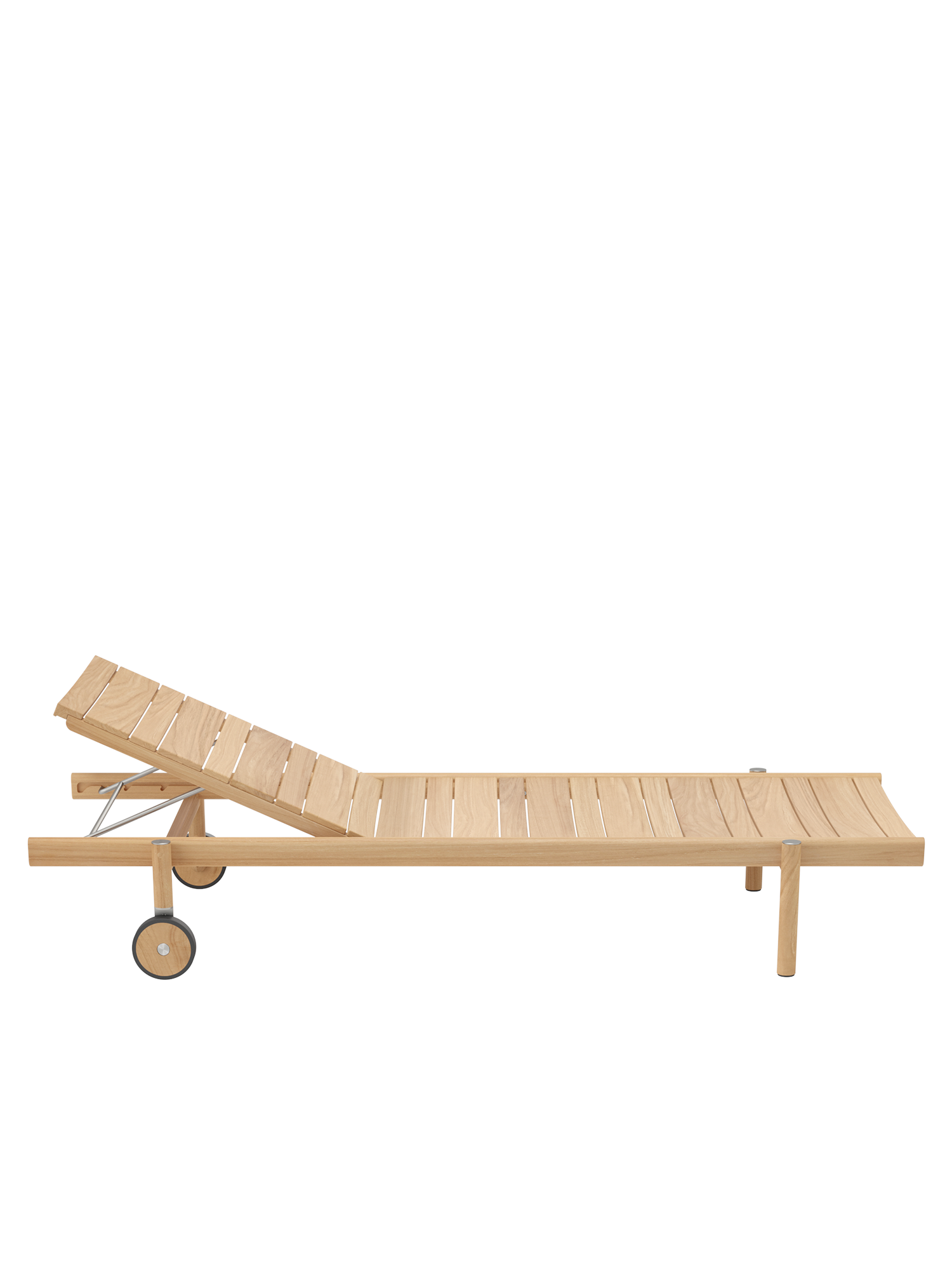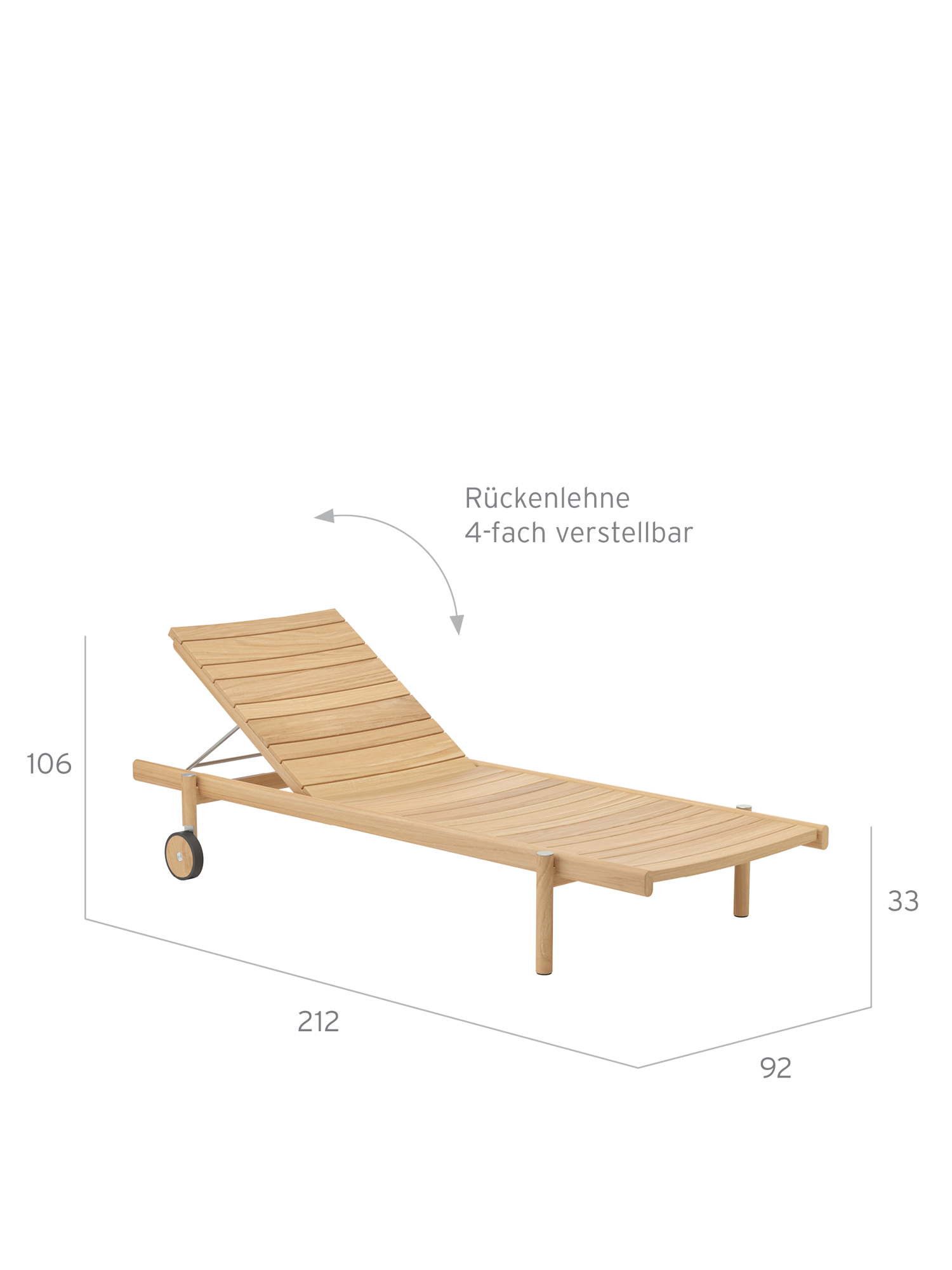 Die unterschiedlich breiten Teakleisten formen das gleichmäßige Bild einer ausgesprochen großzügigen Liegefläche. Plantagenteak in gewohnt hoher Garpa Qualität offeriert eine besonders angenehme Haptik. Das Rückenteil lässt sich vierfach verstellen.