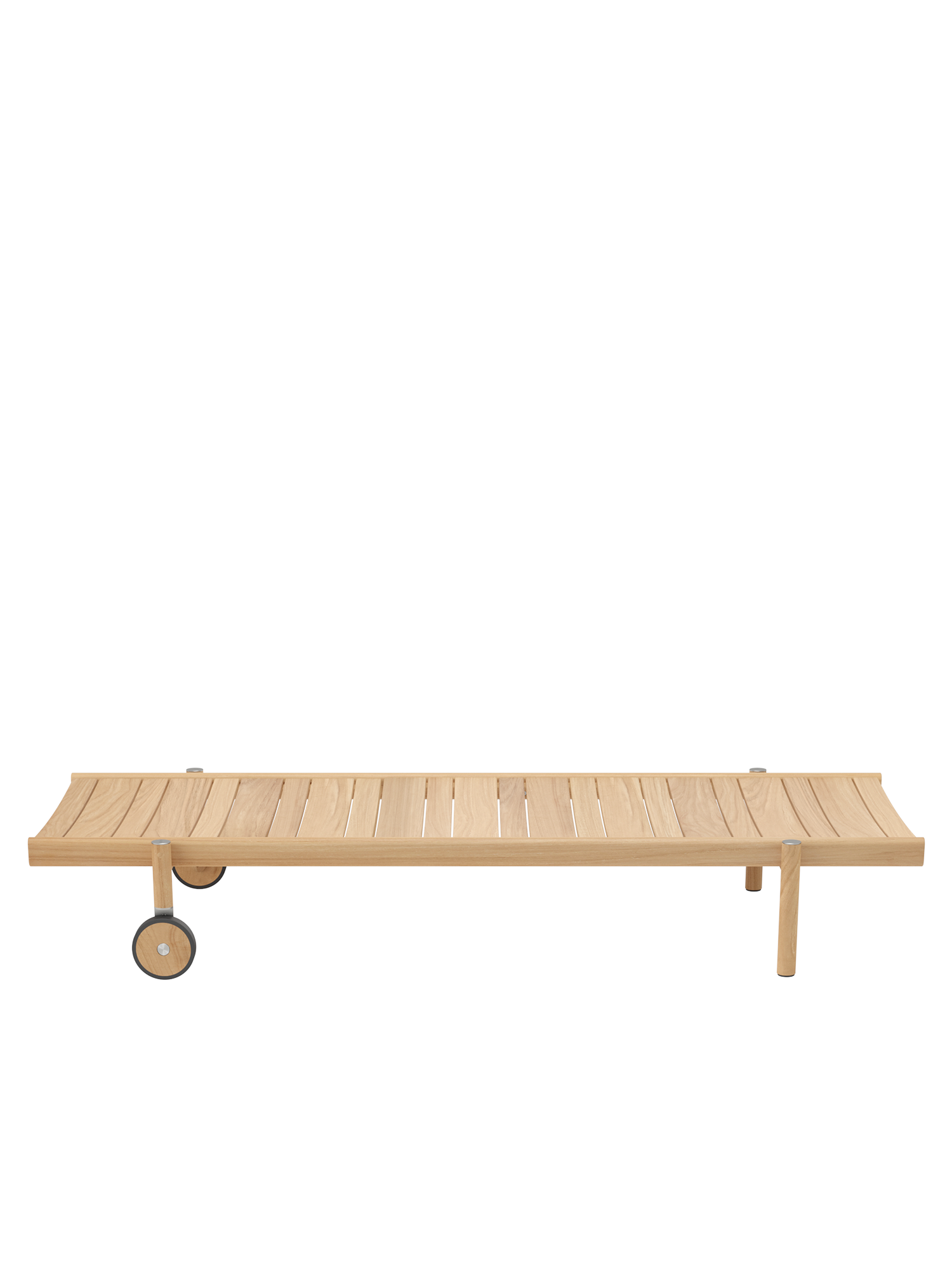 Die außen stehenden Beine aus gedrechseltem Teakholz räumen der breiten Liegefläche luftigen Überhang ein. So fügt sich das puristische Design der stapelbaren Cavo Liege in den Stil der Serie ein.