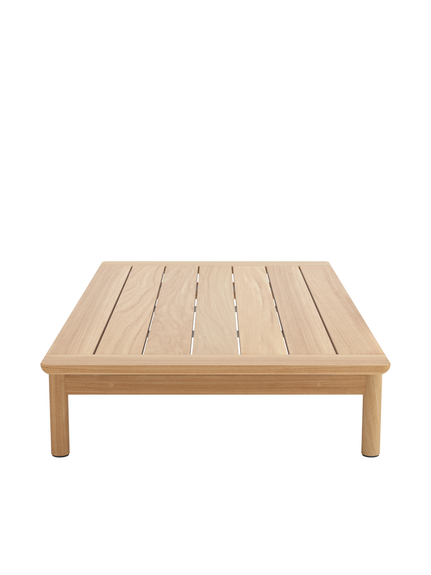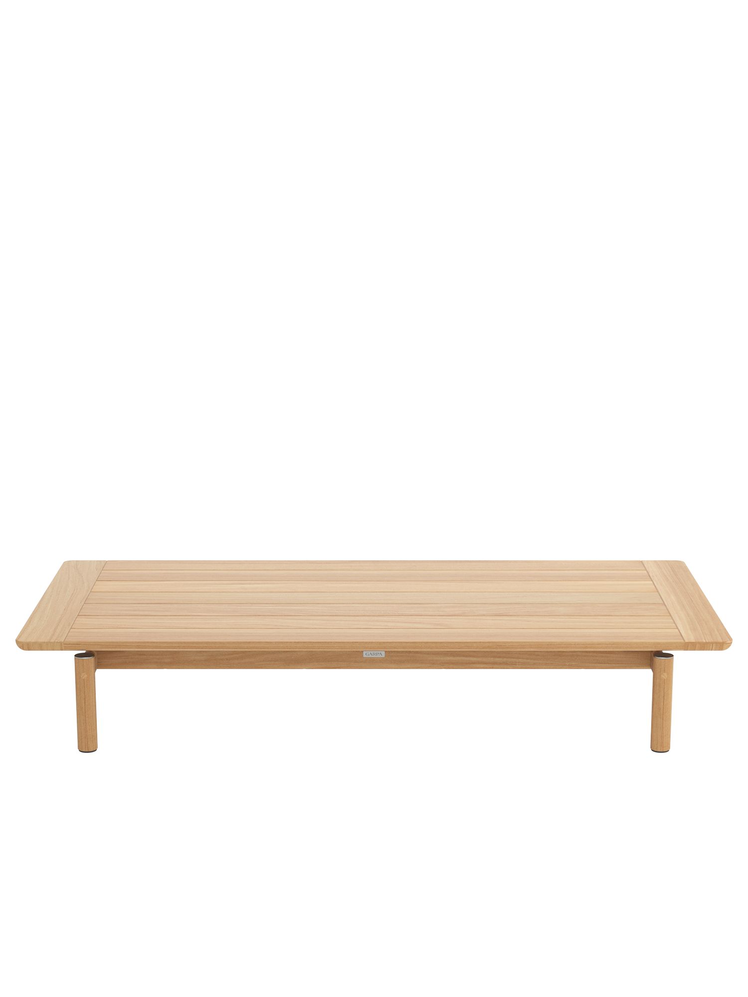Die passenden niedrigen Tische der Cavo Serie setzen eigene Akzente. Durch ihre individuelle Formgebung scheinen die Platten aus wetterfestem Plantagenteak über den Tischbeinen zu schweben. Abschlusselemente aus gebürstetem Edelstahl unterstreichen das schlichte Design.