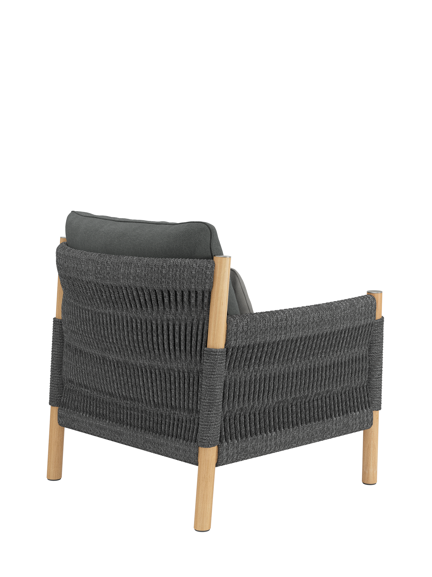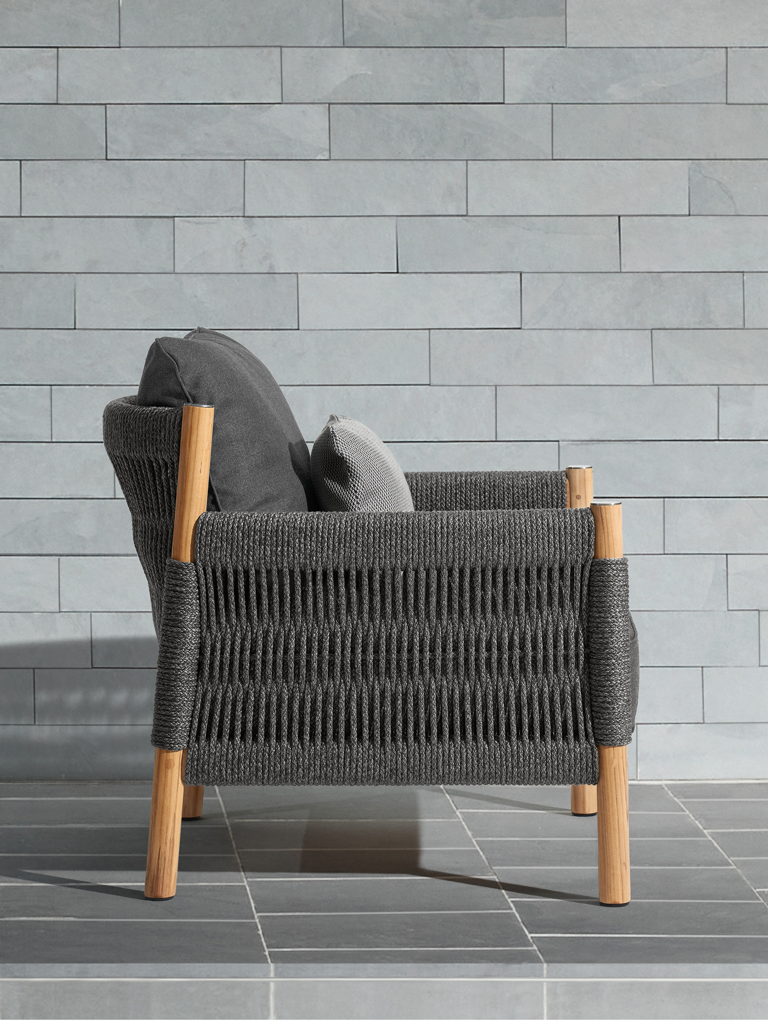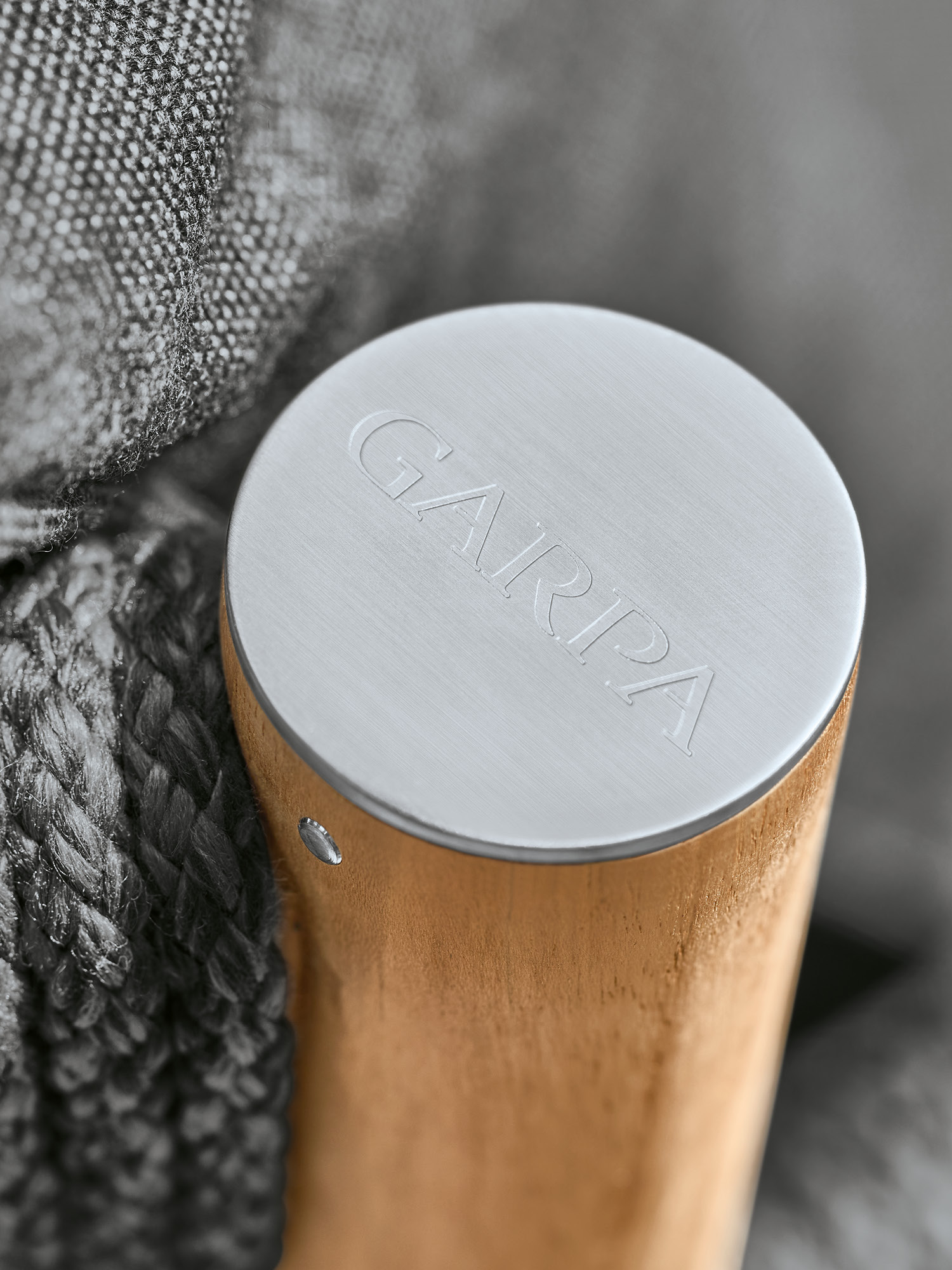 Teakholz übernimmt den klassischen Part in fein gedrechselter Gestalt. Matt gebürstete Edelstahlkappen setzen dazu schlichte Akzente. Eine wetterfeste Kordel in edlem Anthrazit, die von Hand zu einem so markanten wie anschmiegsamen Geflecht verarbeitet wird, schafft innovative Eleganz. Das hochwertige Material besteht aus Polypropylen mit einem Polyesterkern.