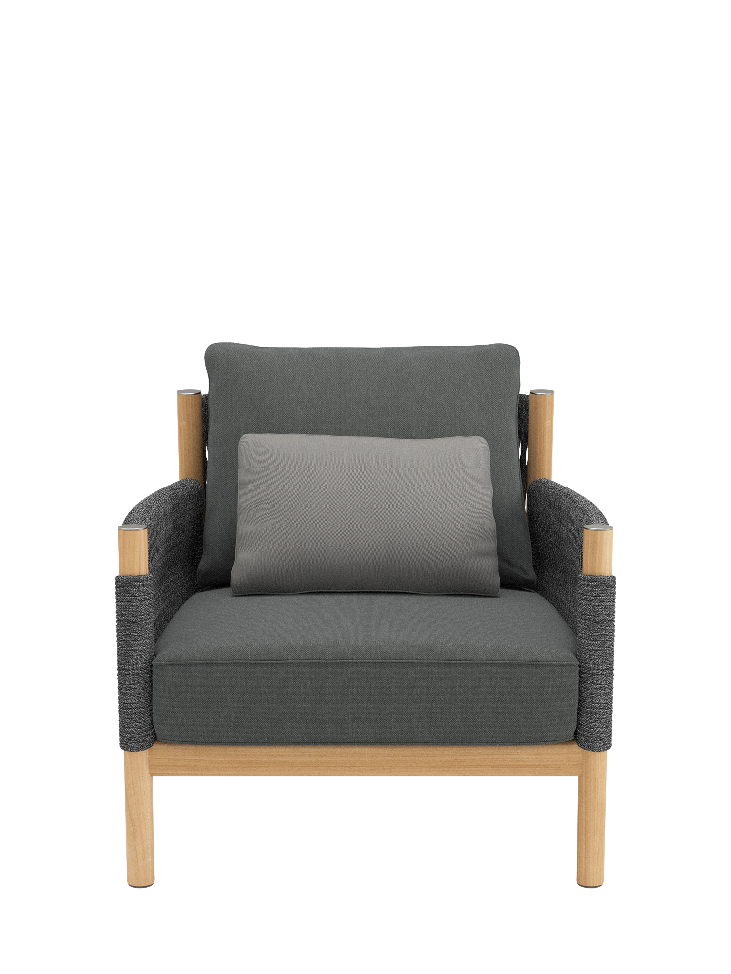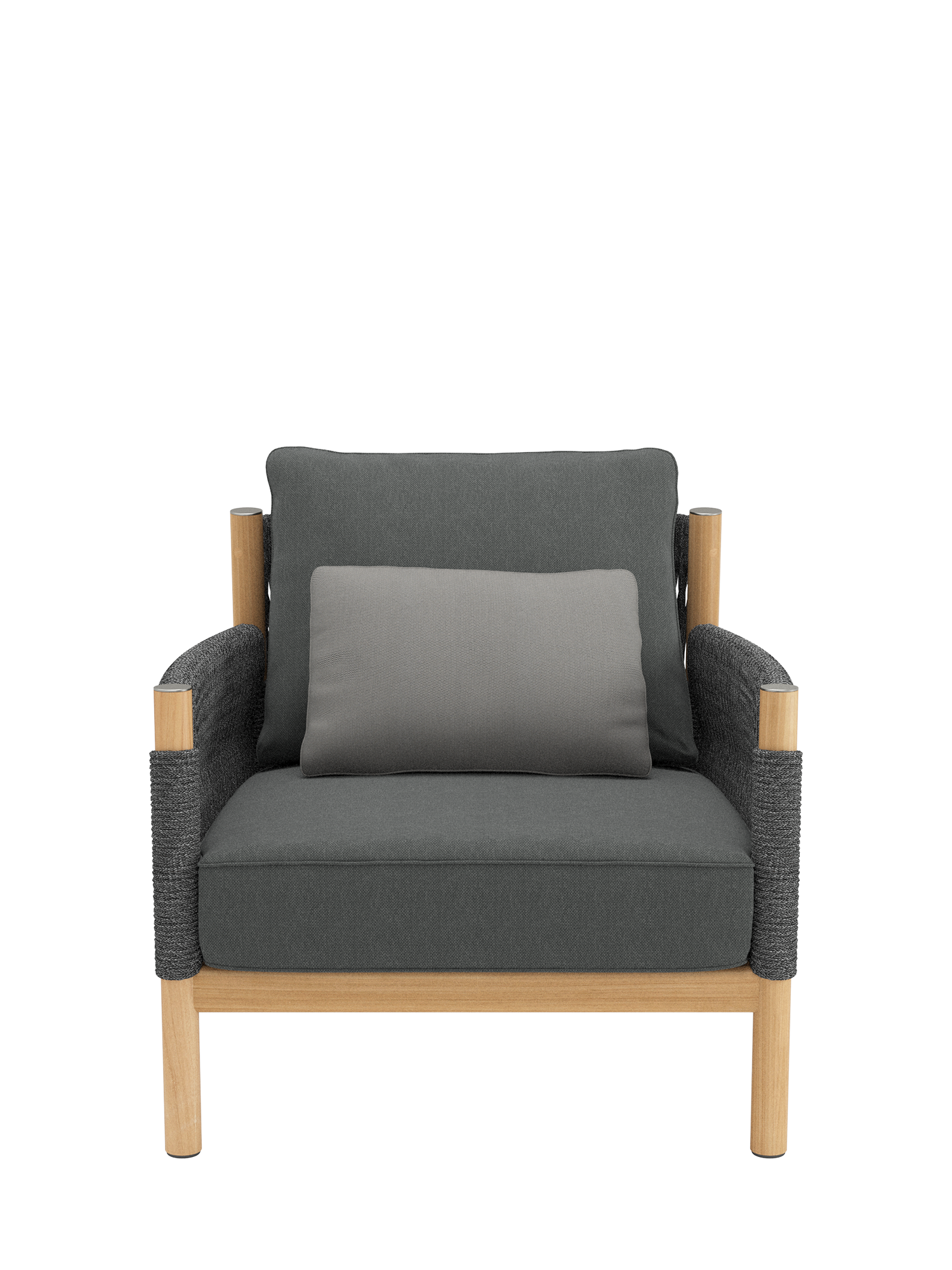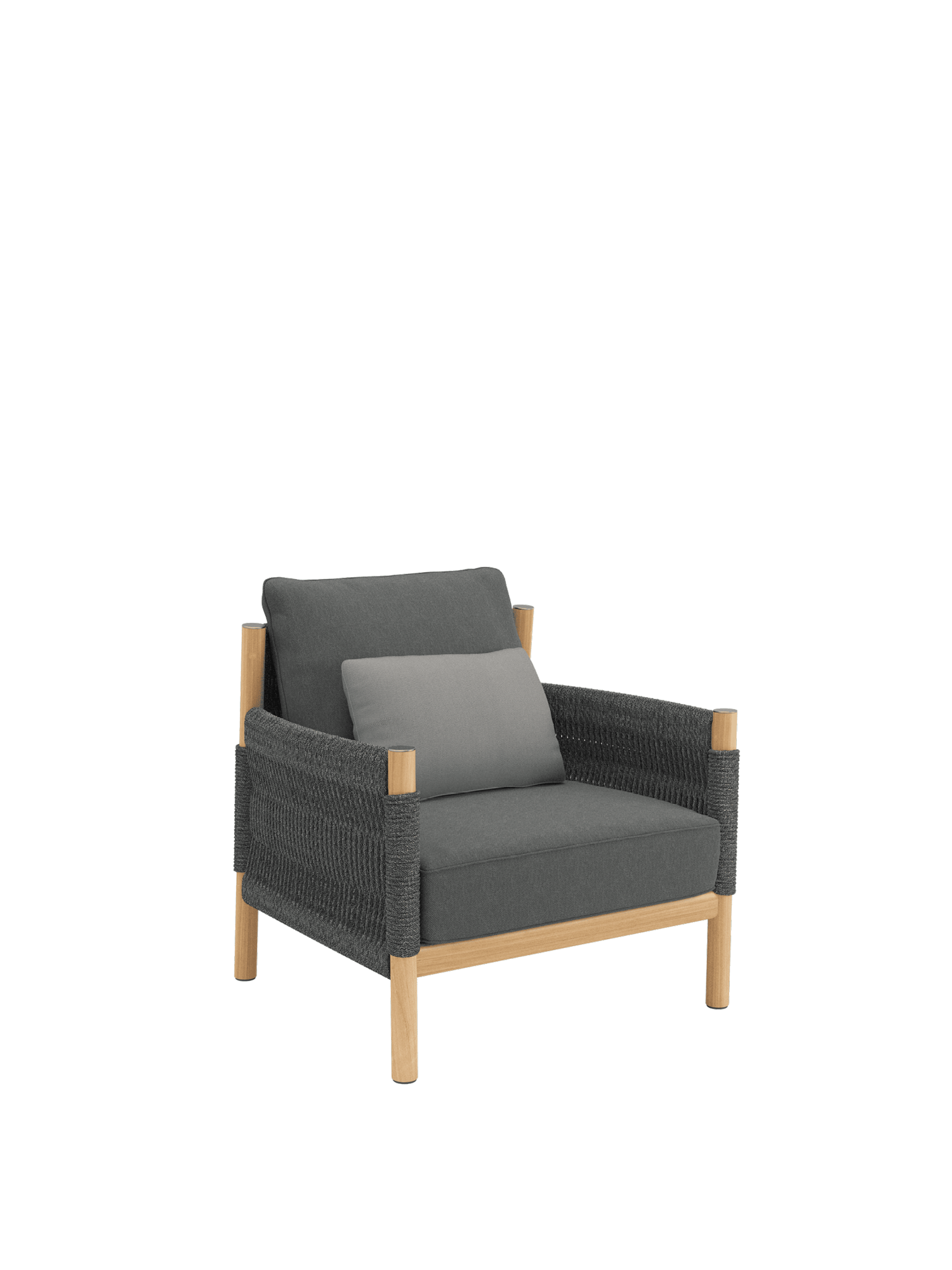 Teakholz übernimmt den klassischen Part in fein gedrechselter Gestalt. Matt gebürstete Edelstahlkappen setzen dazu schlichte Akzente. Eine wetterfeste Kordel in edlem Anthrazit, die von Hand zu einem so markanten wie anschmiegsamen Geflecht verarbeitet wird, schafft innovative Eleganz. Das hochwertige Material besteht aus Polypropylen mit einem Polyesterkern.