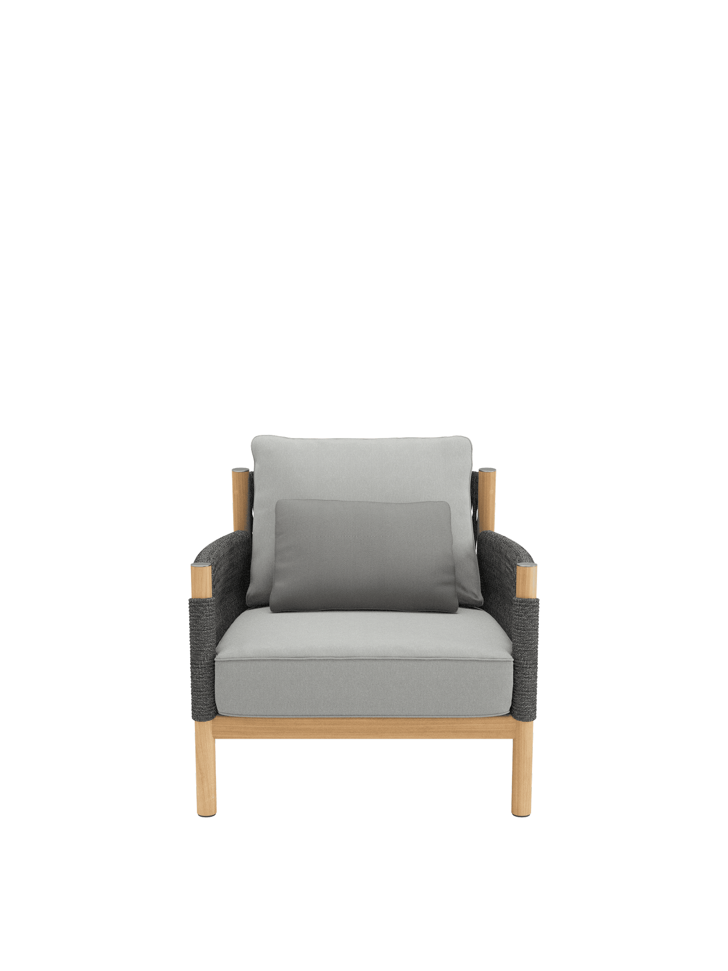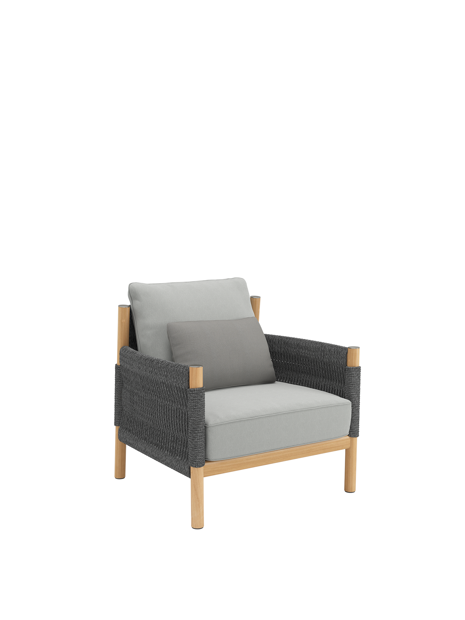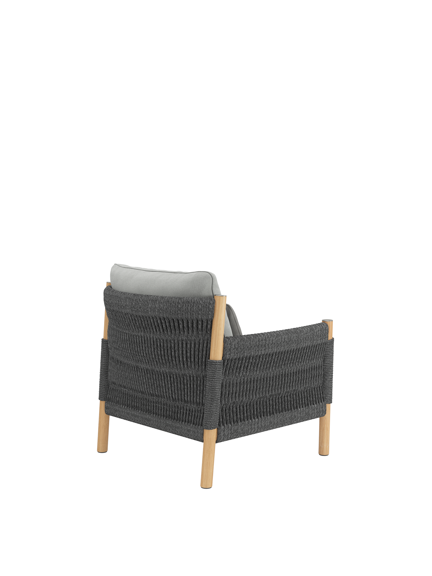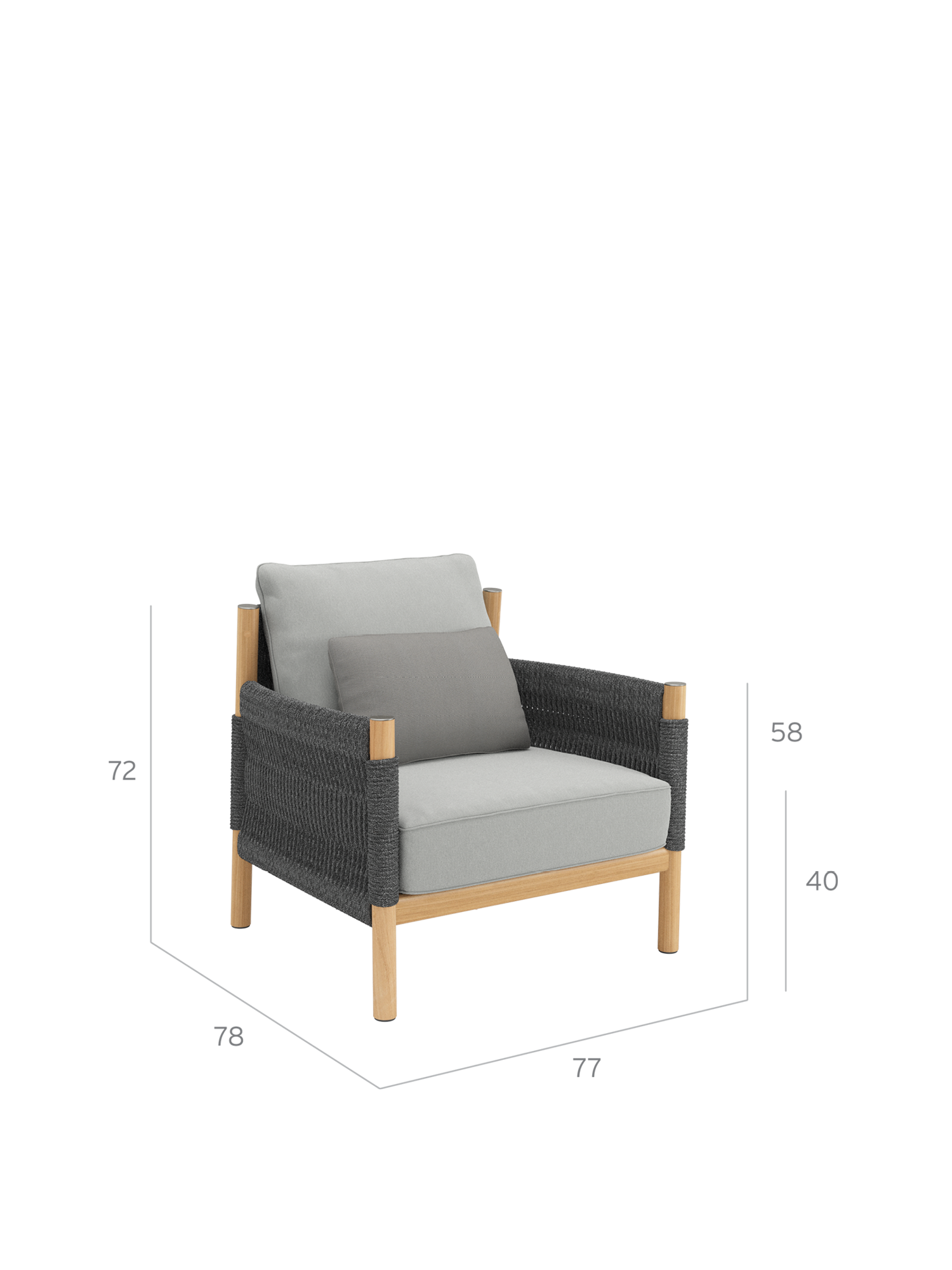 Teakholz übernimmt den klassischen Part in fein gedrechselter Gestalt. Matt gebürstete Edelstahlkappen setzen dazu schlichte Akzente. Eine wetterfeste Kordel in edlem Anthrazit, die von Hand zu einem so markanten wie anschmiegsamen Geflecht verarbeitet wird, schafft innovative Eleganz. Das hochwertige Material besteht aus Polypropylen mit einem Polyesterkern.