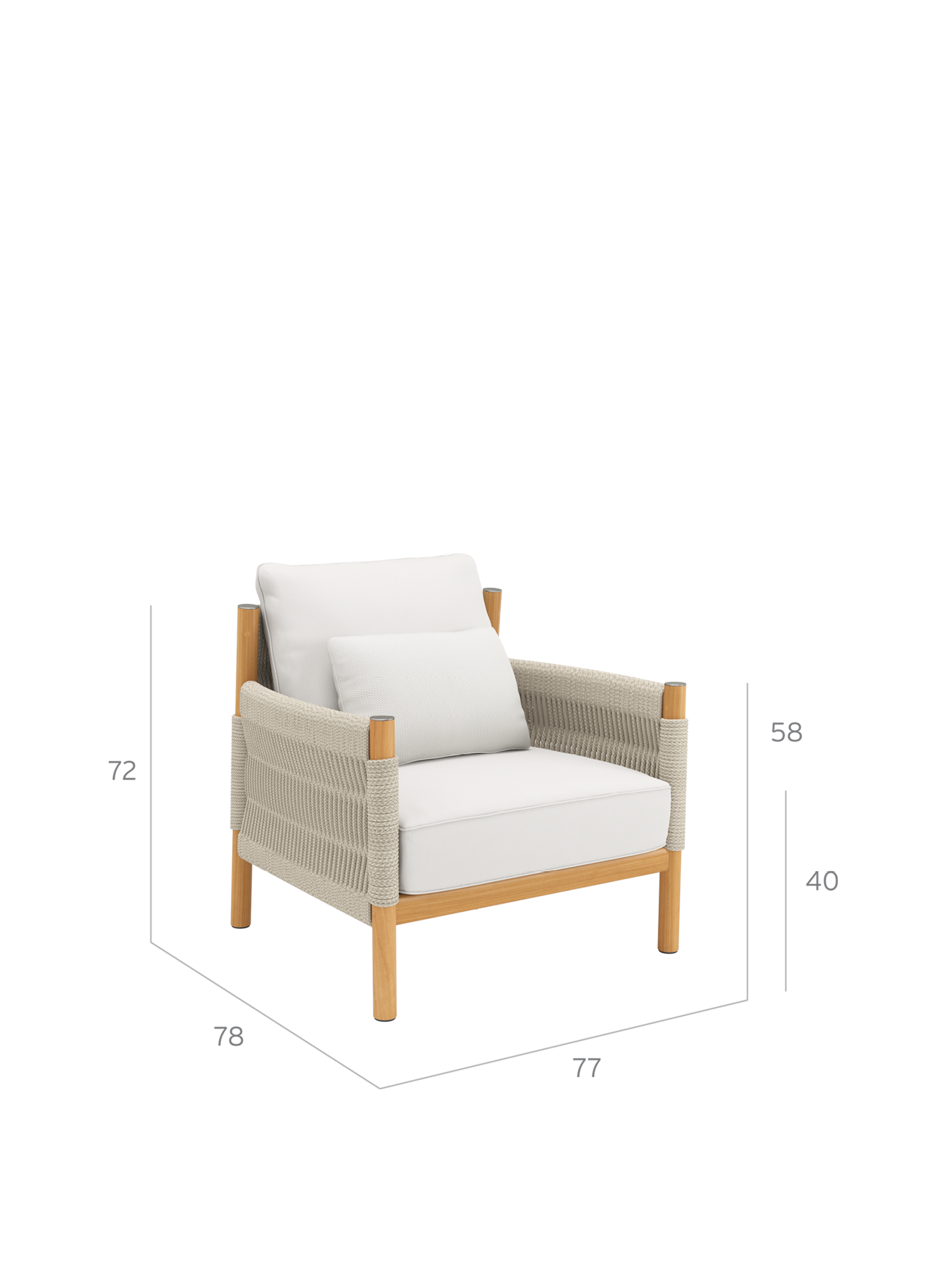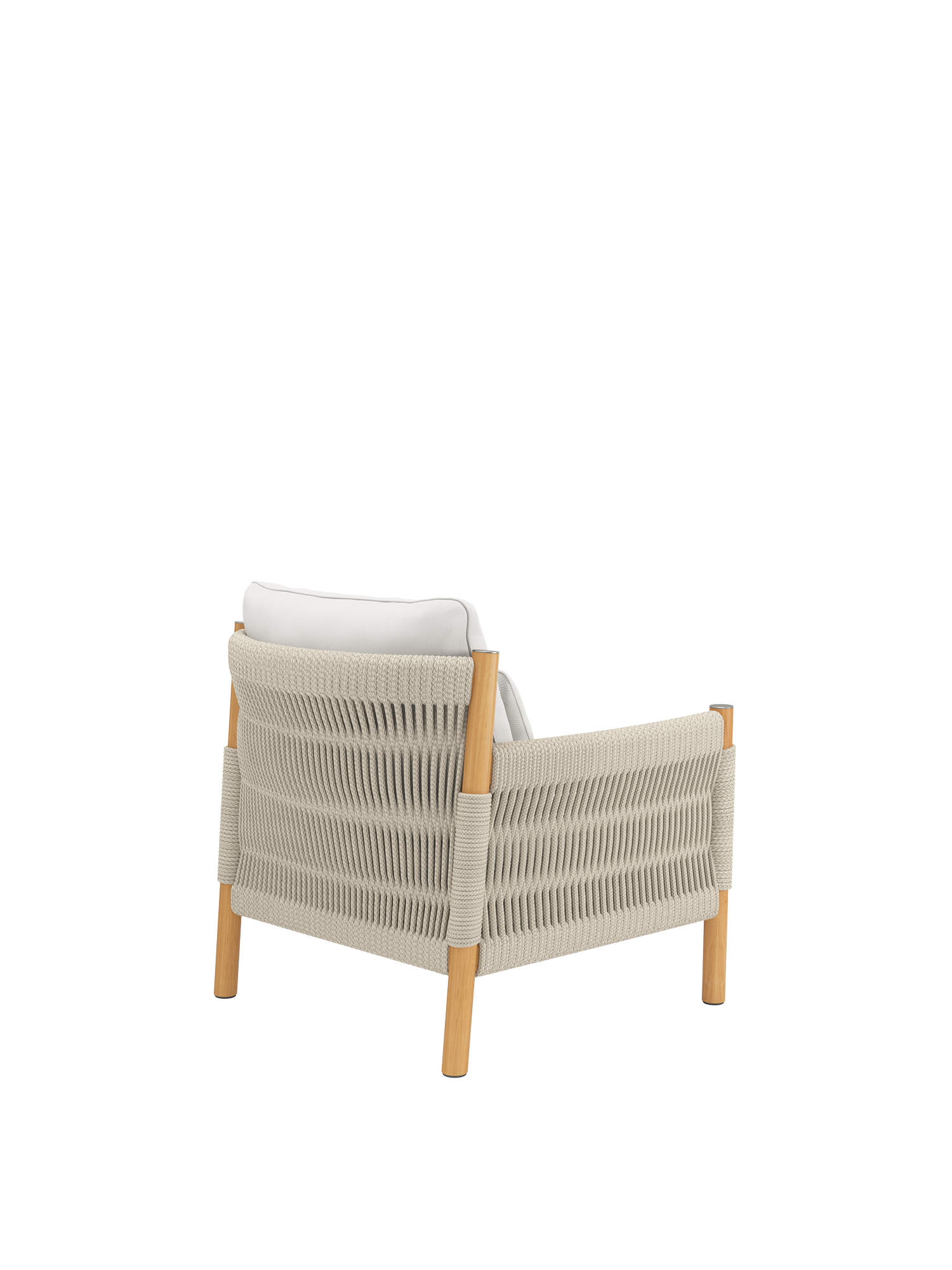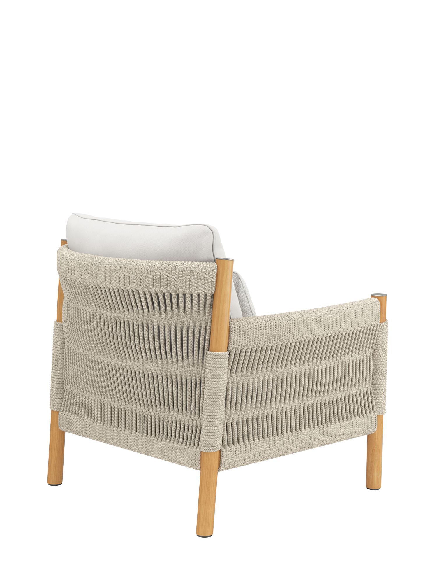 Teakholz übernimmt den klassischen Part in fein gedrechselter Gestalt. Matt gebürstete Edelstahlkappen setzen dazu schlichte Akzente. Eine wetterfeste Kordel in edlem Beige, die von Hand zu einem so markanten wie anschmiegsamen Geflecht verarbeitet wird, schafft innovative Eleganz. Das hochwertige Material besteht aus Polypropylen mit einem Polyesterkern.