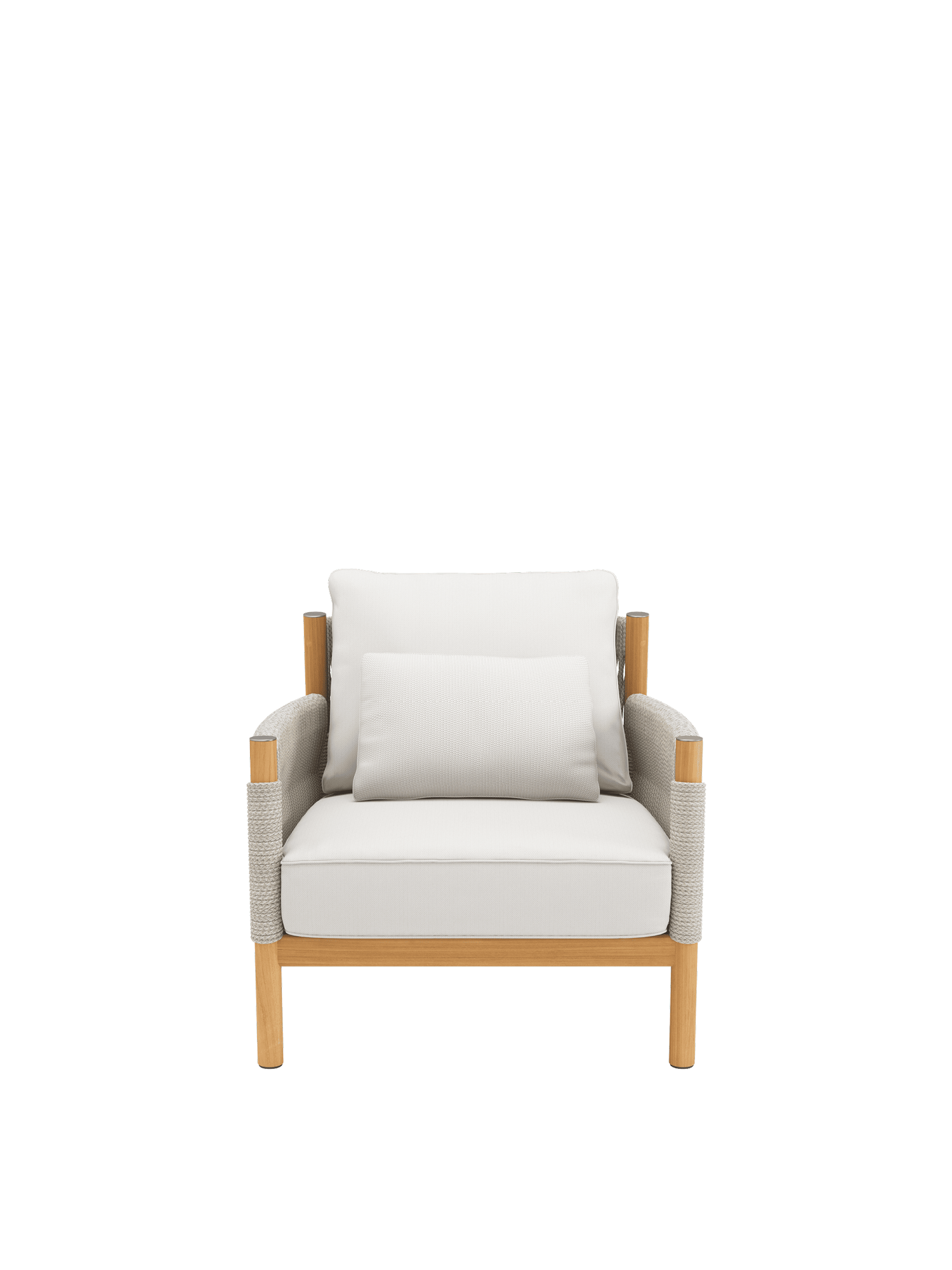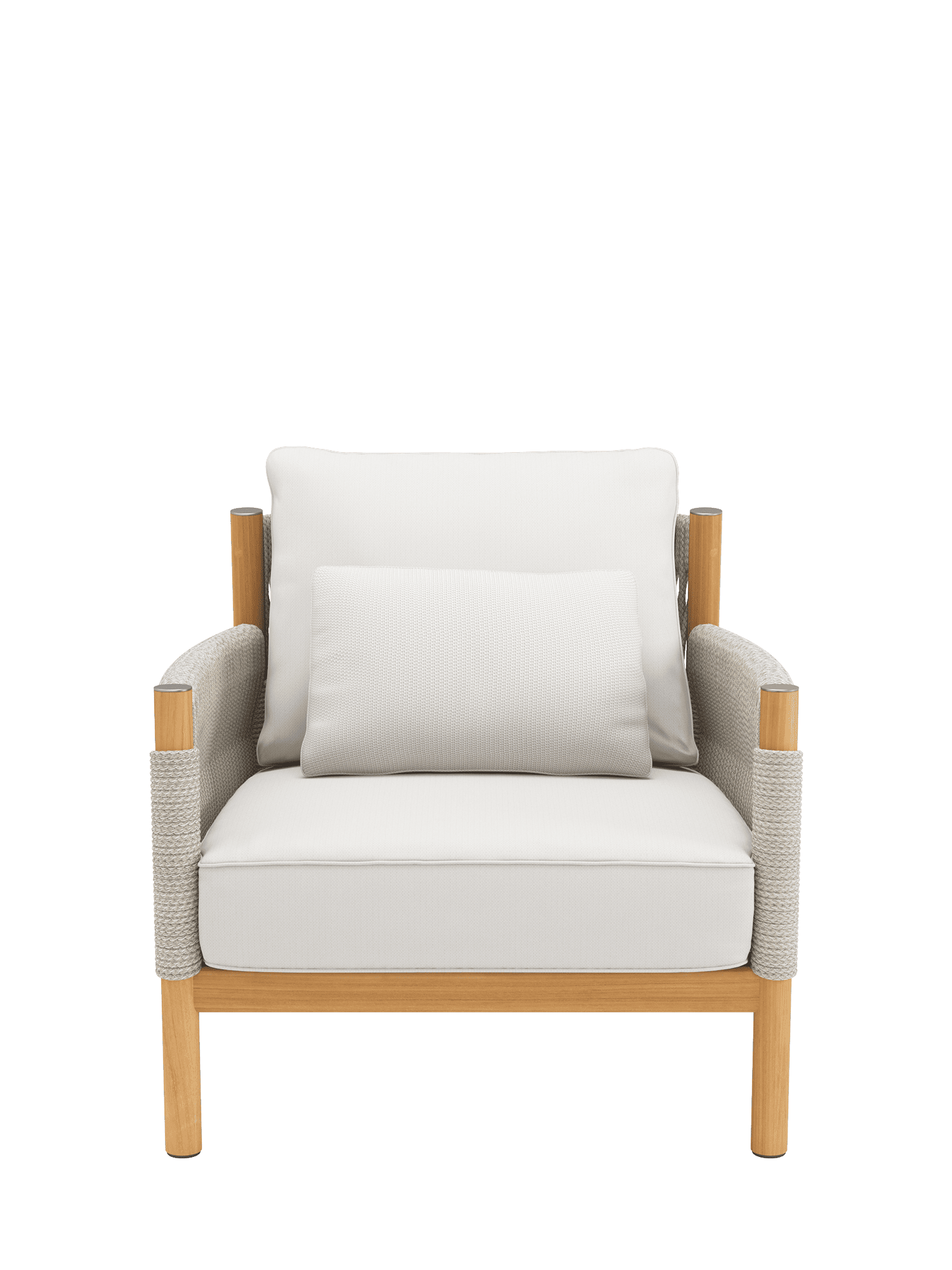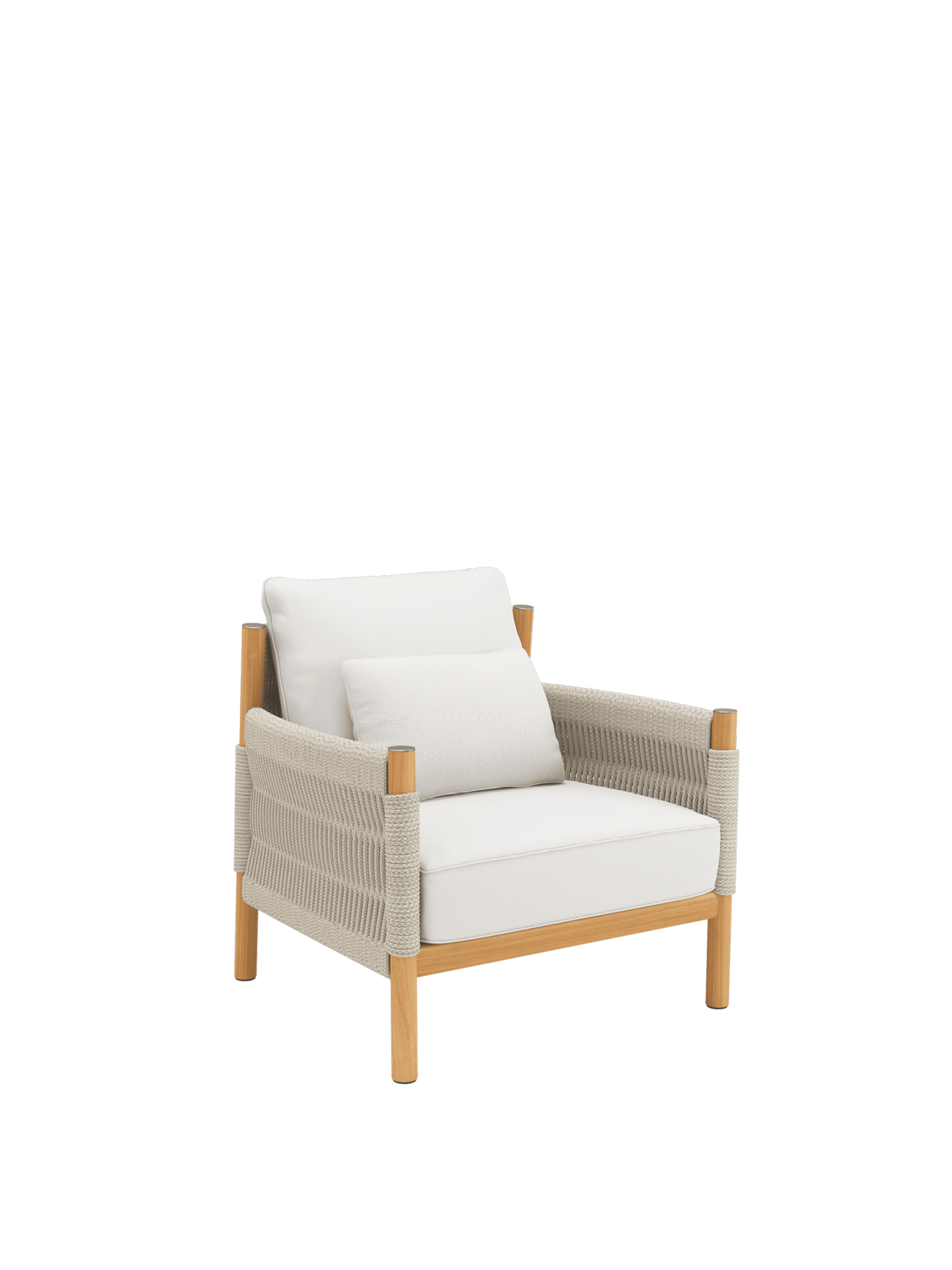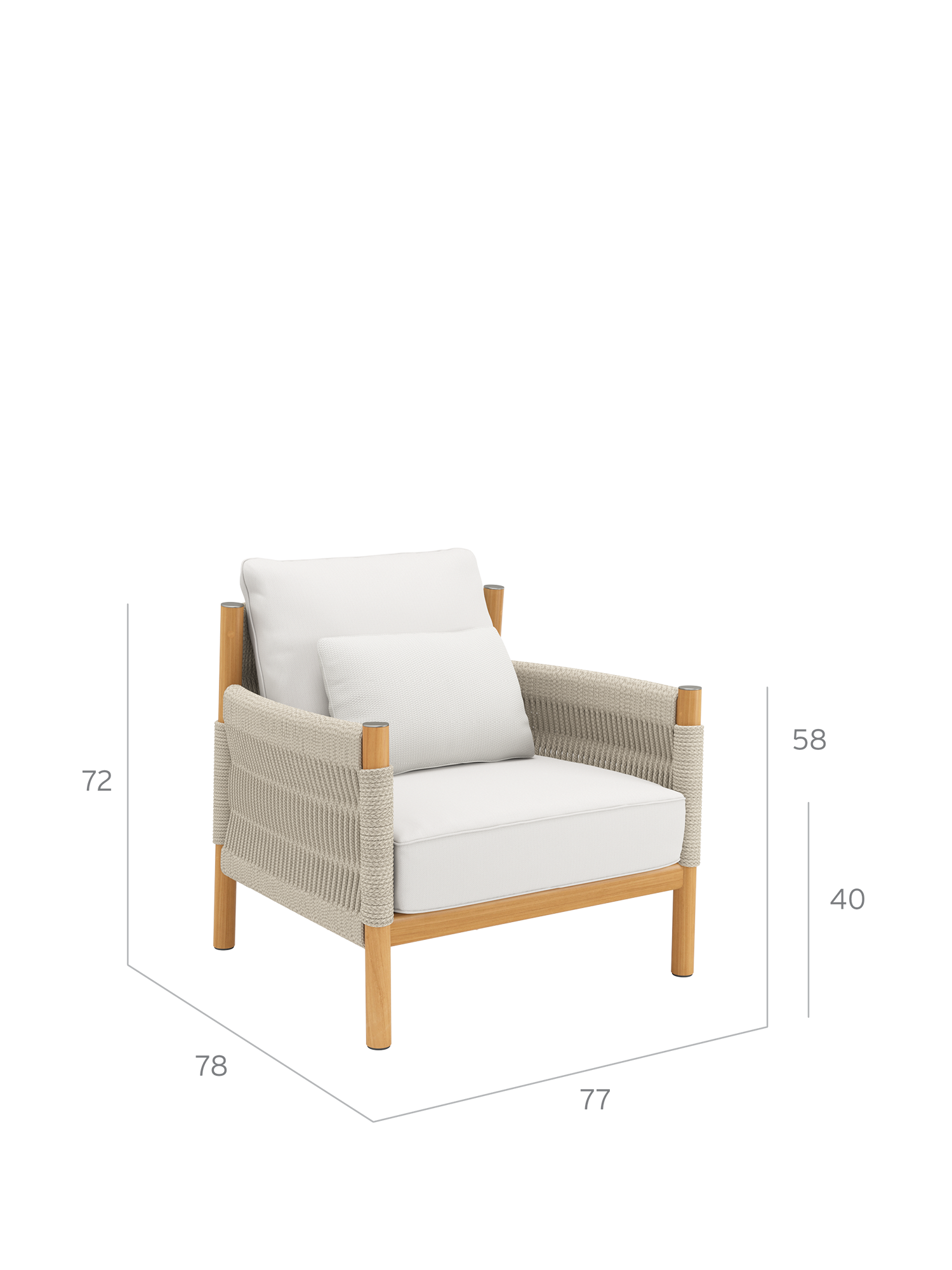 Teakholz übernimmt den klassischen Part in fein gedrechselter Gestalt. Matt gebürstete Edelstahlkappen setzen dazu schlichte Akzente. Eine wetterfeste Kordel in edlem Beige, die von Hand zu einem so markanten wie anschmiegsamen Geflecht verarbeitet wird, schafft innovative Eleganz. Das hochwertige Material besteht aus Polypropylen mit einem Polyesterkern.