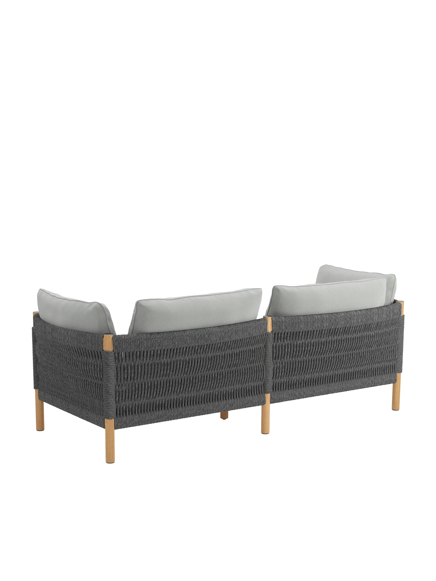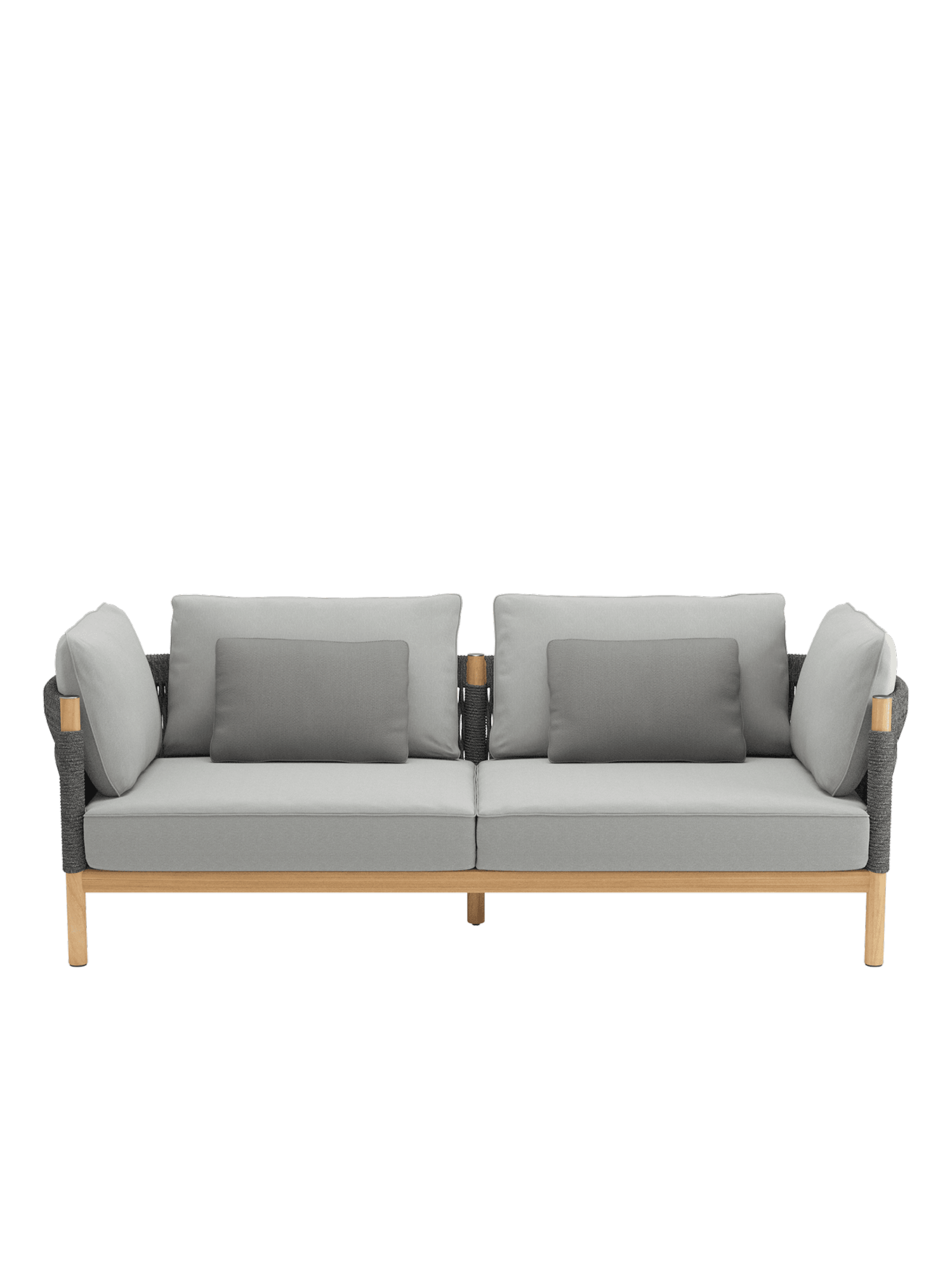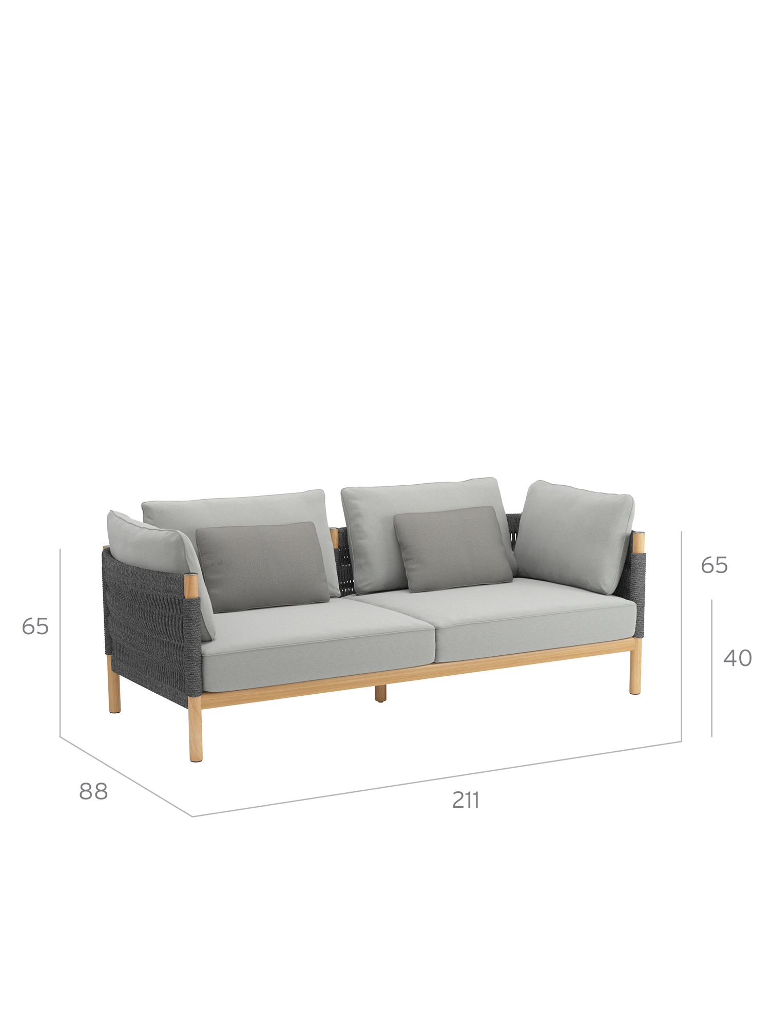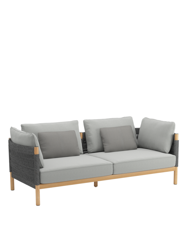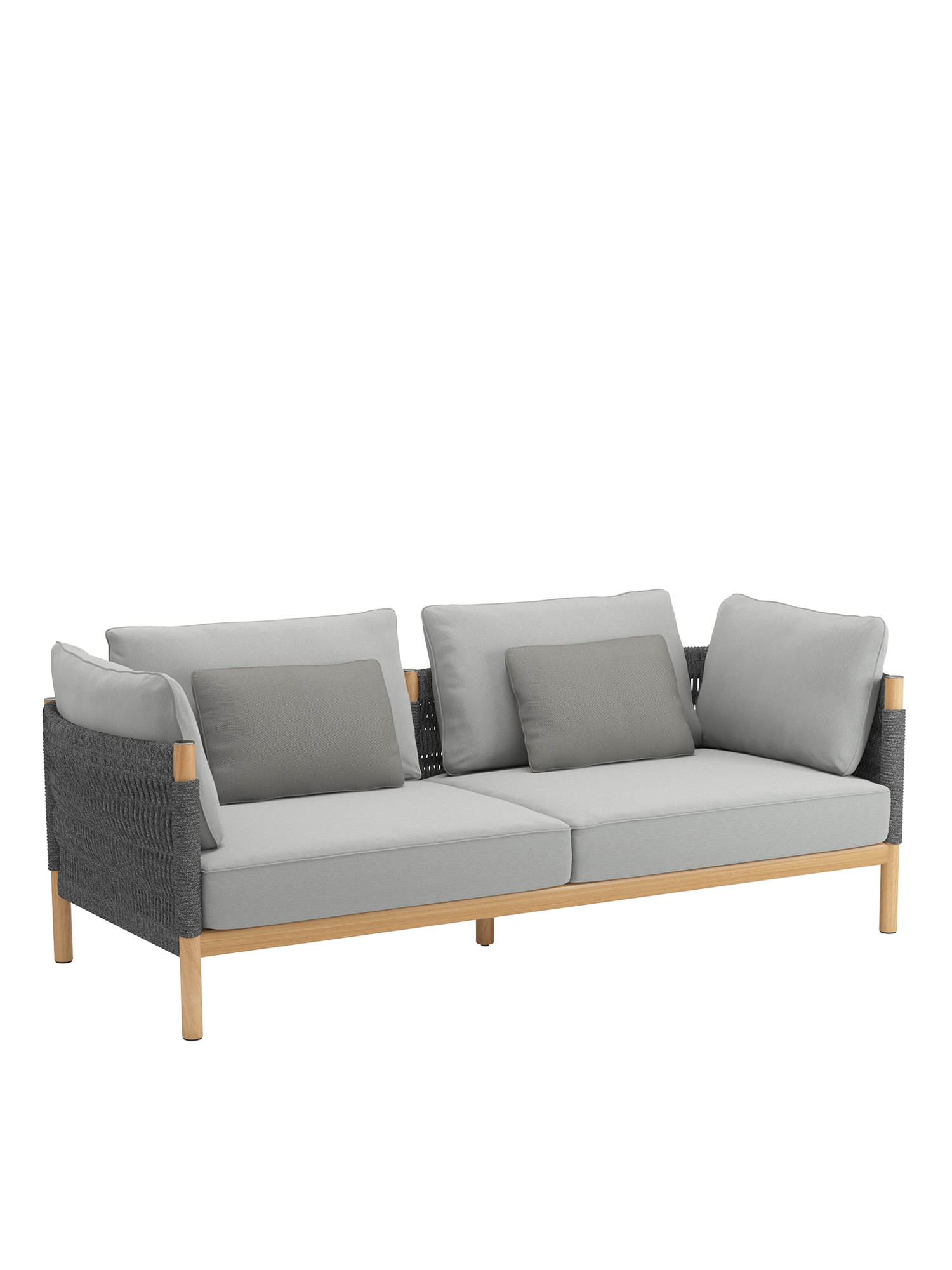 Teakholz übernimmt den klassischen Part in fein gedrechselter Gestalt. Matt gebürstete Edelstahlkappen setzen dazu schlichte Akzente. Eine wetterfeste Kordel in edlem Anthrazit, die von Hand zu einem so markanten wie anschmiegsamen Geflecht verarbeitet wird, schafft innovative Eleganz. Das hochwertige Material besteht aus Polypropylen mit einem Polyesterkern.