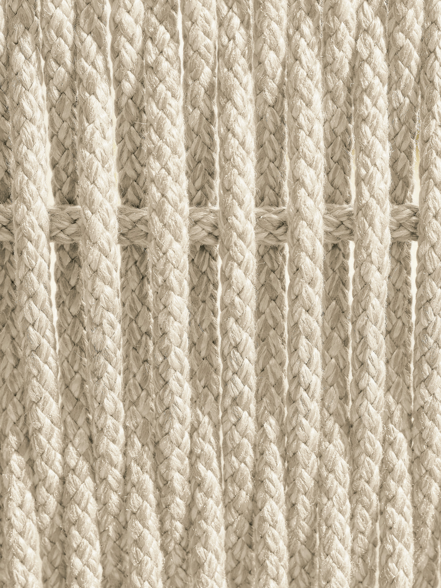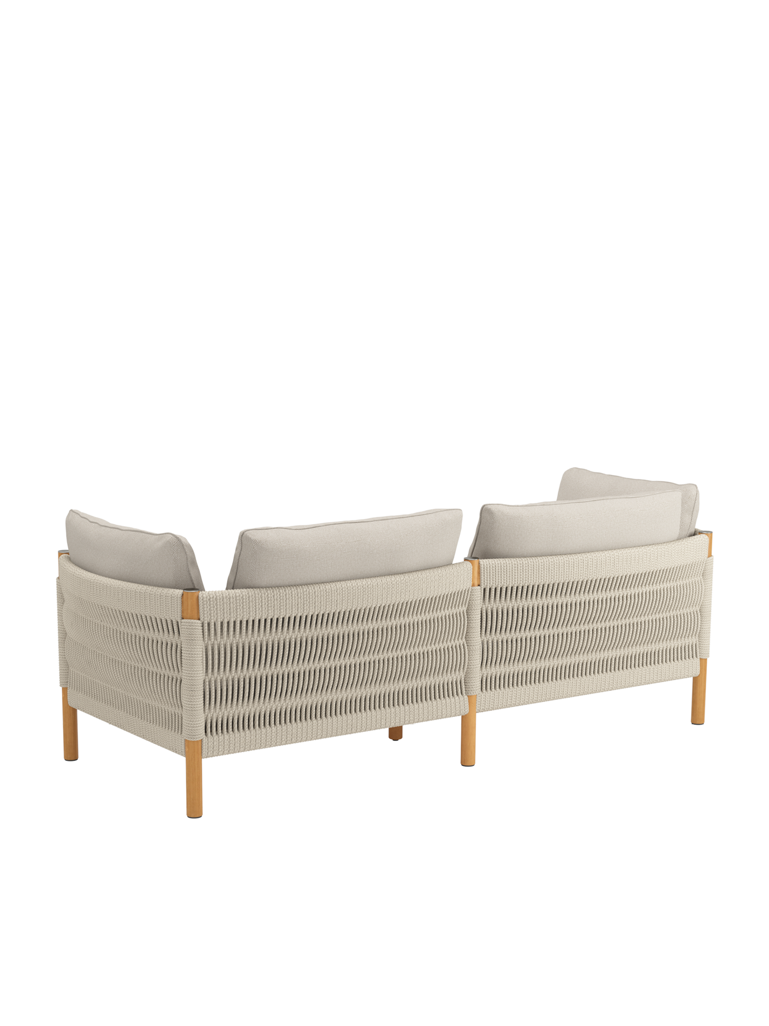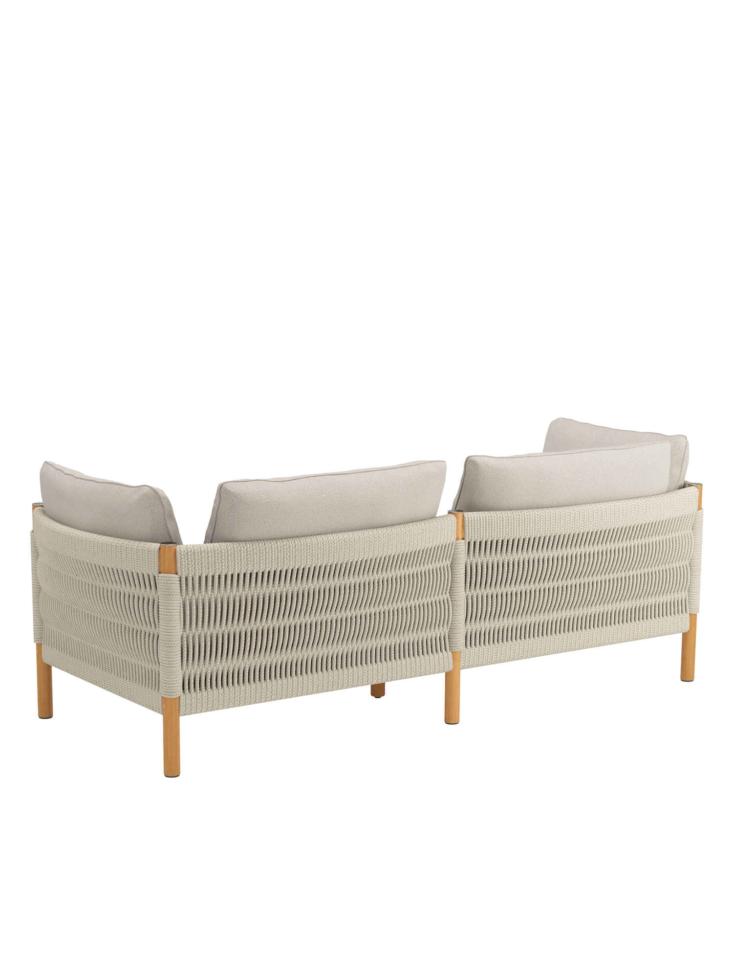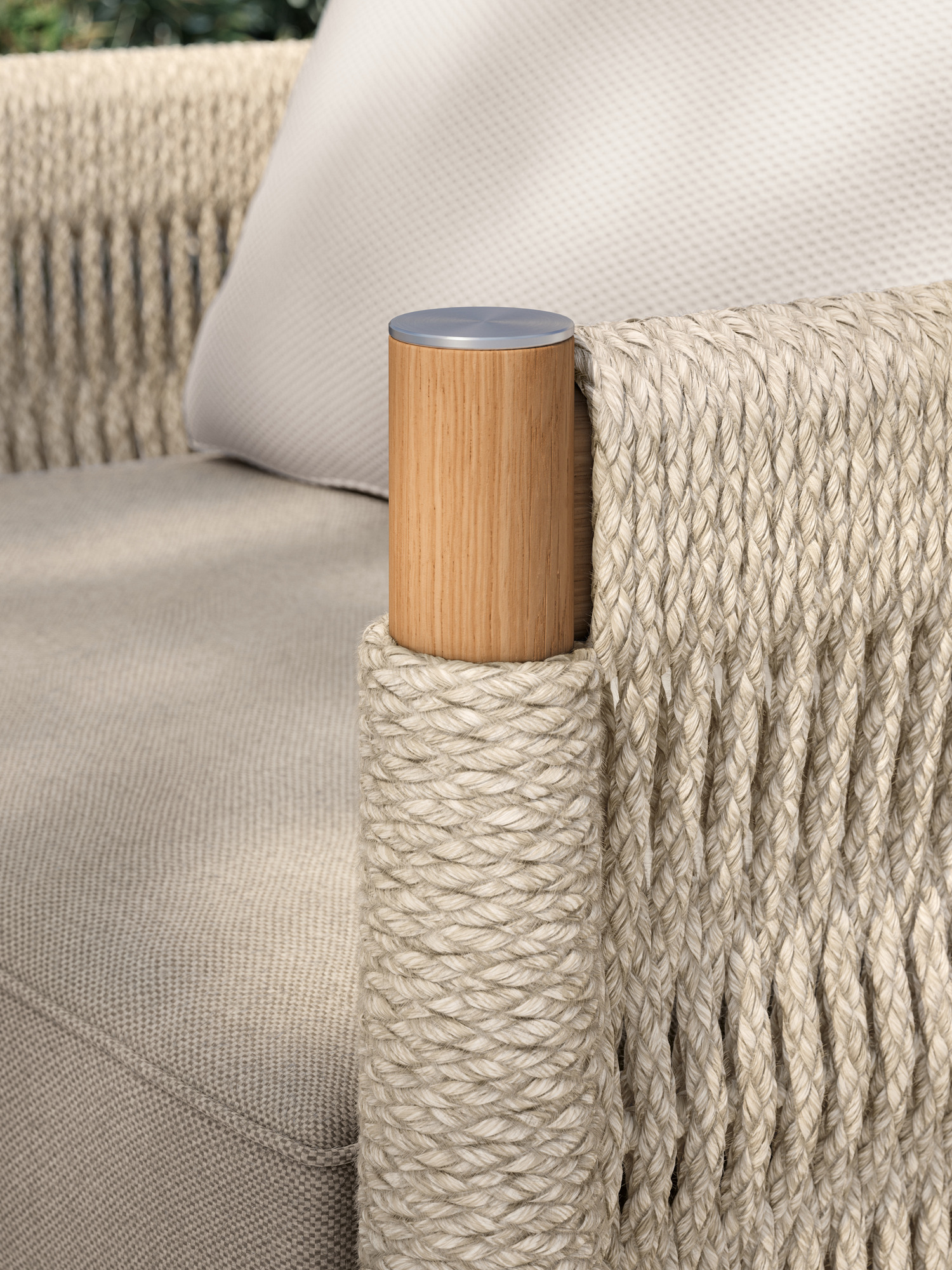 Teakholz übernimmt den klassischen Part in fein gedrechselter Gestalt. Matt gebürstete Edelstahlkappen setzen dazu schlichte Akzente. Eine wetterfeste Kordel in edlem Beige, die von Hand zu einem so markanten wie anschmiegsamen Geflecht verarbeitet wird, schafft innovative Eleganz. Das hochwertige Material besteht aus Polypropylen mit einem Polyesterkern.