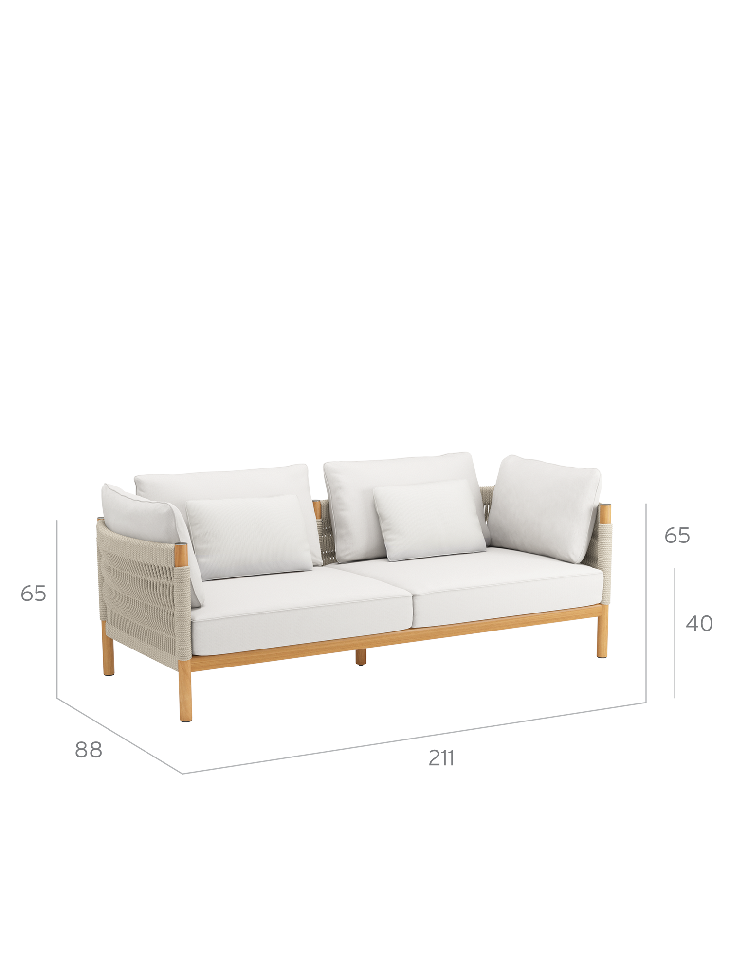Teakholz übernimmt den klassischen Part in fein gedrechselter Gestalt. Matt gebürstete Edelstahlkappen setzen dazu schlichte Akzente. Eine wetterfeste Kordel in edlem Beige, die von Hand zu einem so markanten wie anschmiegsamen Geflecht verarbeitet wird, schafft innovative Eleganz. Das hochwertige Material besteht aus Polypropylen mit einem Polyesterkern.