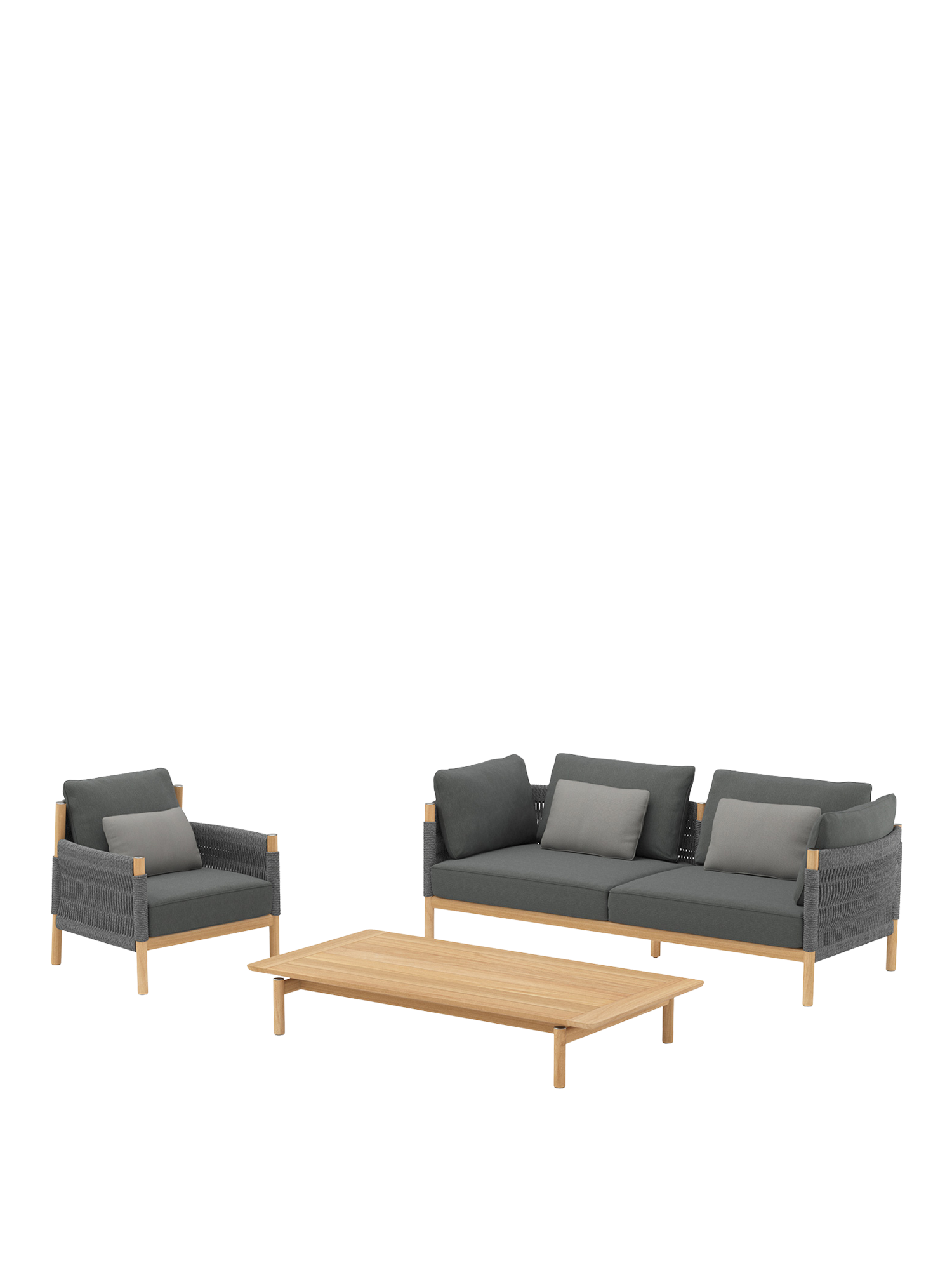 Das Cavo Lounge Set hat ein markantes Merkmal – die wetterfeste und von Hand aufgeflochtene Kordel der Polstermöbel, die mit hochwertigem, von Edelstahl akzentuiertem Teakholz harmoniert. Gemeinsam mit dem Couchtisch werden Sessel und Sofa zum individuellen Rückzugsort, der maximalen Komfort im Garten oder auf der Terrasse verspricht.