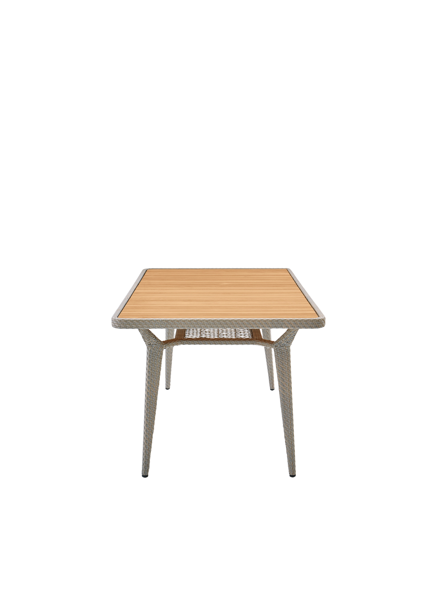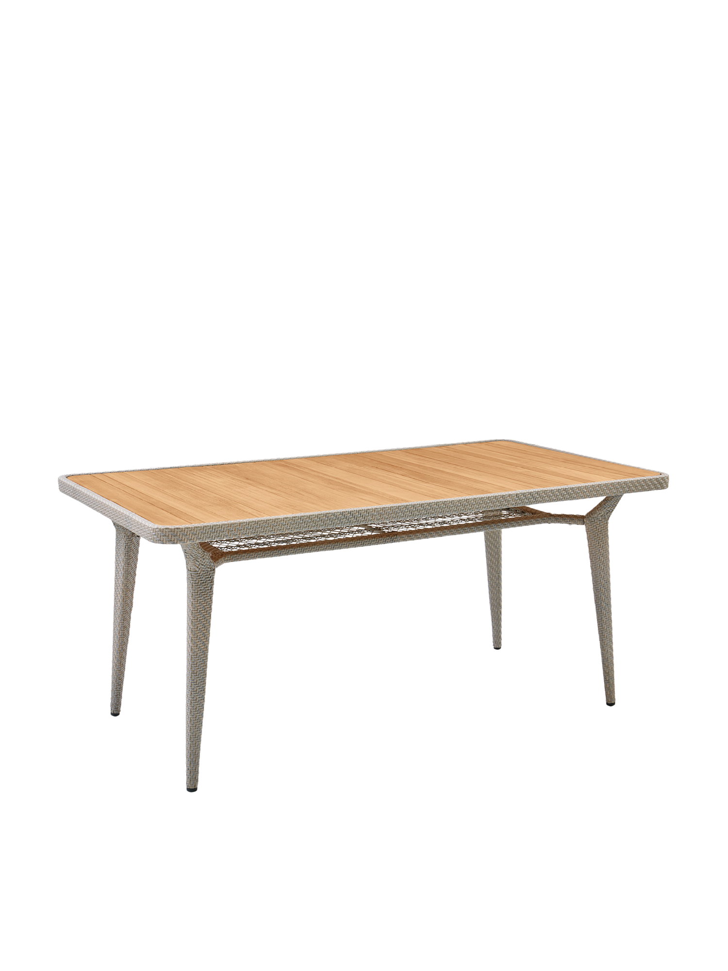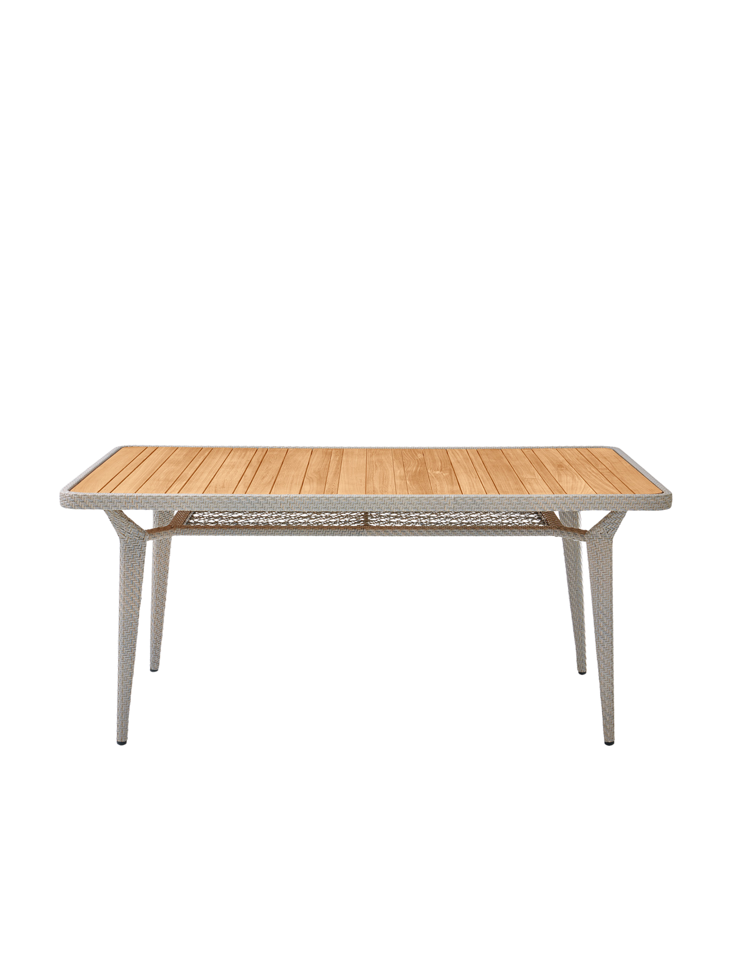 Das Geflechtmuster der Rahmen der Charleston Möbel wiederholt sich an den runden und eckigen Tischen der Serie, die es wahlweise mit Oberflächen aus hochwertigem Teakholz oder strapazierfähiger, frostfester Keramik gibt. Diese Materialien korrespondieren farblich perfekt mit den Nuancen des Geflechts. Eine geflochtene Ablage unter der Tischplatte ist ein ebenso praktisches wie dekoratives Detail.