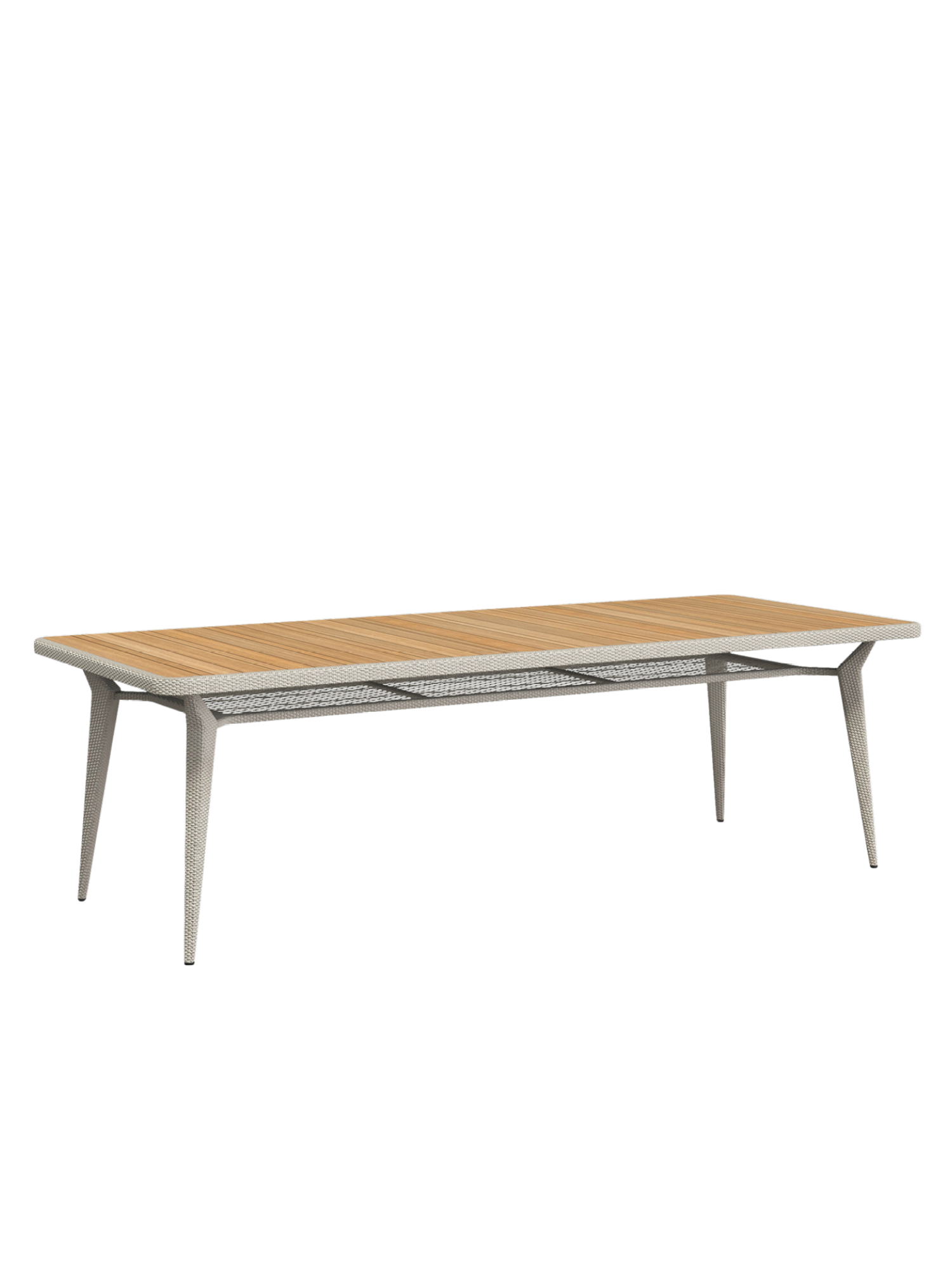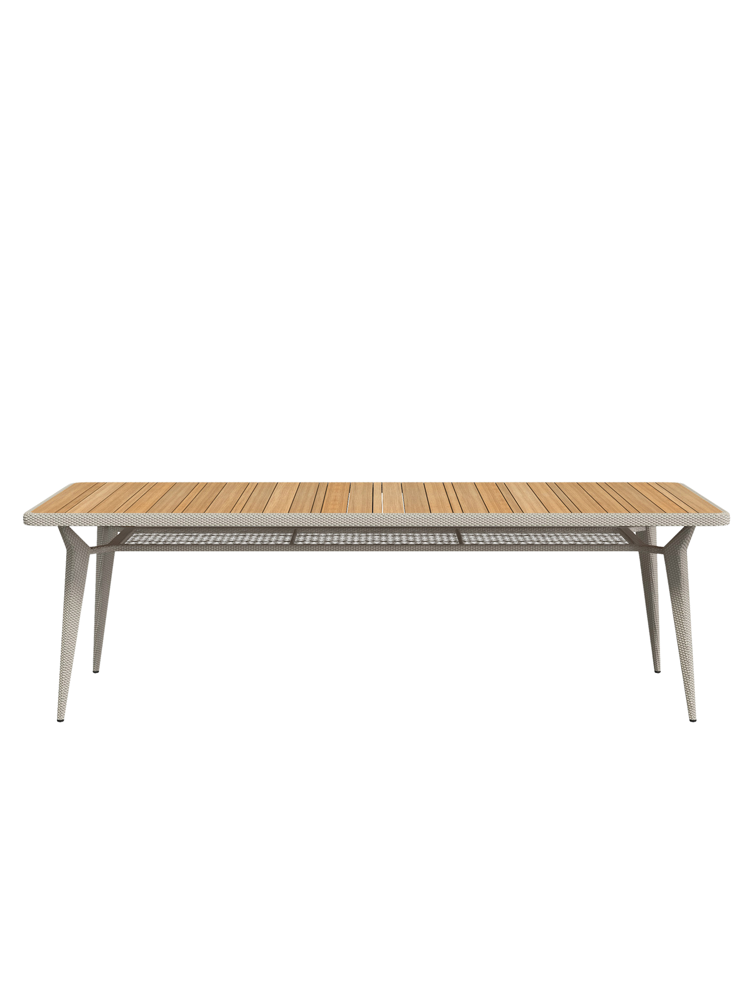 Das Geflechtmuster der Rahmen der Charleston Möbel wiederholt sich an den runden und eckigen Tischen der Serie, die es wahlweise mit Oberflächen aus hochwertigem Teakholz oder strapazierfähiger, frostfester Keramik gibt. Diese Materialien korrespondieren farblich perfekt mit den Nuancen des Geflechts. Eine geflochtene Ablage unter der Tischplatte ist ein ebenso praktisches wie dekoratives Detail.