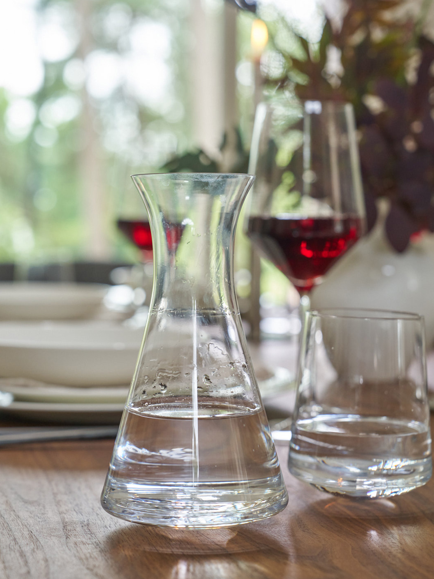 Die unverwechselbaren Claris Gläser und Karaffen kombinieren traditionelle Handwerkskunst mit einem zeitgemäßen Design. Mundgeblasen in einer Mailänder Manufaktur, entstehen die ungewöhnlichen Glasobjekte in aufwendiger Handarbeit. Das hochwertige Kristallglas wirkt schwerelos, der gewölbte Boden verleiht der Kollektion eine innere Dynamik, die sie bei jeder Berührung sanft in Bewegung versetzt, und ihr gleichzeitig Halt gibt. Betont schlichte Gläser mit und ohne Stiel sowie ausdrucksvolle Karaffen in zwei Größen lassen sich miteinander kombinieren oder vollenden auch unabhängig voneinander jedes Tafelbild.