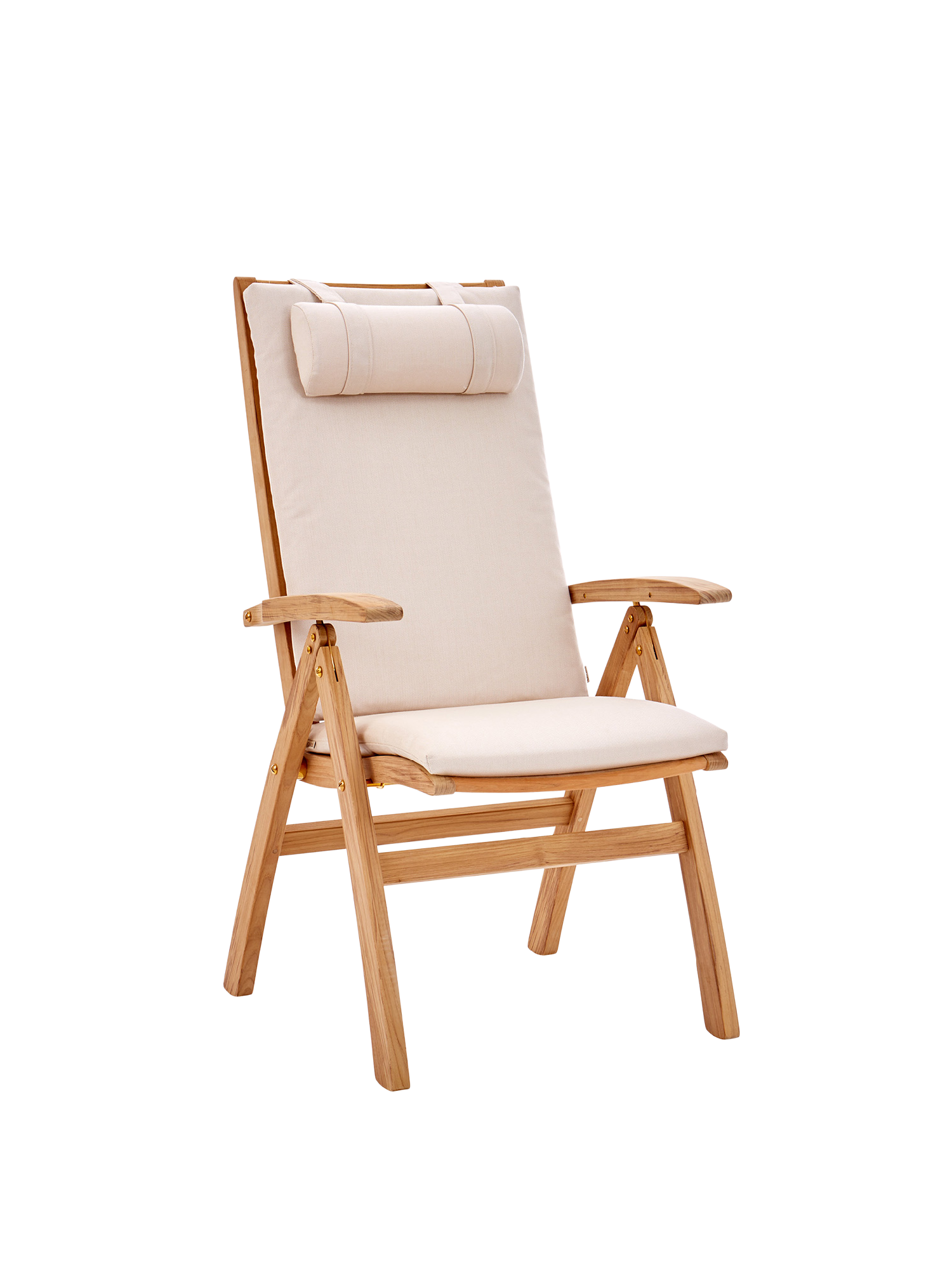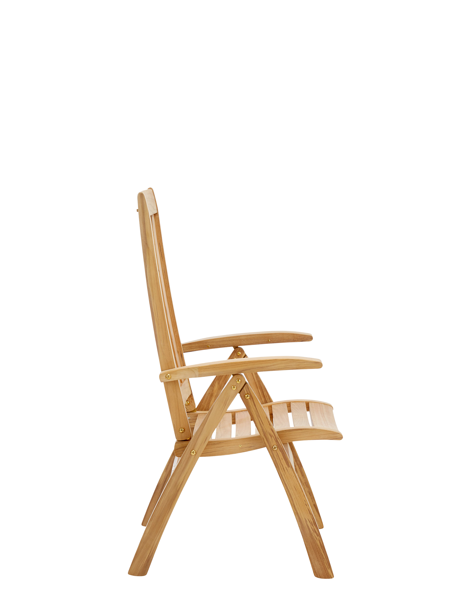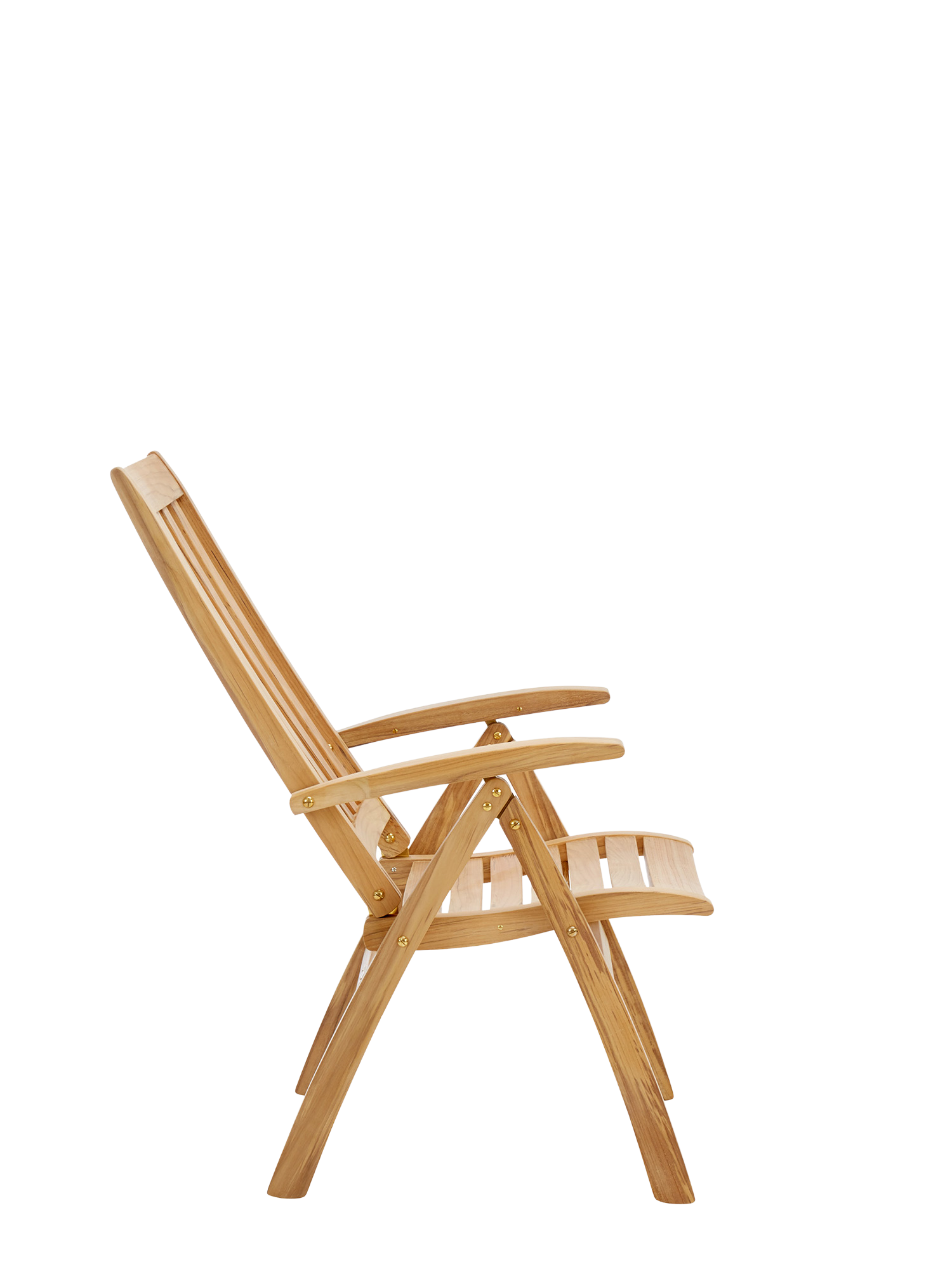 Die Sitzfläche des eleganten Recliners aus wetterfestem Teak folgt der Körperlinie, ist gewölbt und nach hinten leicht abgesenkt, was die Muskulatur angenehm entlastet.