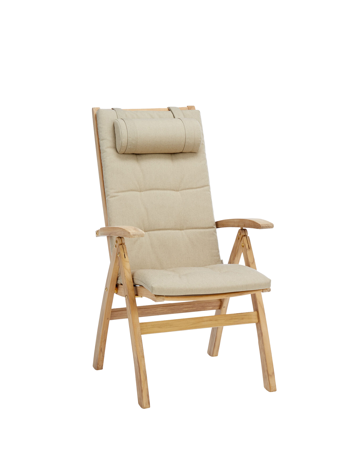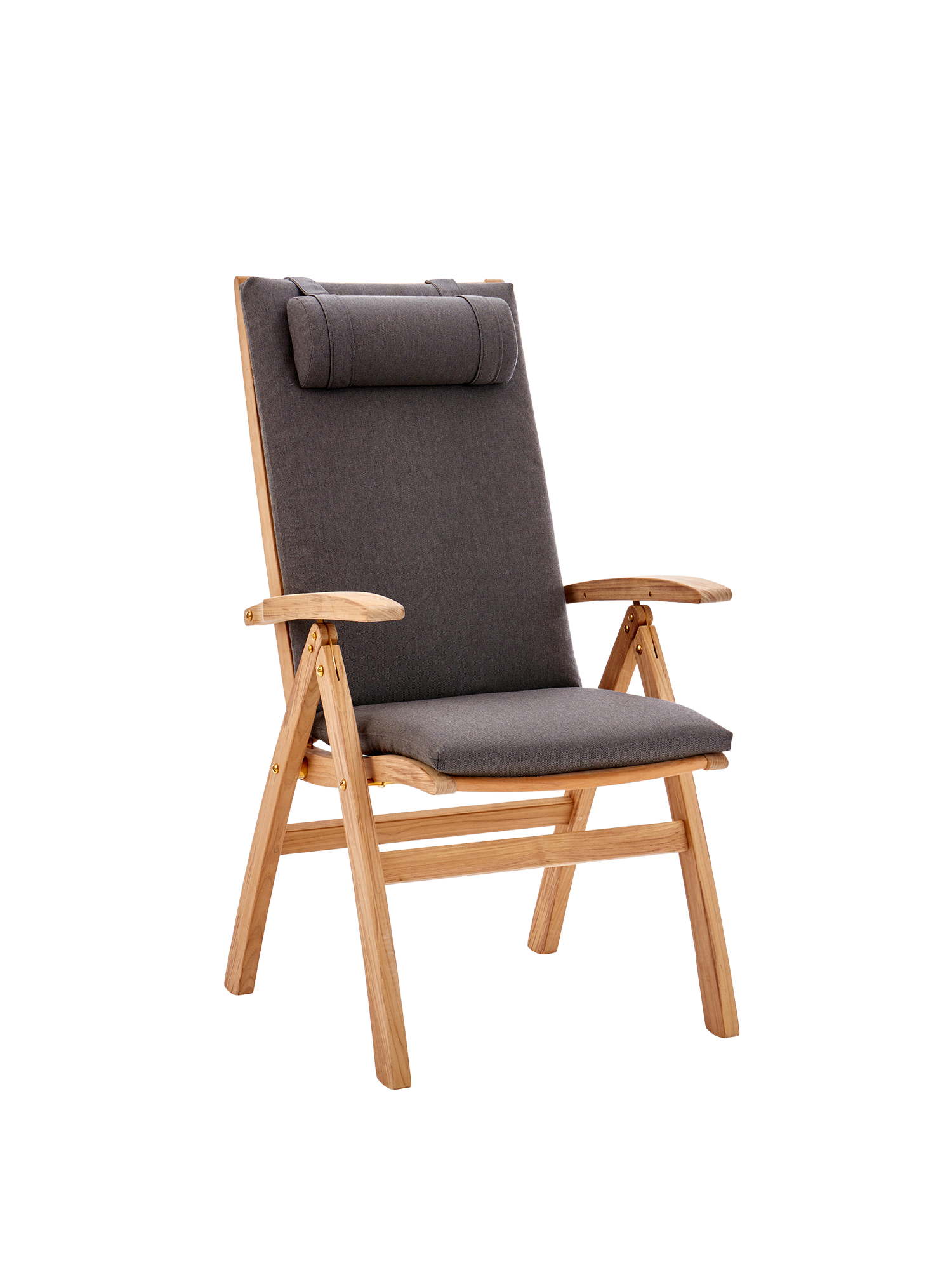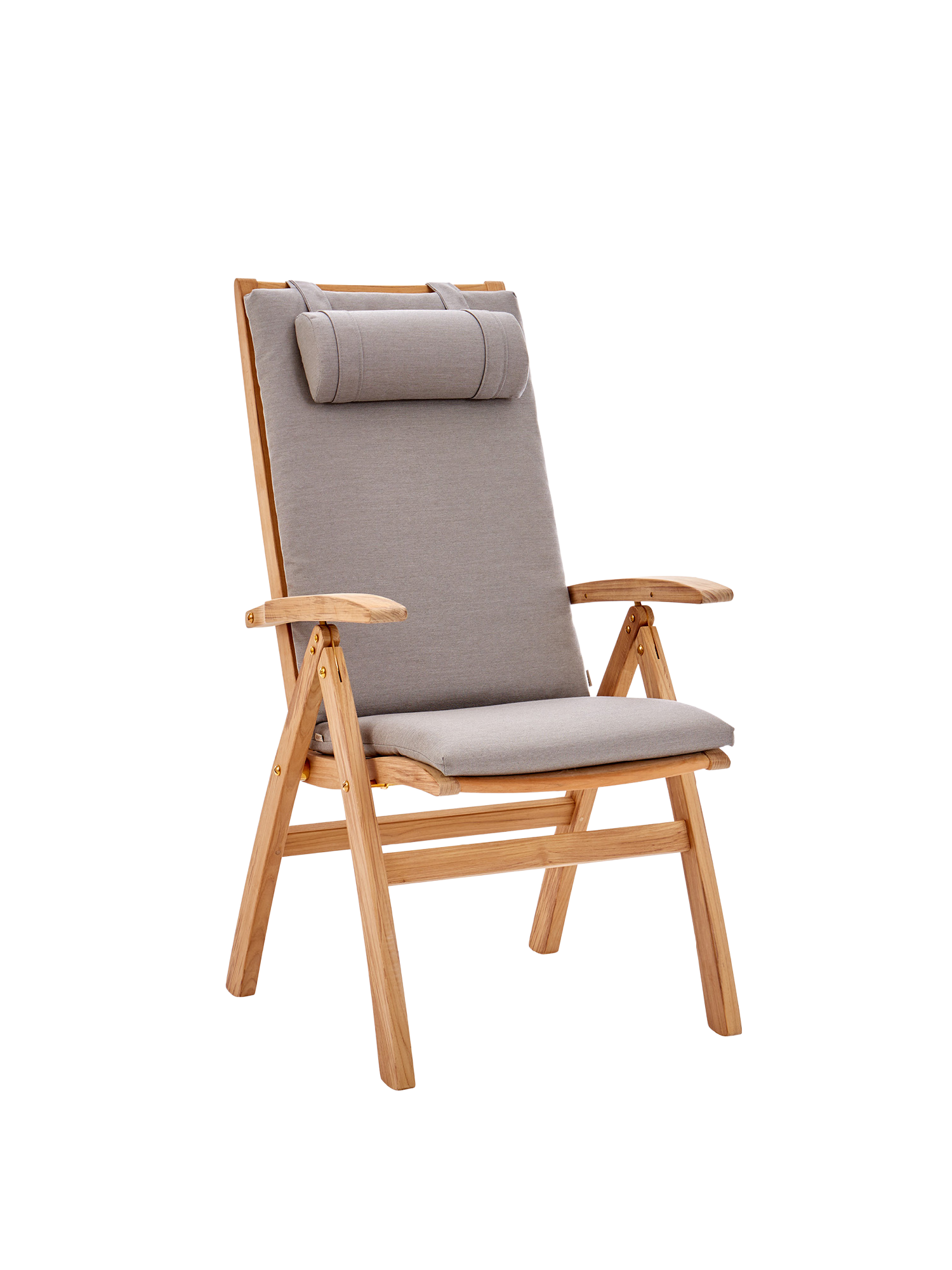 Die Sitzfläche des eleganten Recliners aus wetterfestem Teak folgt der Körperlinie, ist gewölbt und nach hinten leicht abgesenkt, was die Muskulatur angenehm entlastet.