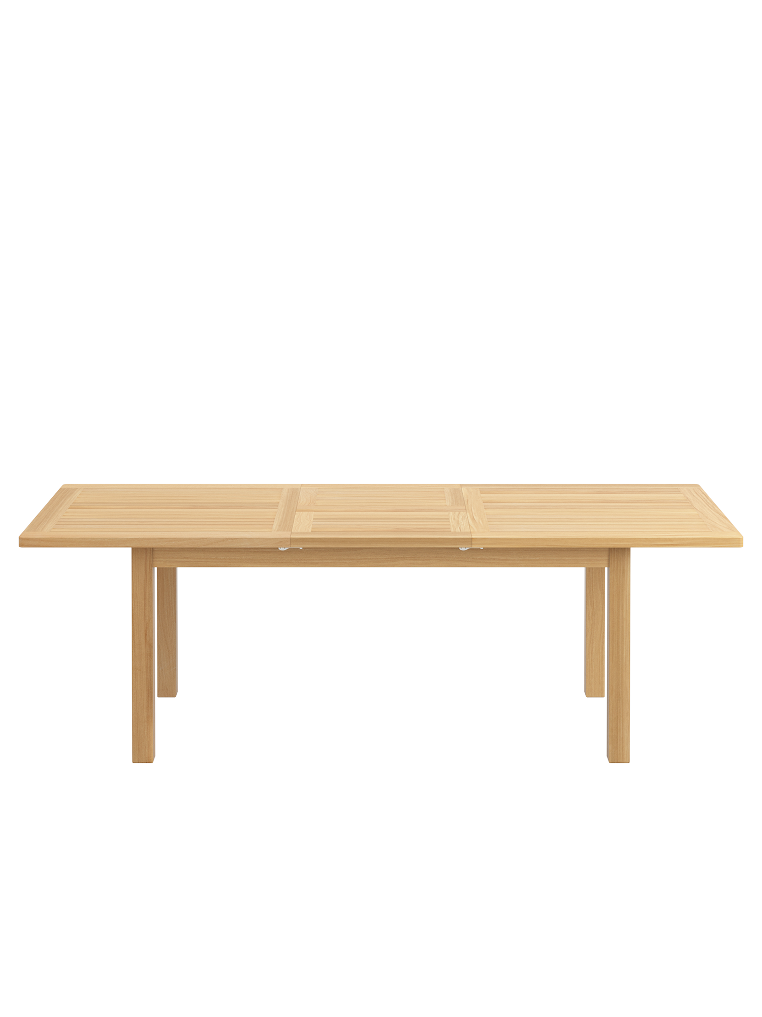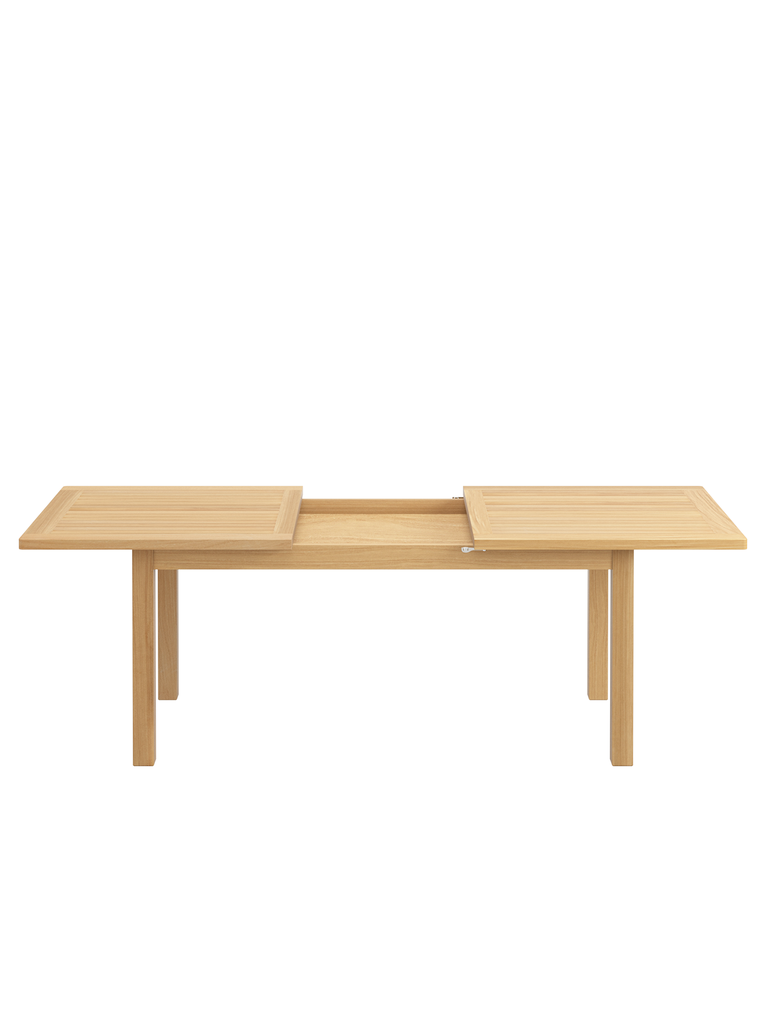 Bei allen Teak Ausziehtischen lässt sich das Mittelteil leichtgängig klappen. Wird es nicht benötigt, lagert es im Tisch. Beim Cornwall Tisch sind wartungsfreie Aluminiumteile aufwändig in das massive Teakholz eingearbeitet und halten so den Mechanismus zuverlässig in Form.