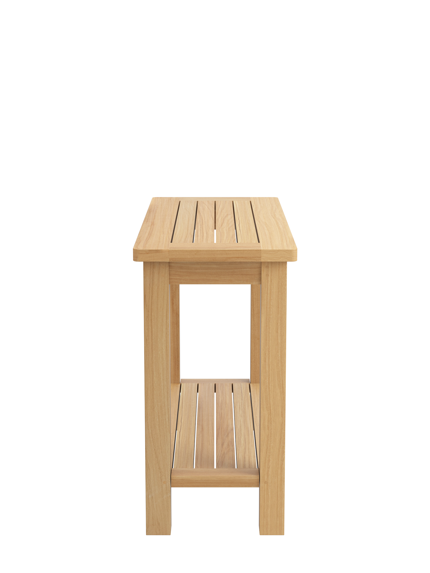 Der Konsoltisch aus Teak bietet auf zwei Ebenen Platz für Geschirr oder Accessoires. Mit ihm lässt sich auch elegant ein Cornwall Esstisch verlängern, denn er hat exakt die gleiche Höhe.