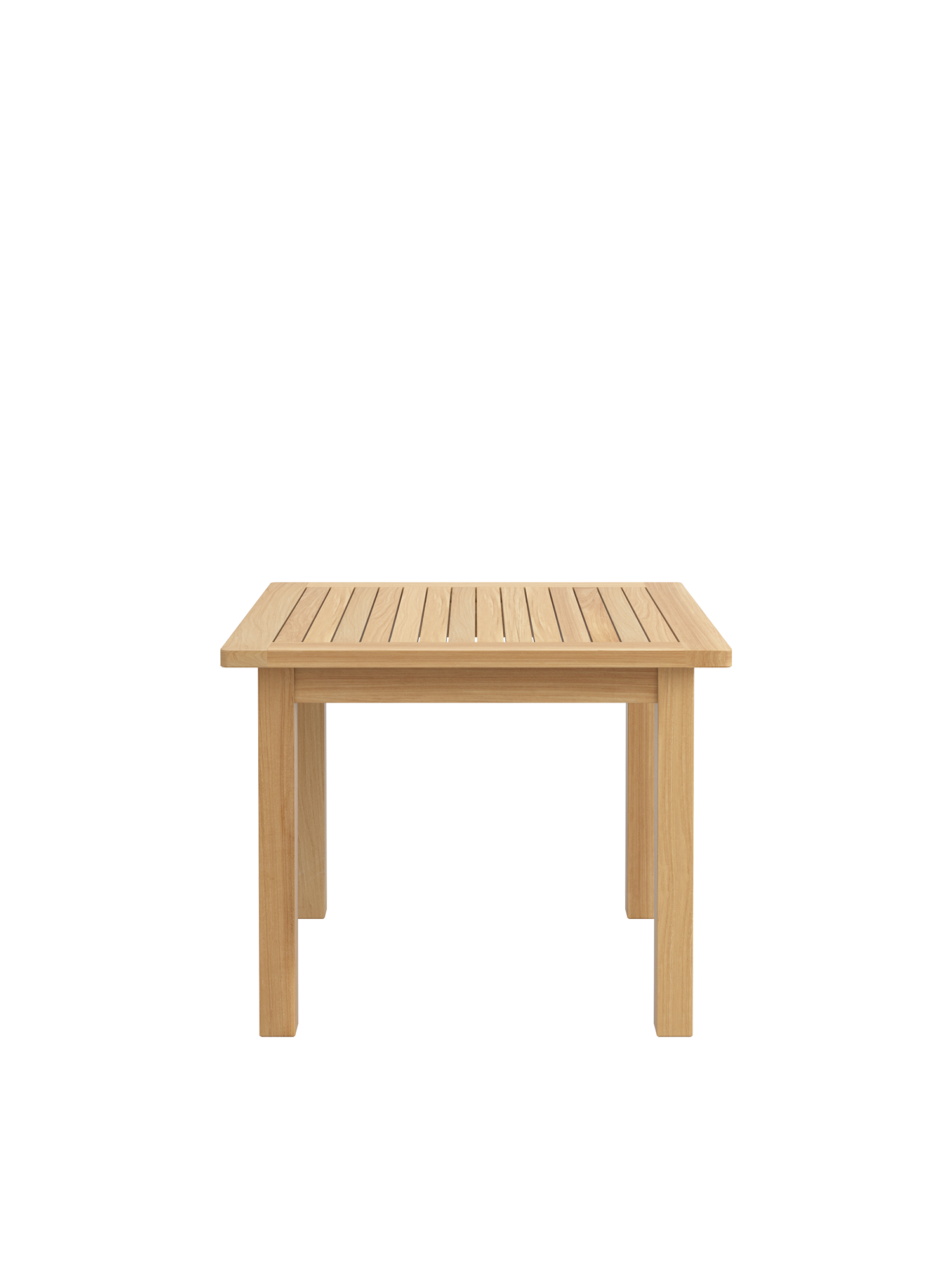 Die vier starken Beine des geräumigen Landhaustisches stehen weit auseinander und sind durch eine schmale Zarge verbunden. Seine Platte besteht aus Teakleisten, die in den kräftigen Rahmen eingezapft sind.