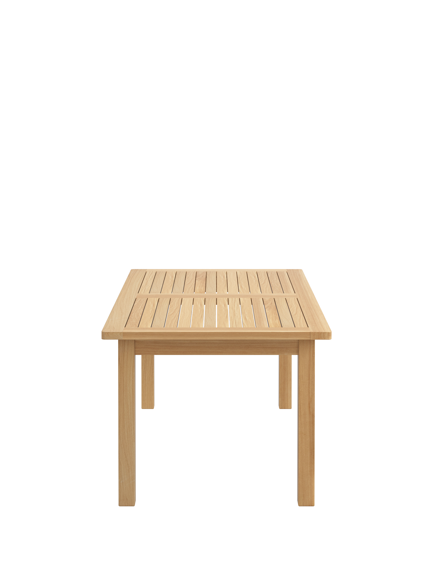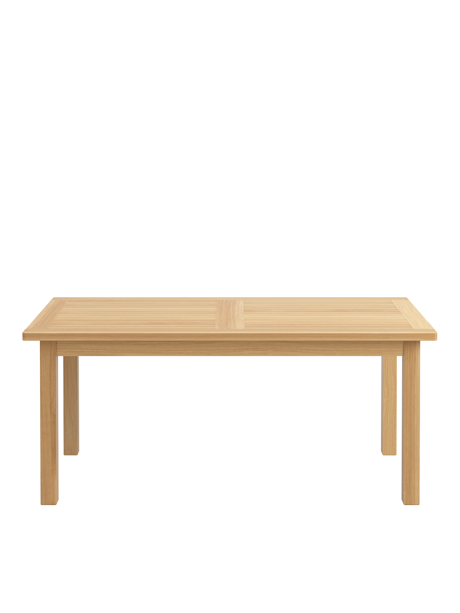 Die vier starken Beine des geräumigen Landhaustisches stehen weit auseinander und sind durch eine schmale Zarge verbunden. Seine Platte besteht aus Teakleisten, die in den kräftigen Rahmen eingezapft sind.