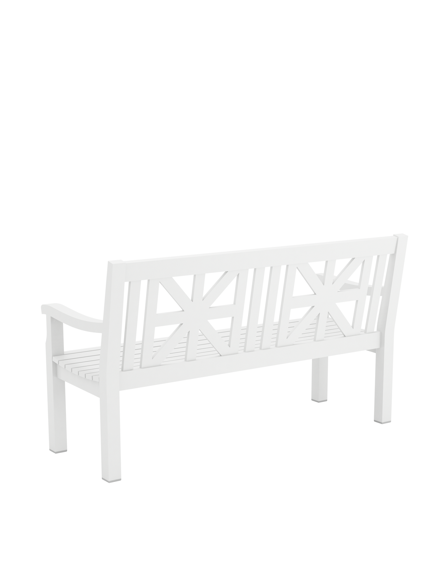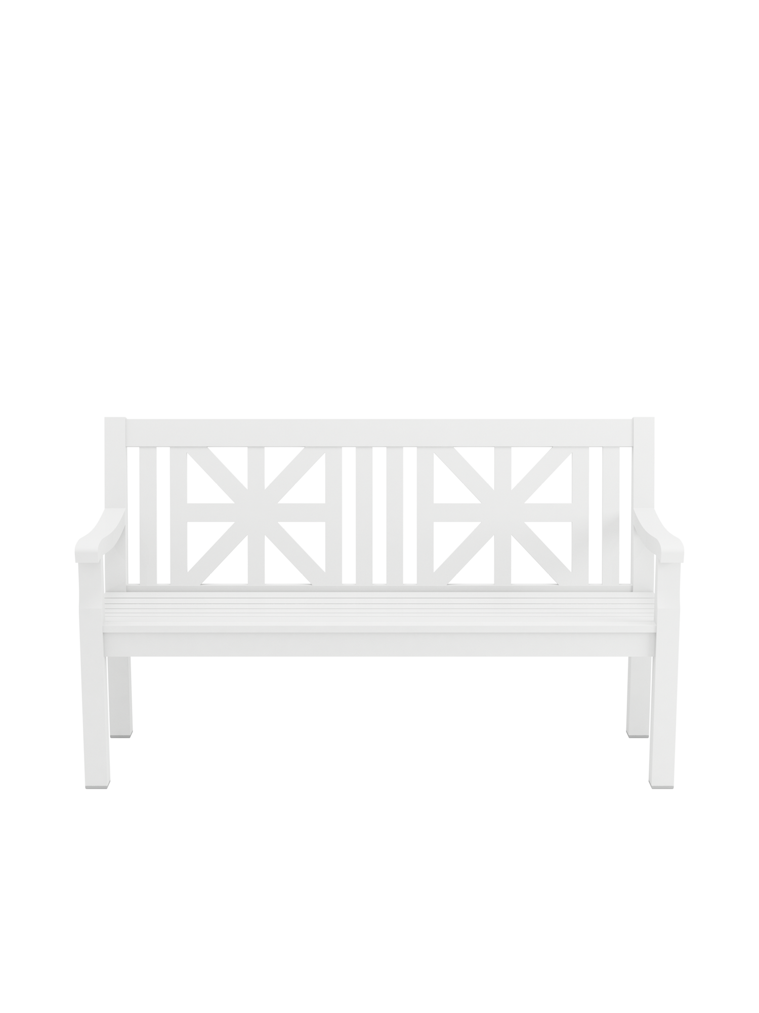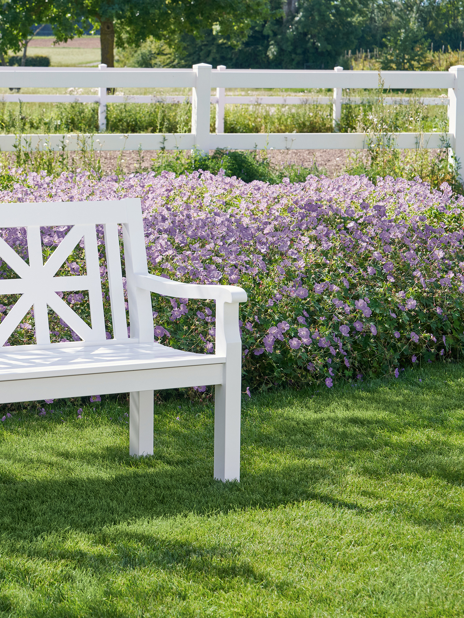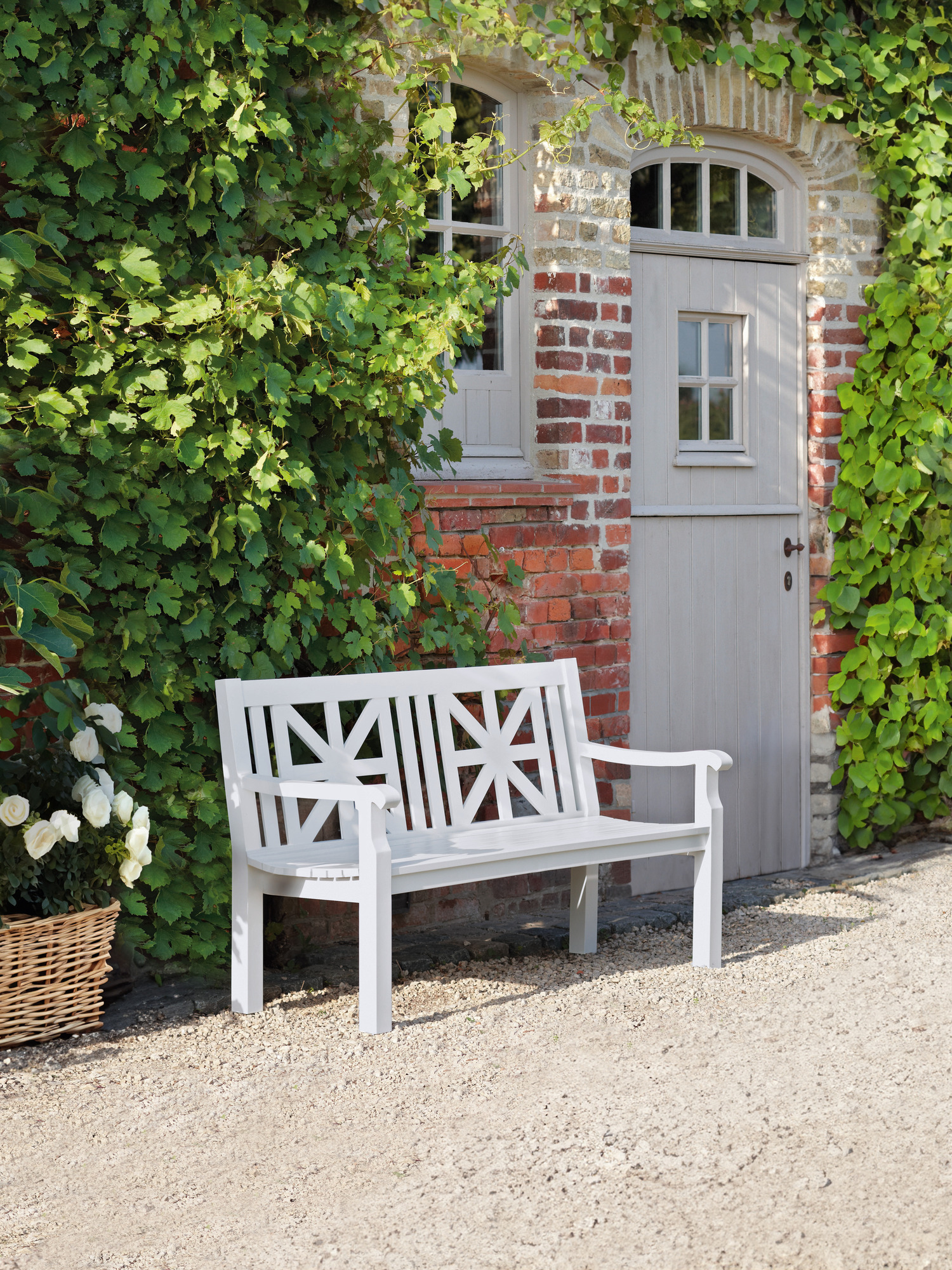 Die weiße Aluminiumbank verbreitet überall ländliche Idylle. Ihre handwerkliche Anmutung lässt an traditionelle Holzmöbel denken, jedoch ist sie ungleich pflegeleichter. Sternmuster, geschwungene Profile und gerundete Armlehnen werden von Hand verschweißt, geschliffen und pulverbeschichtet. Und machen jede von ihnen zu einem Unikat.