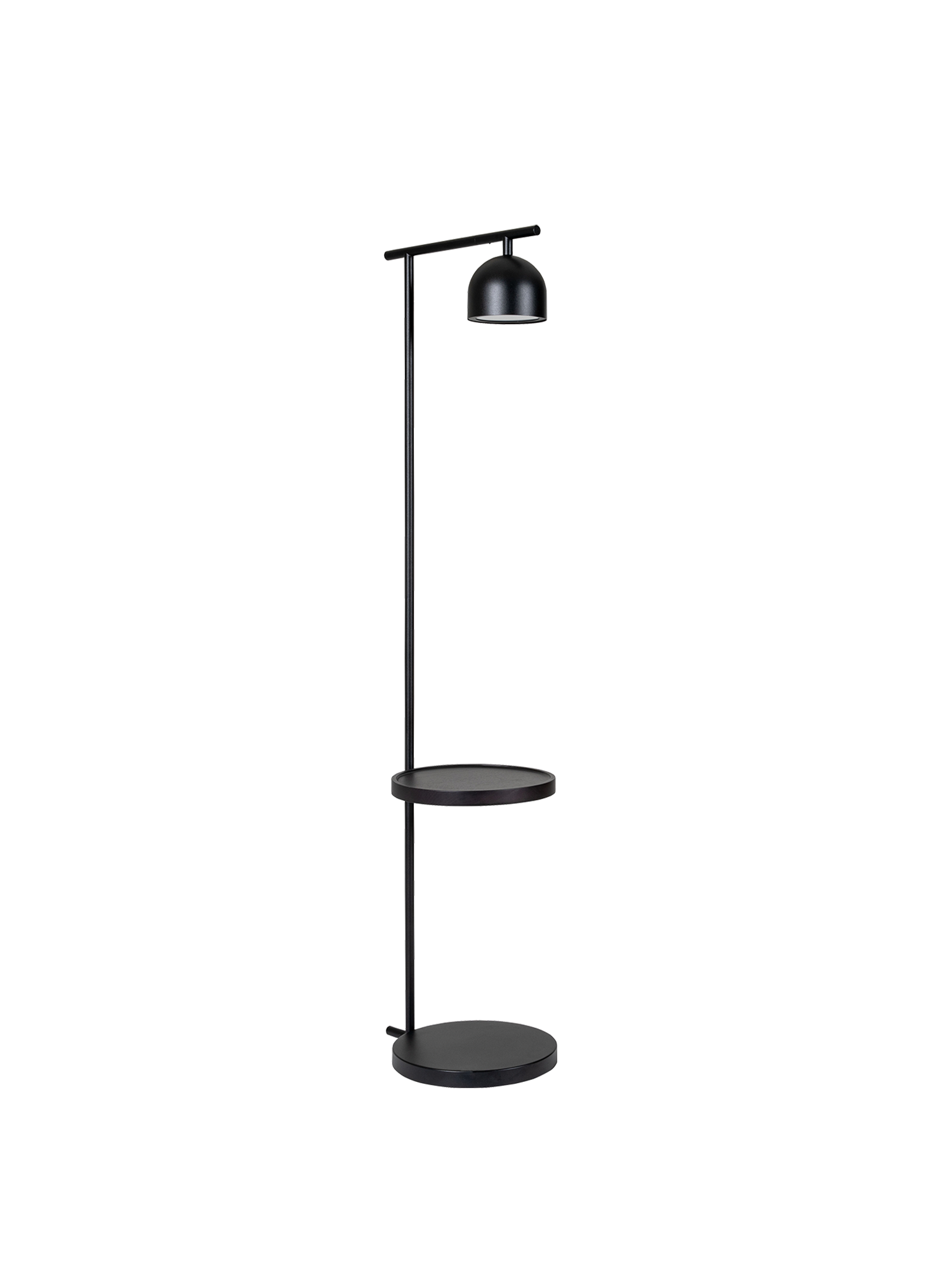 Die aus tiefschwarzem Metall gefertigte Stehleuchte überzeugt in wechselnden Rollen. Dank des drehbaren Diffusors erhellt sie flexibel den Raum und sorgt auf Wunsch auch für indirekte Beleuchtung. Auf der praktischen Ablage aus lackierter Esche finden Bücher, Getränke oder Dekorationen Platz.