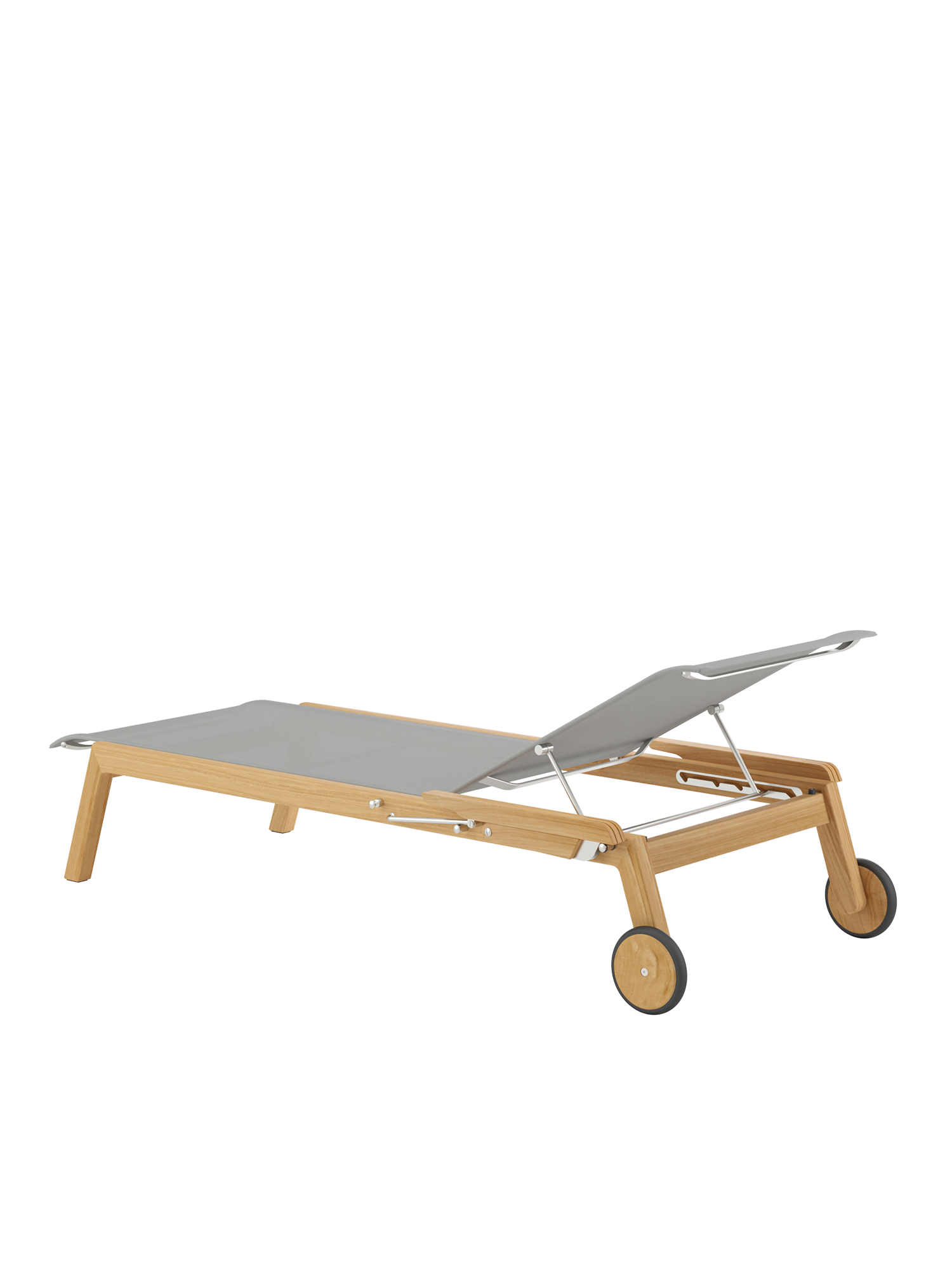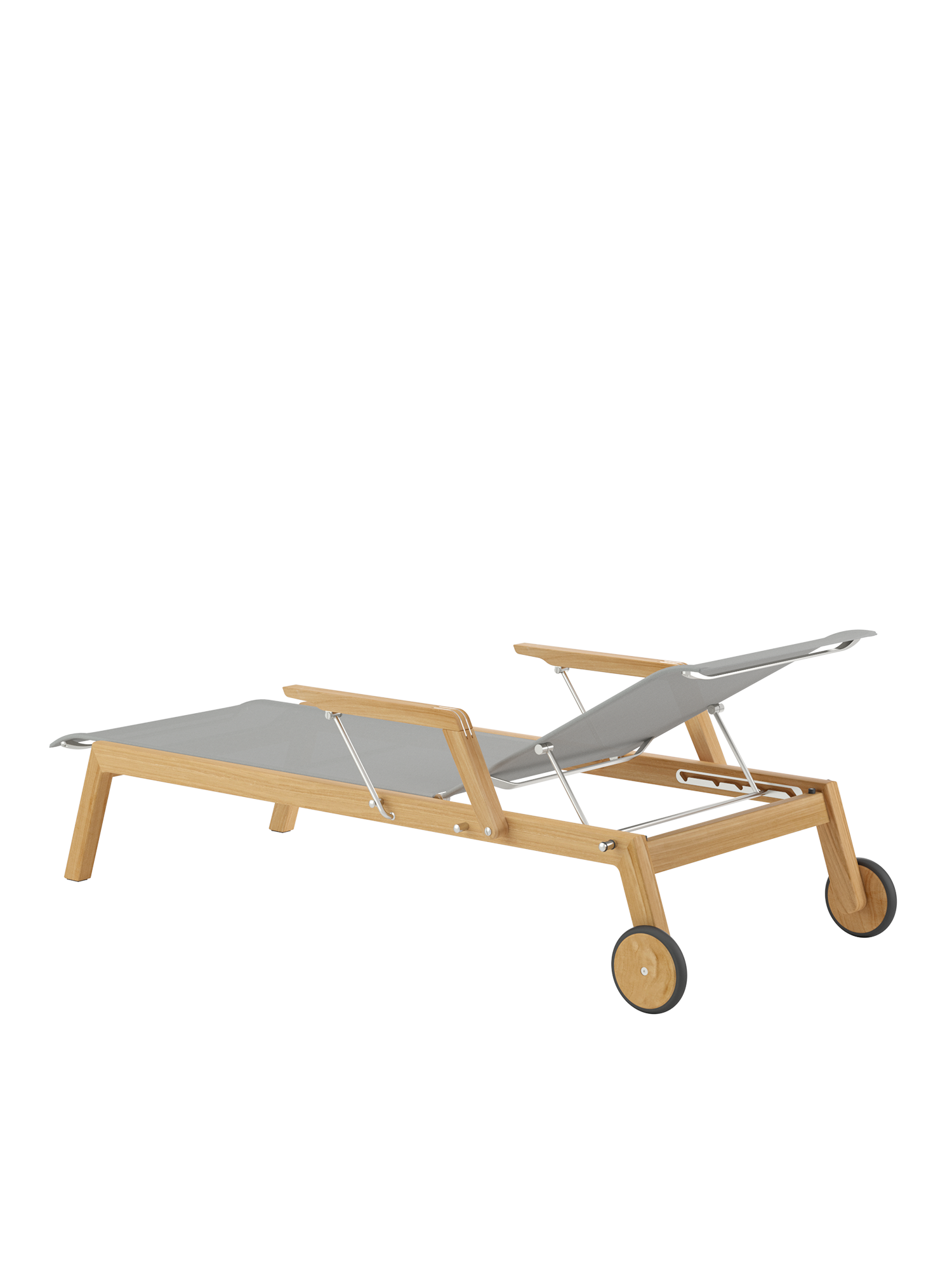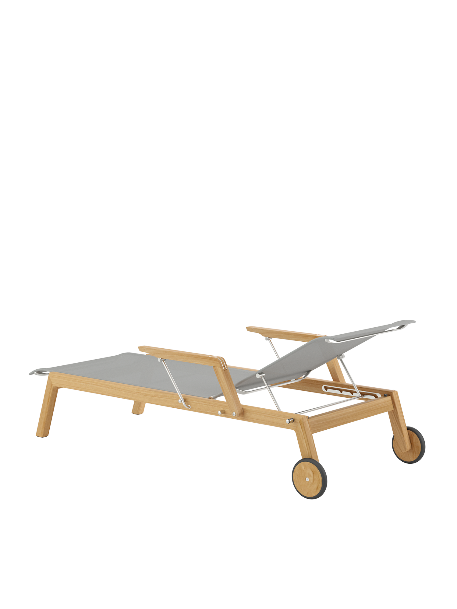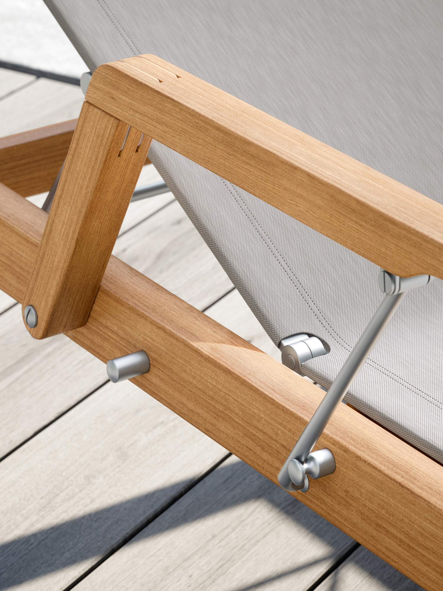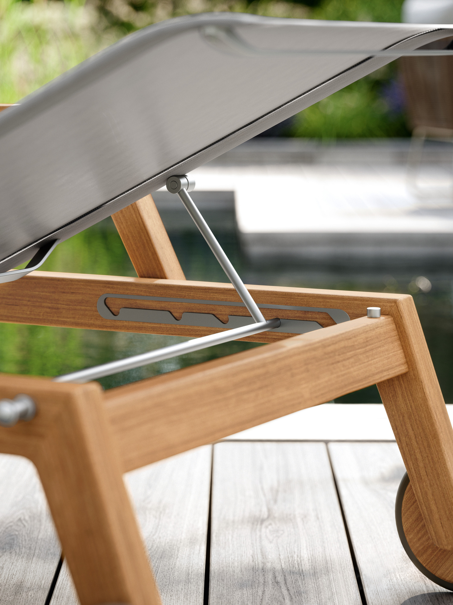 Klare, geschmeidig gerundete Konturen zeichnen das Teakgestell aus, ein satinierter Edelstahlrahmen hält die Polymerbespannung. Konzentrierte Ästhetik trifft auf maximale Bequemlichkeit.