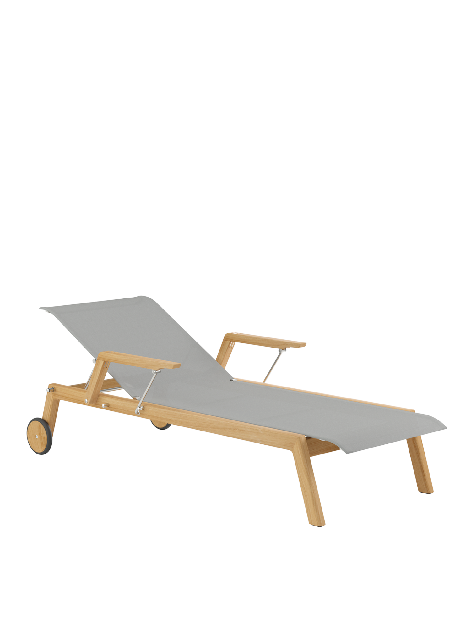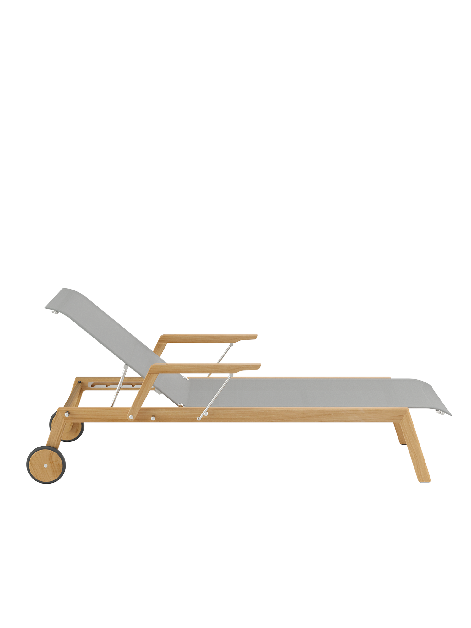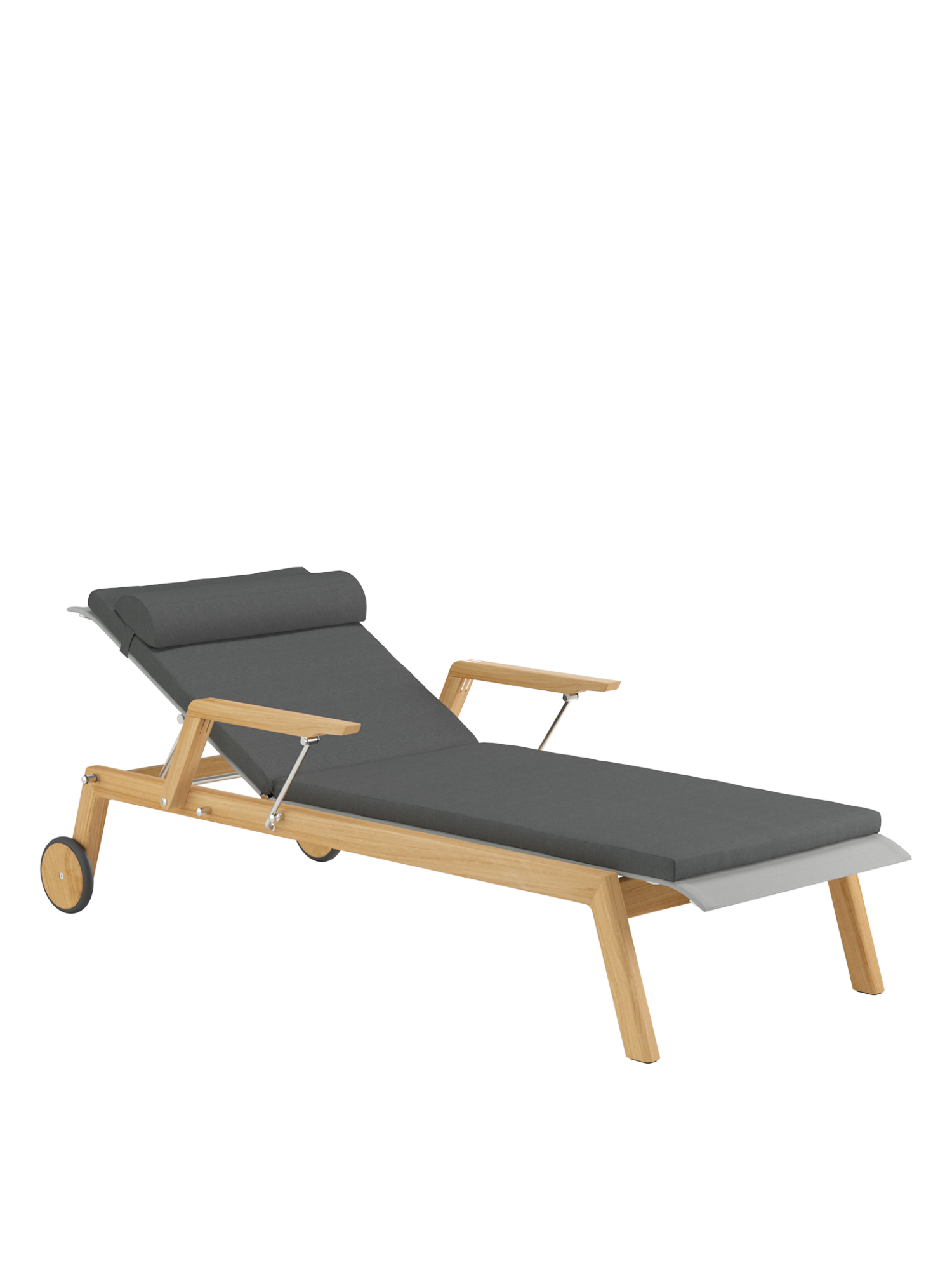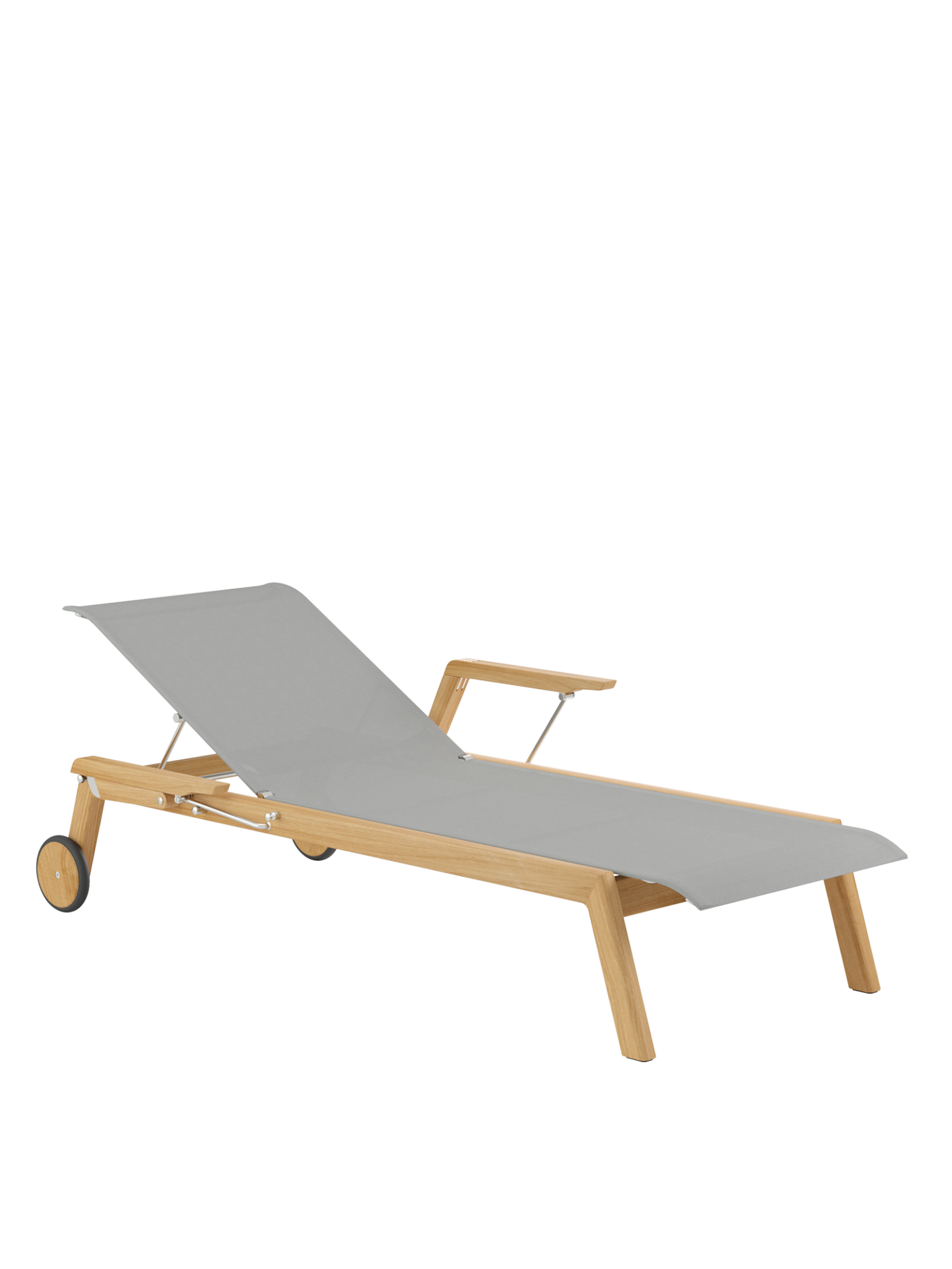 Klare, geschmeidig gerundete Konturen zeichnen das Teakgestell aus, ein satinierter Edelstahlrahmen hält die Polymerbespannung. Konzentrierte Ästhetik trifft auf maximale Bequemlichkeit.