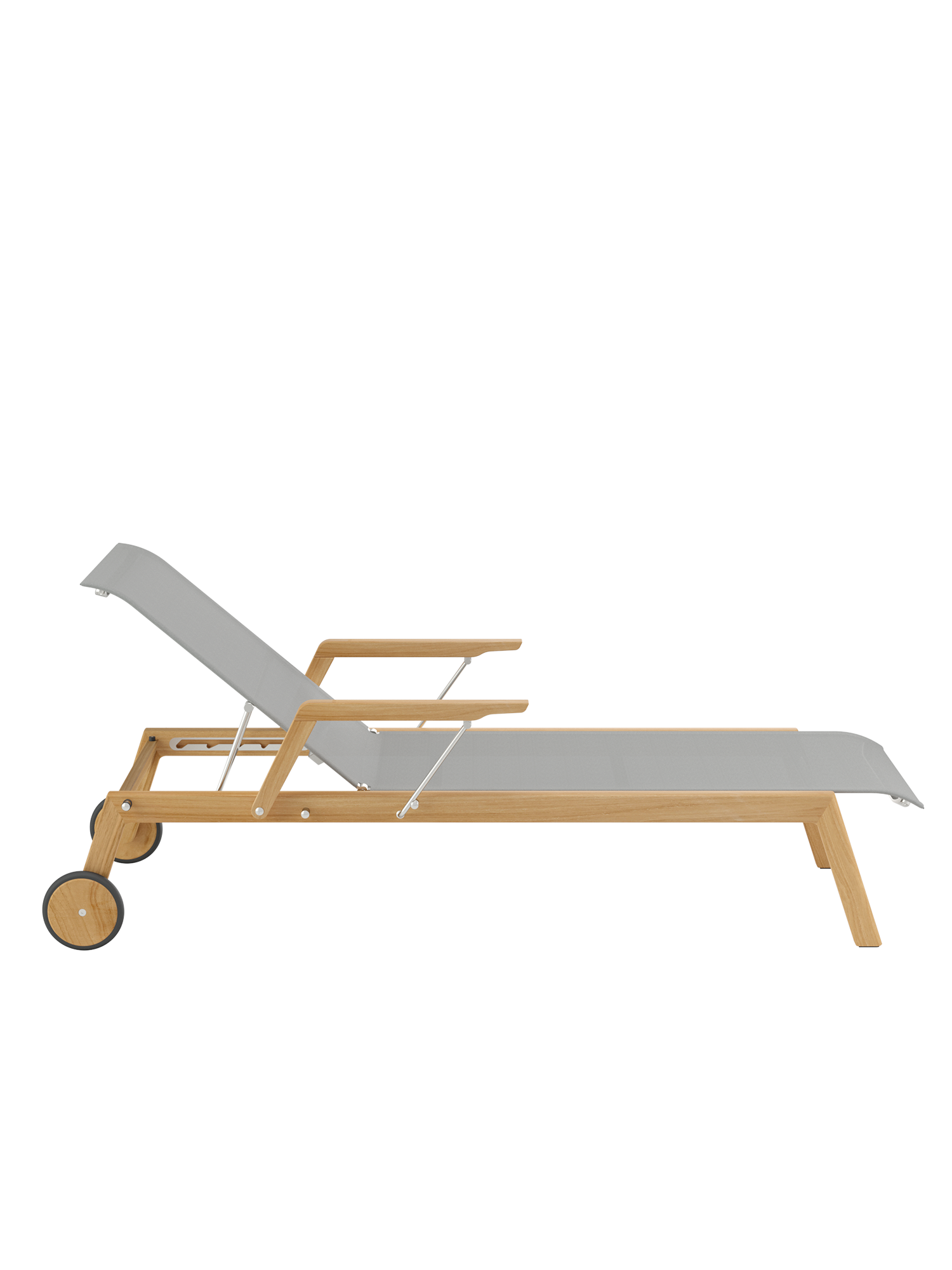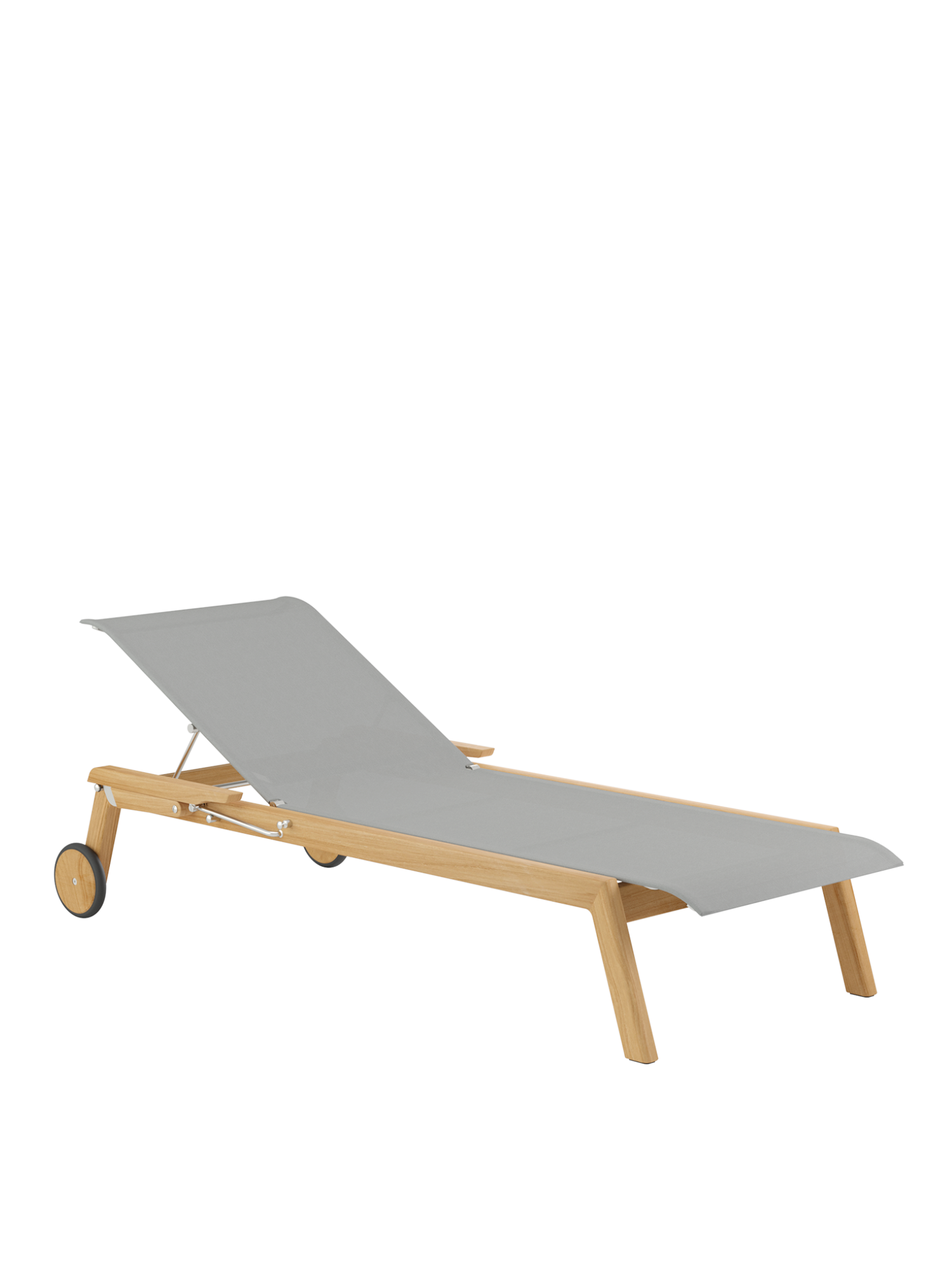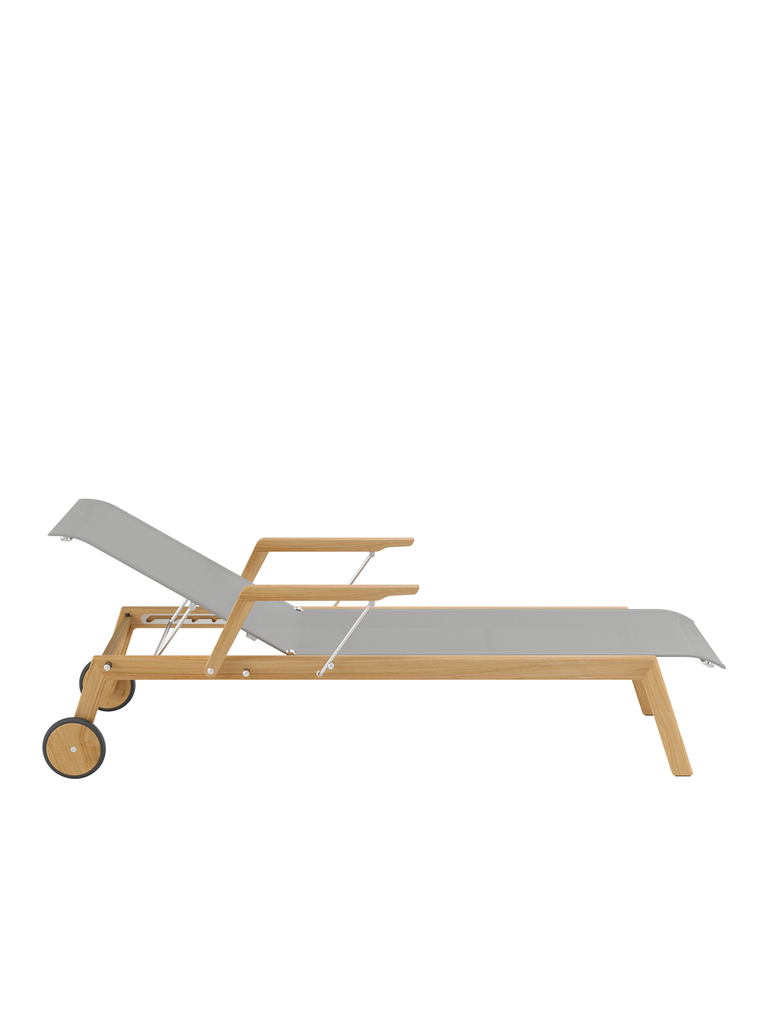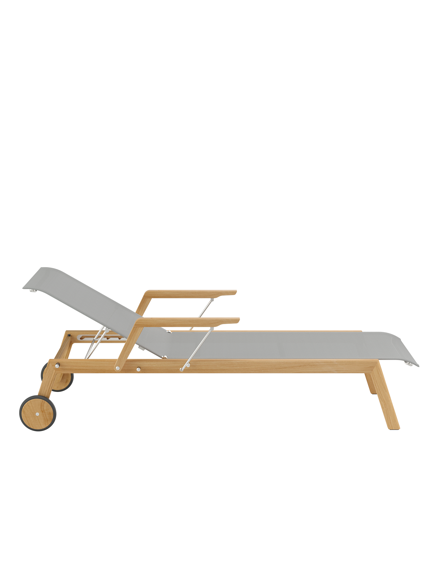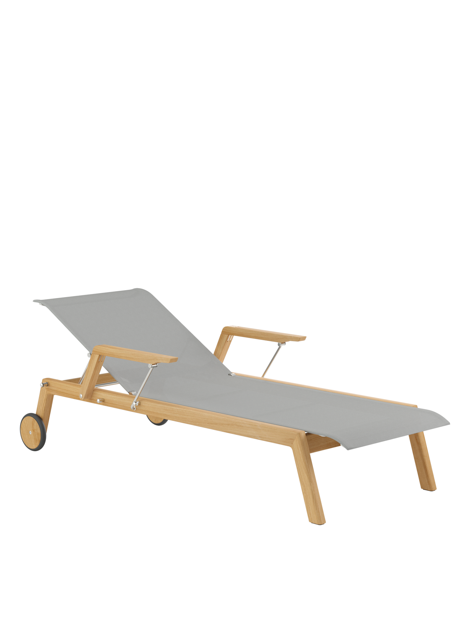 Klare, geschmeidig gerundete Konturen zeichnen das Teakgestell aus, ein satinierter Edelstahlrahmen hält die Polymerbespannung. Konzentrierte Ästhetik trifft auf maximale Bequemlichkeit.
