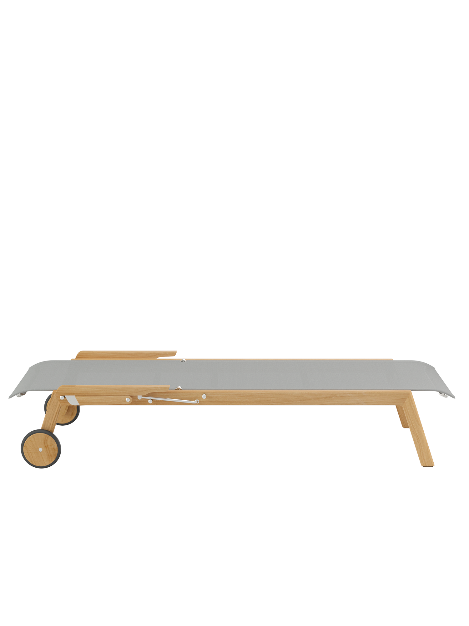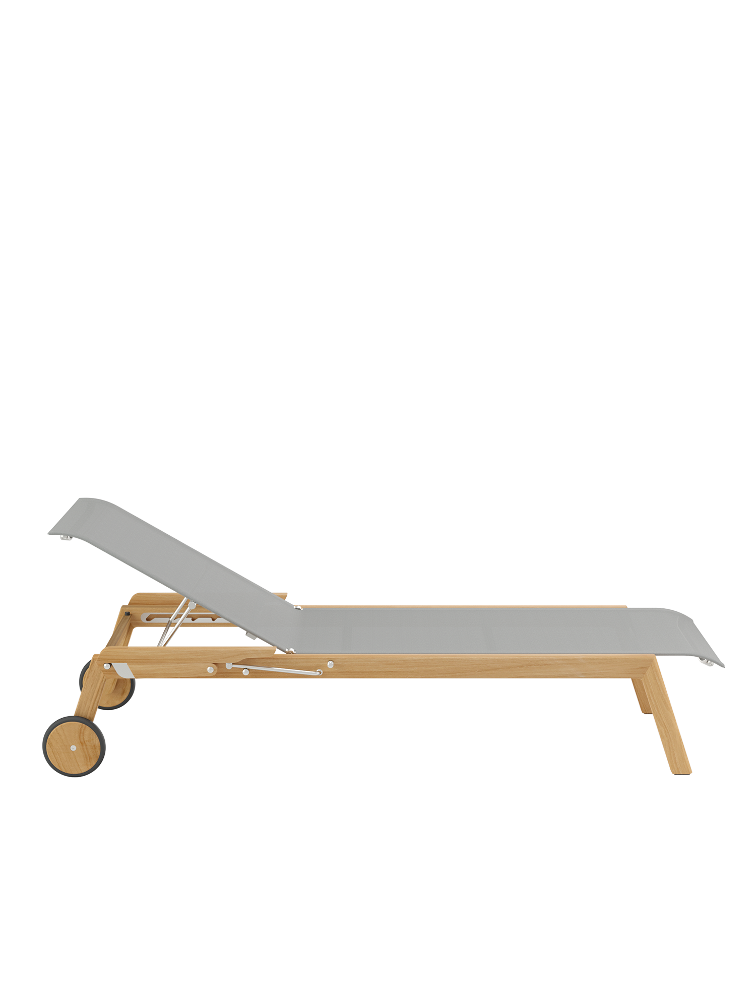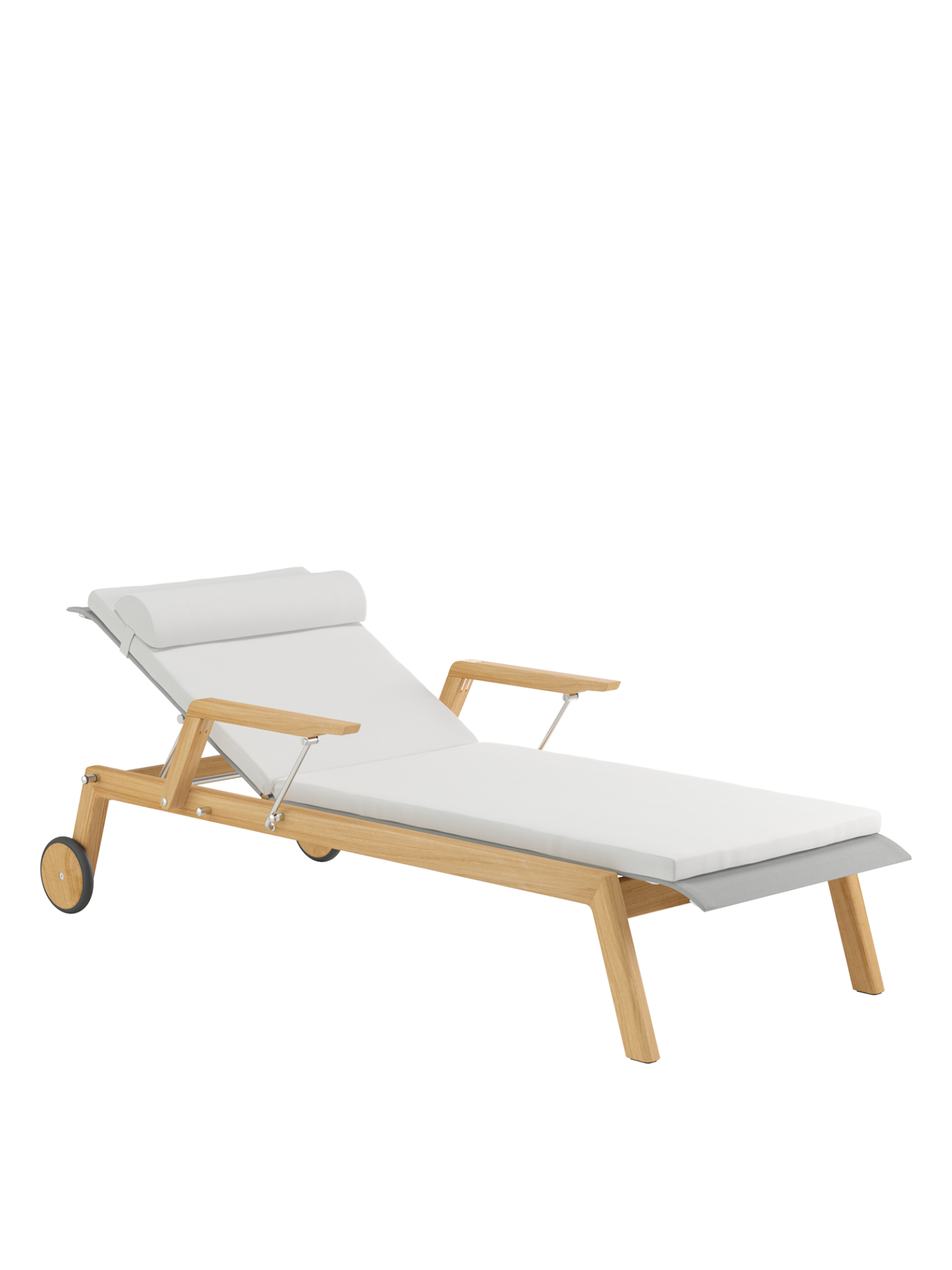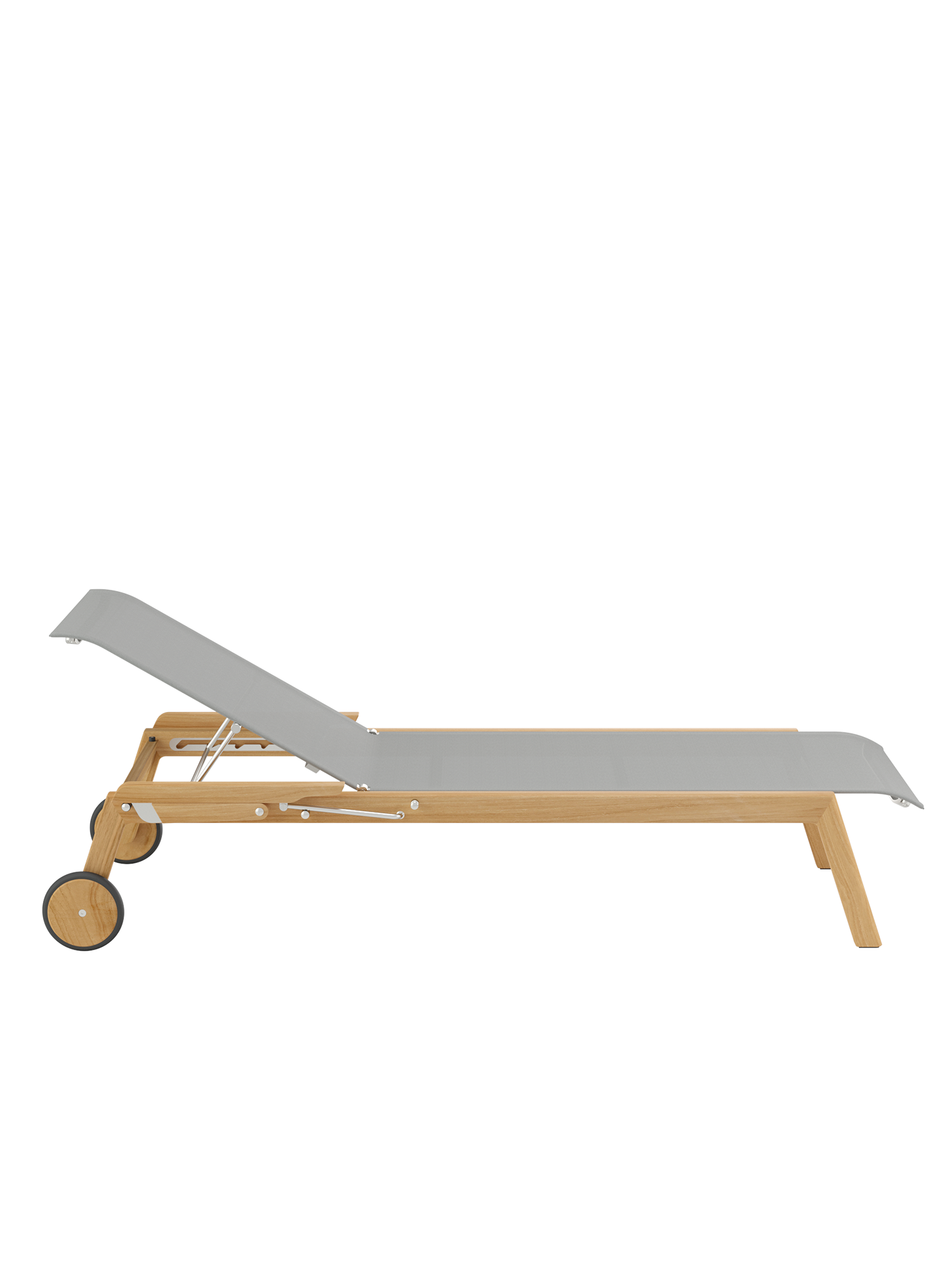 Klare, geschmeidig gerundete Konturen zeichnen das Teakgestell aus, ein satinierter Edelstahlrahmen hält die Polymerbespannung. Konzentrierte Ästhetik trifft auf maximale Bequemlichkeit.