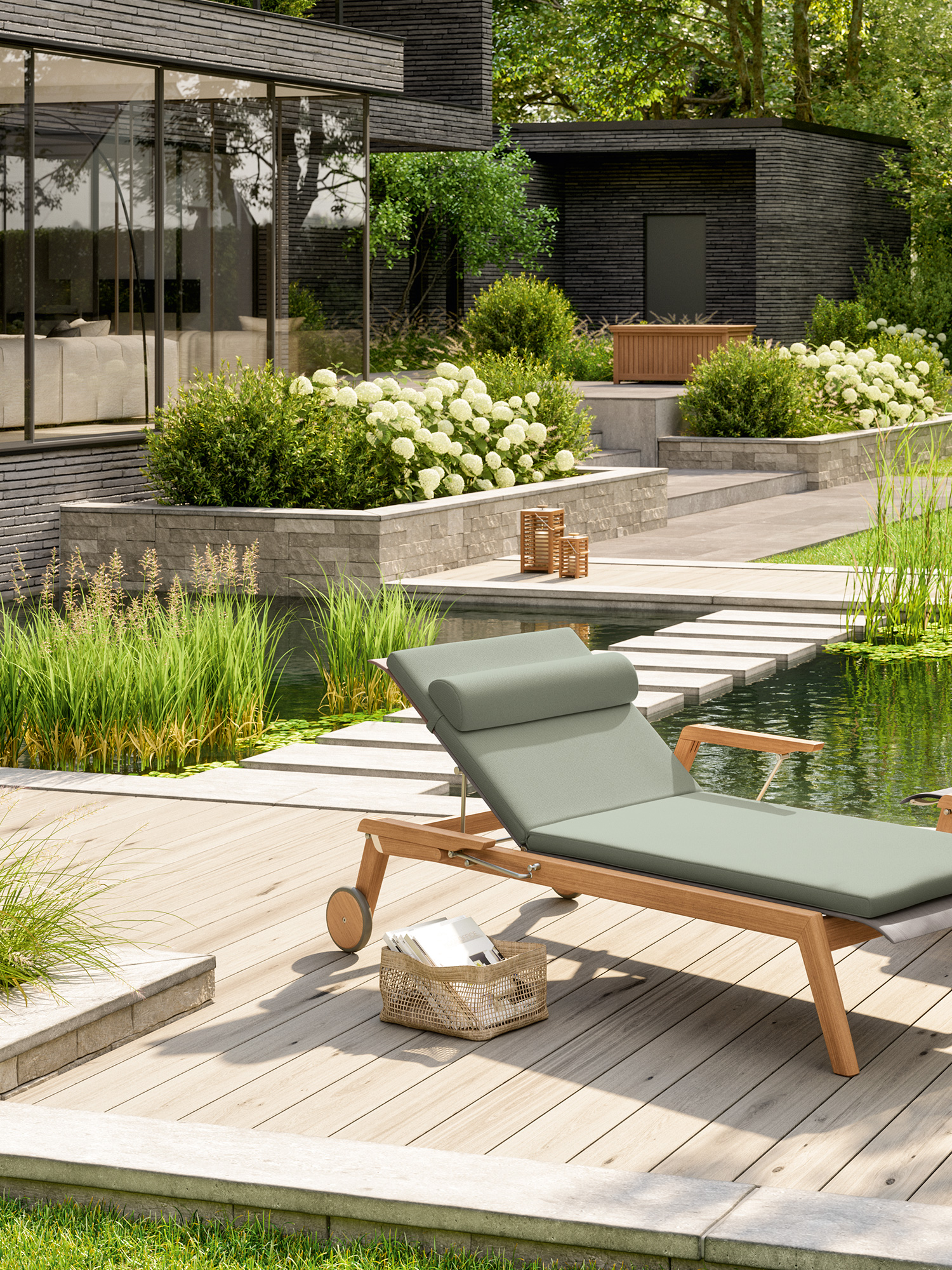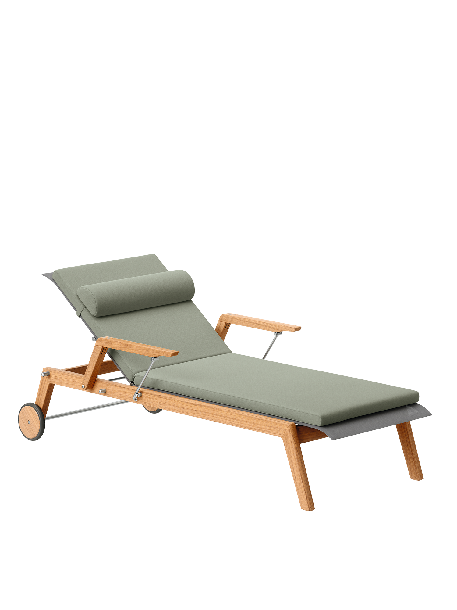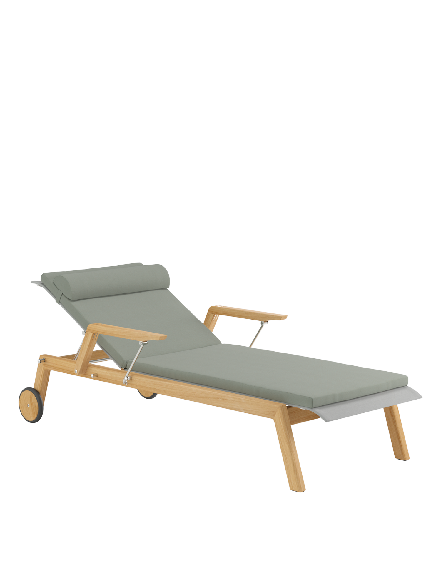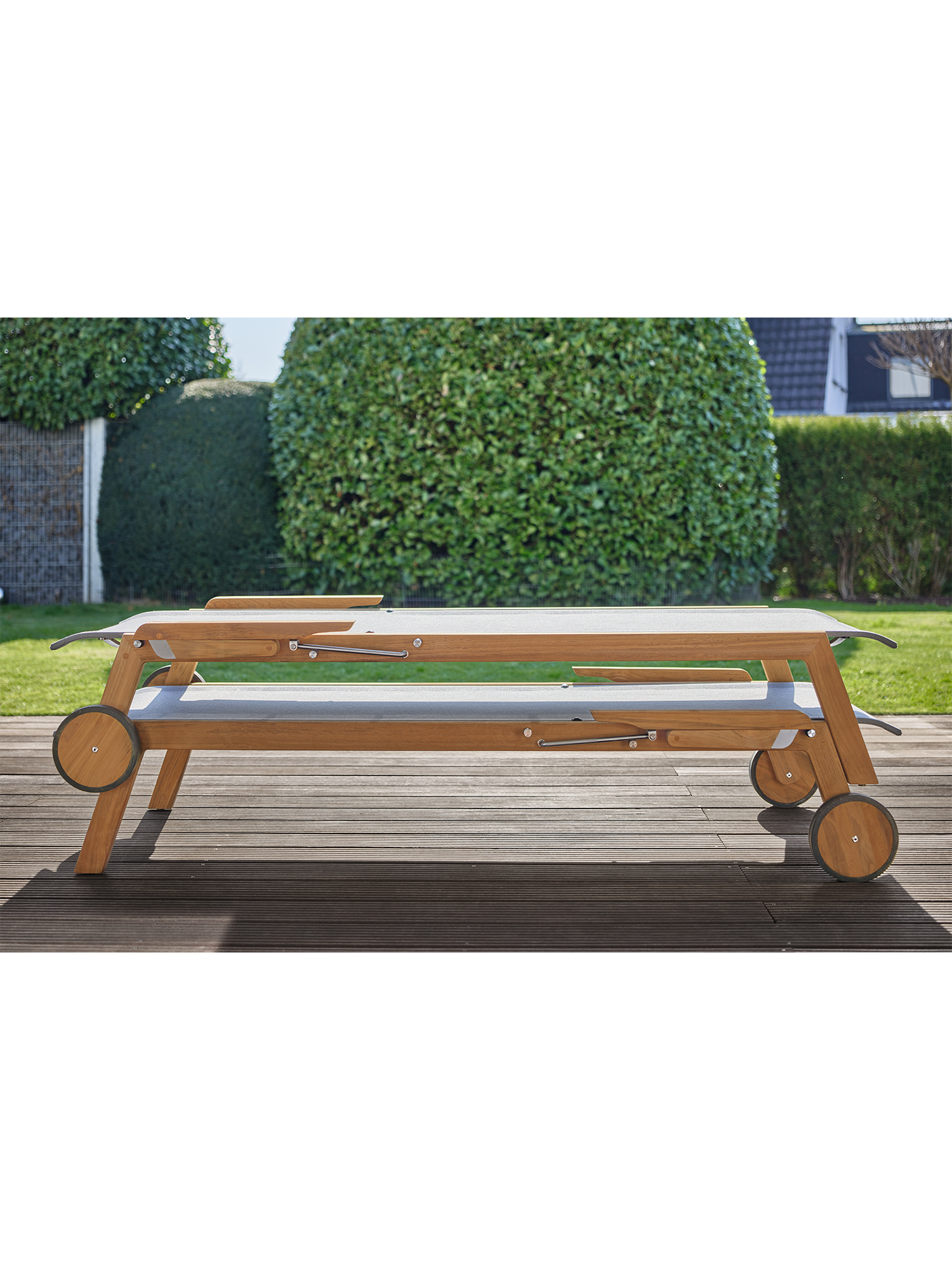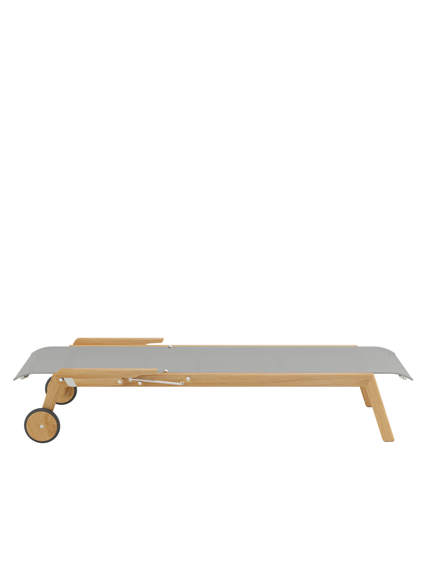 Klare, geschmeidig gerundete Konturen zeichnen das Teakgestell aus, ein satinierter Edelstahlrahmen hält die Polymerbespannung. Konzentrierte Ästhetik trifft auf maximale Bequemlichkeit.