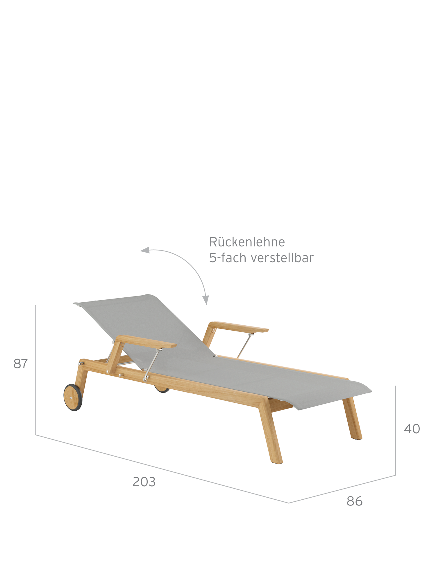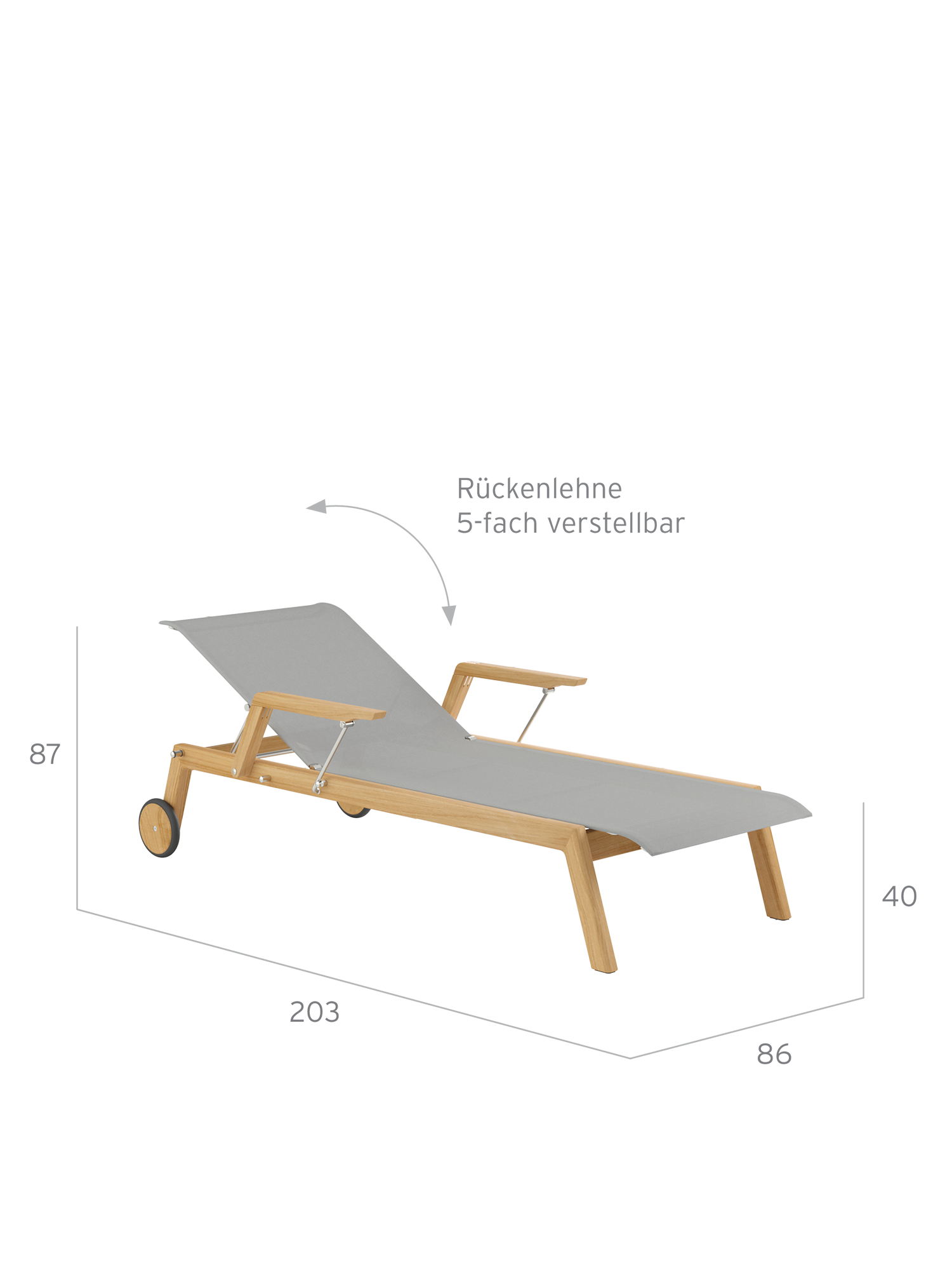 Für ein besonders entspanntes Ein- und Aussteigen sorgen klappbare Armlehnen. Die perfekte Liegeposition auf der formstabilen Polymerbespannung ist dank des fünffach verstellbaren Rückenteils schnell gefunden.