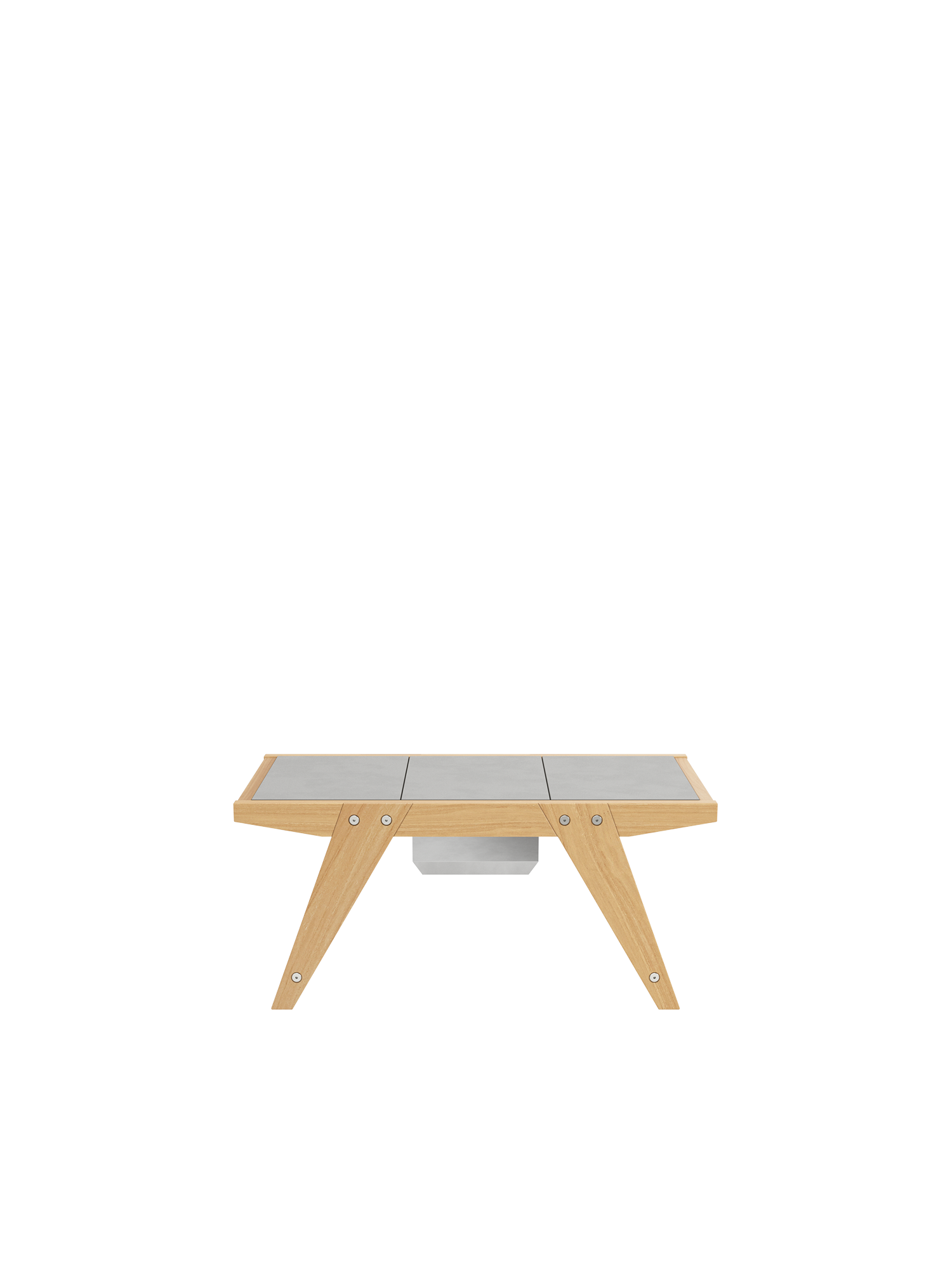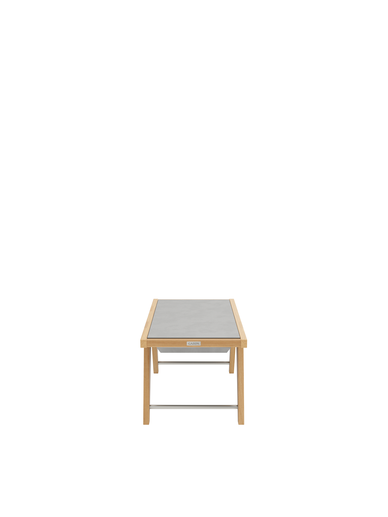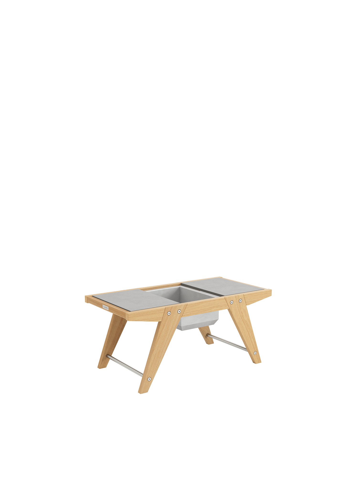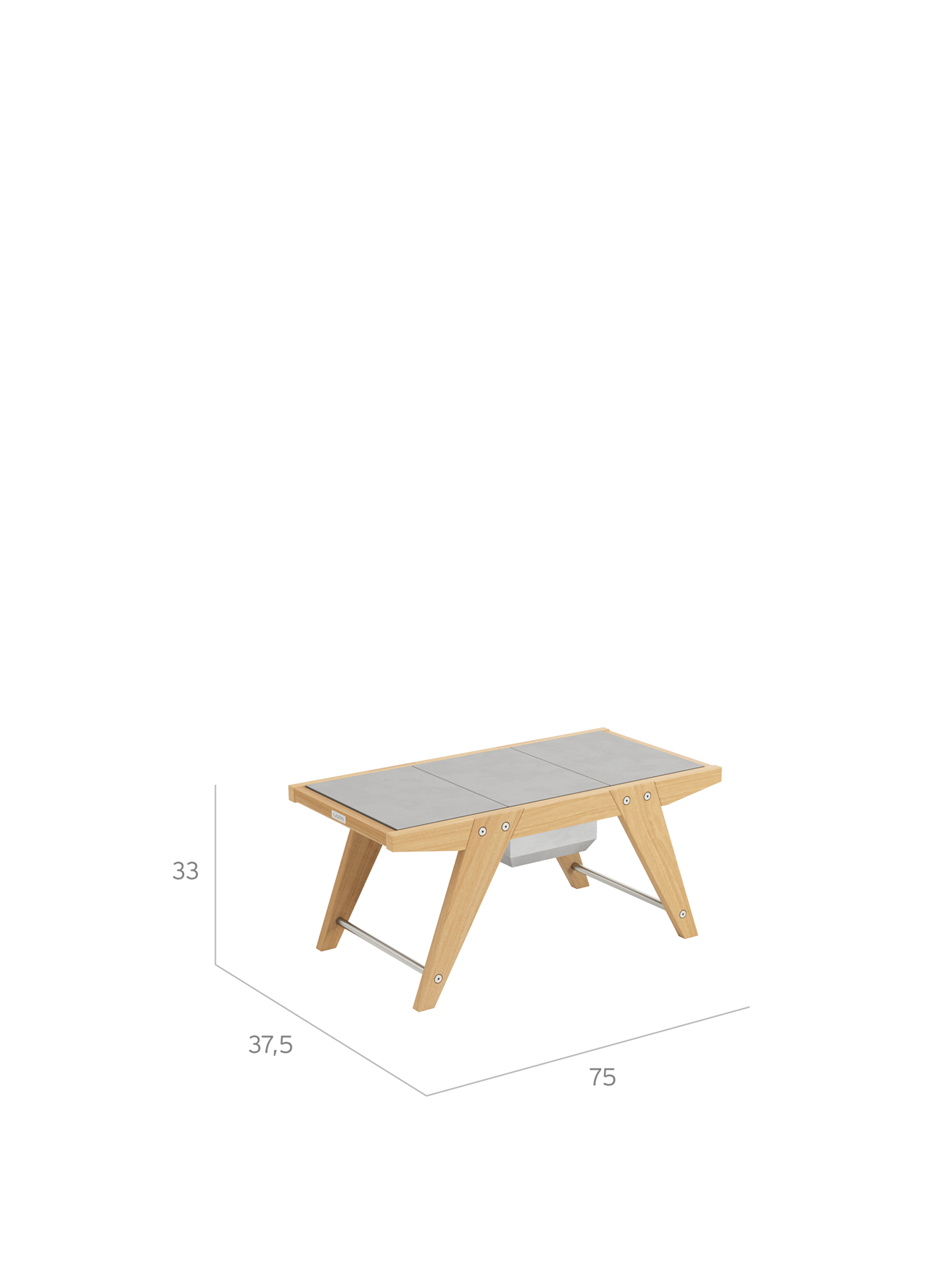 Die Doppia Beistelltische aus Teak sind in drei Varianten und mit Oberflächen aus Teak oder Kunstharz erhältlich. Die Tischplatte des rechteckigen Beistelltisches mit Einsatz lässt sich zu beiden Seiten hin öffnen. Im eingelassenen Edelstahlbehälter finden Utensilien Platz; mit Eis gefüllt, hält er sogar Getränke kalt.