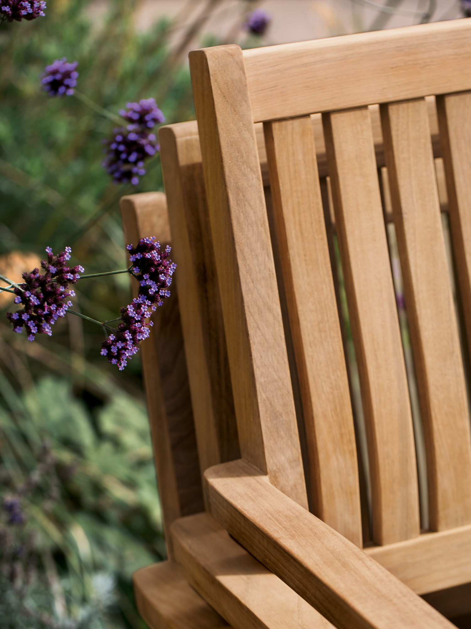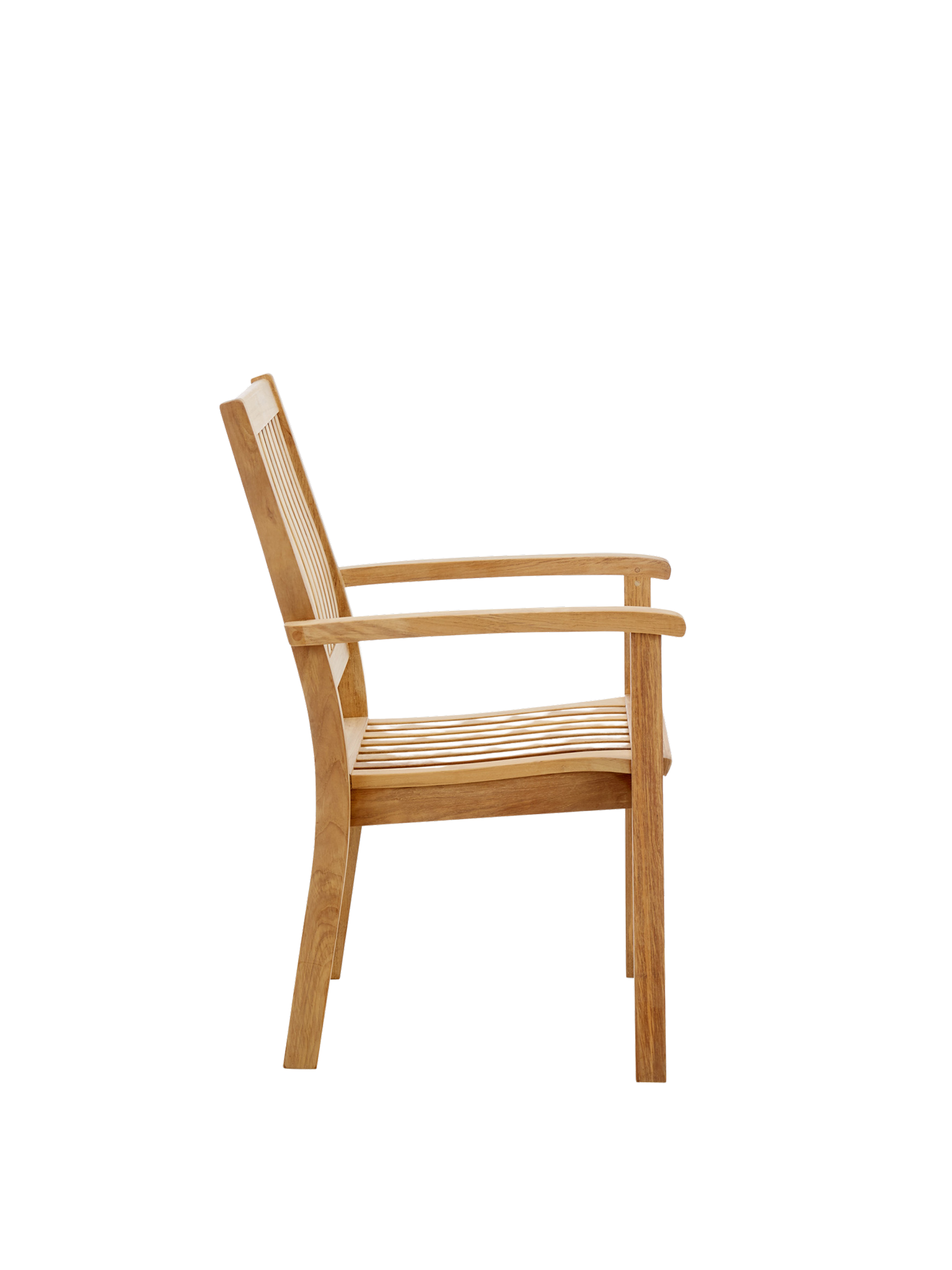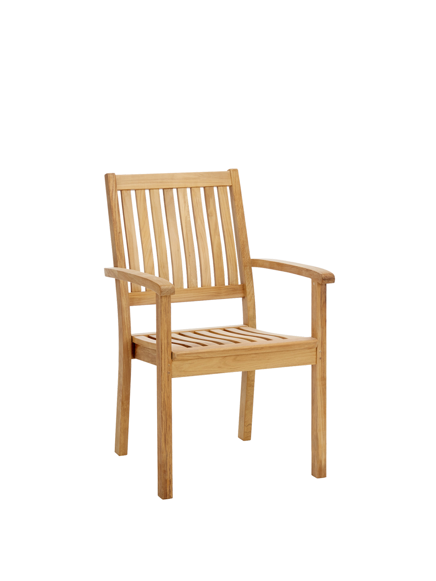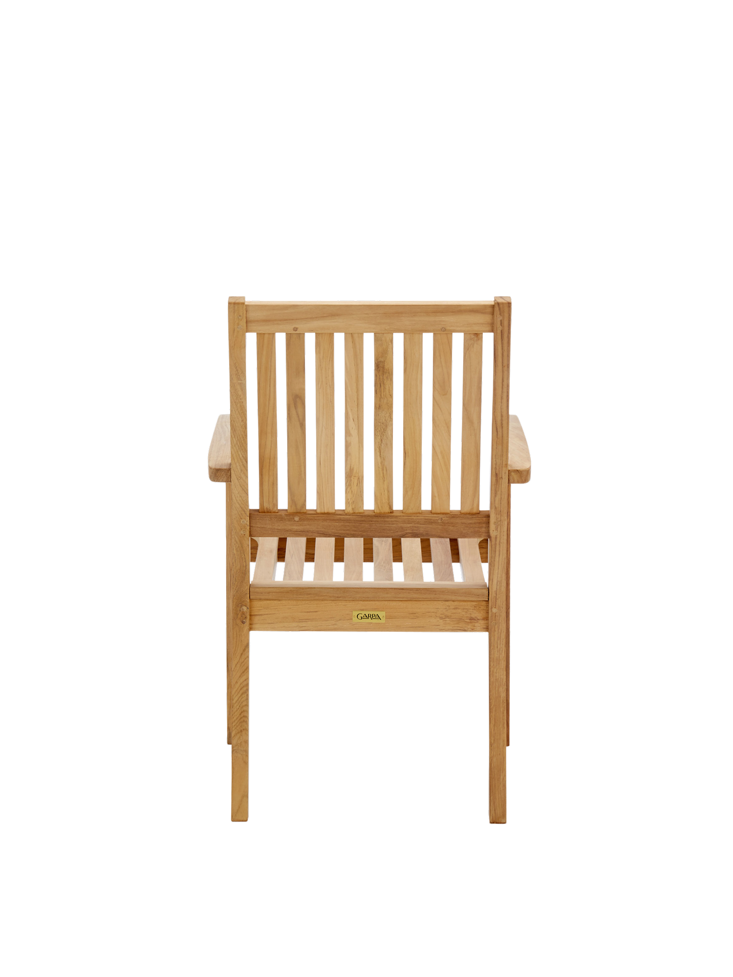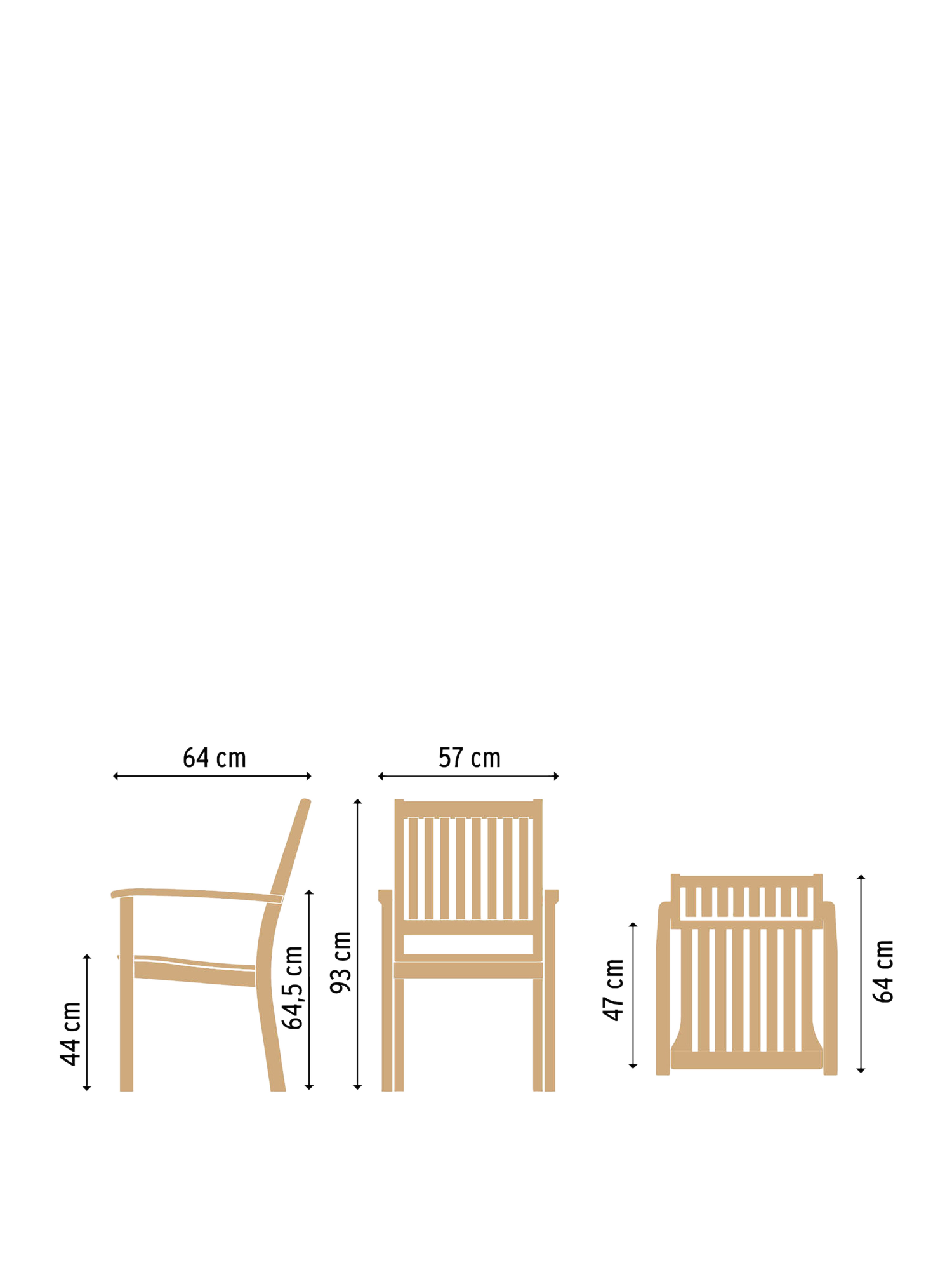 Der elegante Armlehnstuhl aus massivem Teak kann getrost jedem Wetter ausgesetzt werden. Seine Sitzfläche sowie die hohe Rückenlehne sind ergonomisch geformt und sorgen für eine entspannte Haltung. Die Armlehnen mit ihren gerundeten Knäufen schmeicheln den Händen. Der Armlehnstuhl lässt sich bequem und platzsparend stapeln.