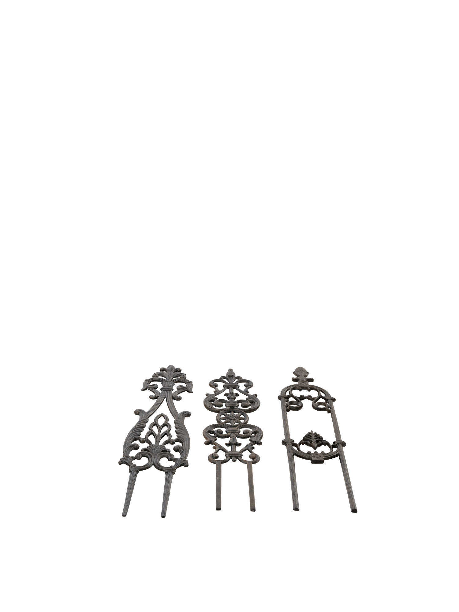 Die drei hohen Eisenornamente, jedes anders geformt, setzen bald Rost an und geben dem Garten eine Aura des Verwunschenen. Sie werden einfach ins Beet gesteckt und geben Stauden und Sommerblühern zuverlässigen Halt.