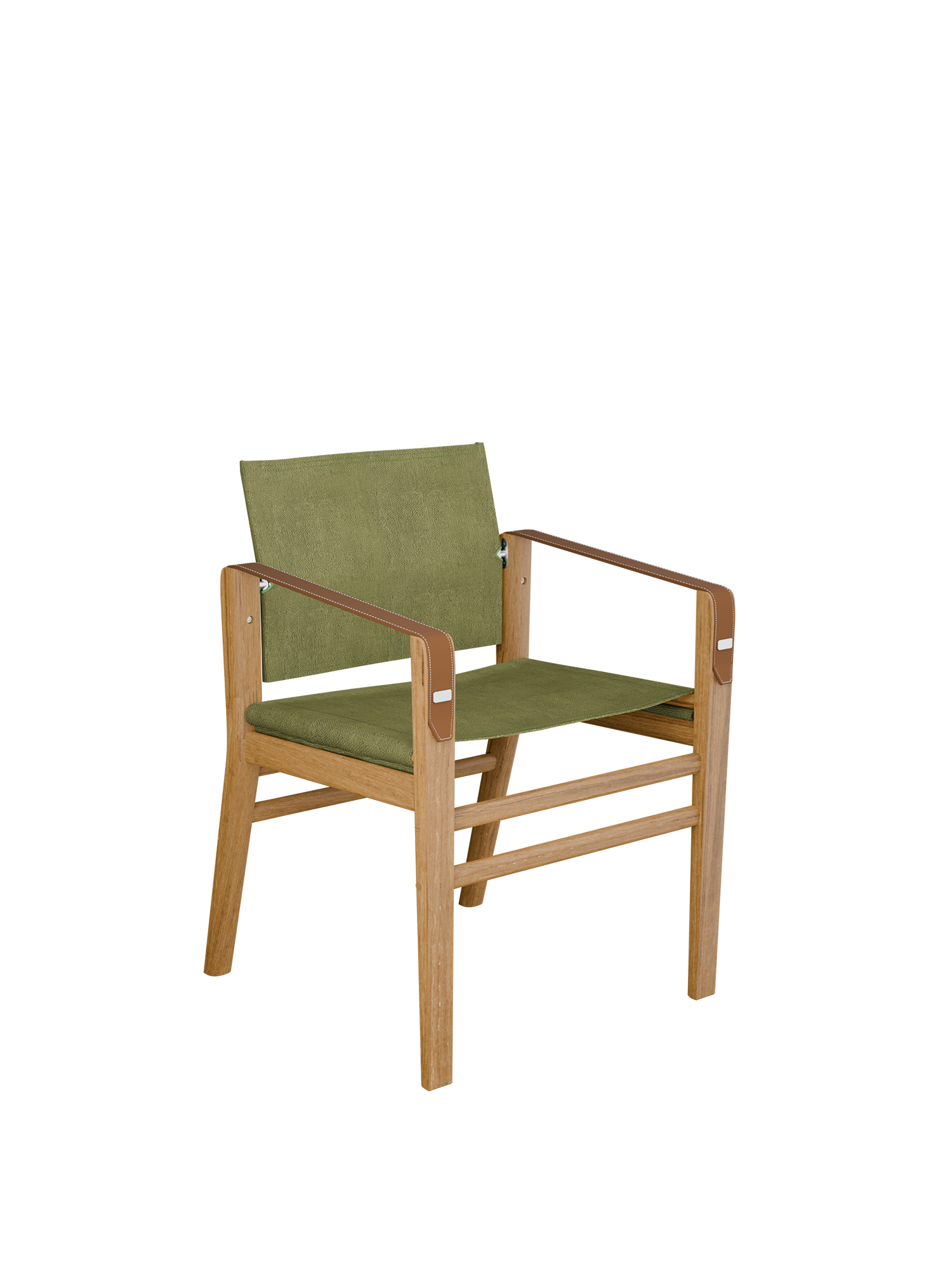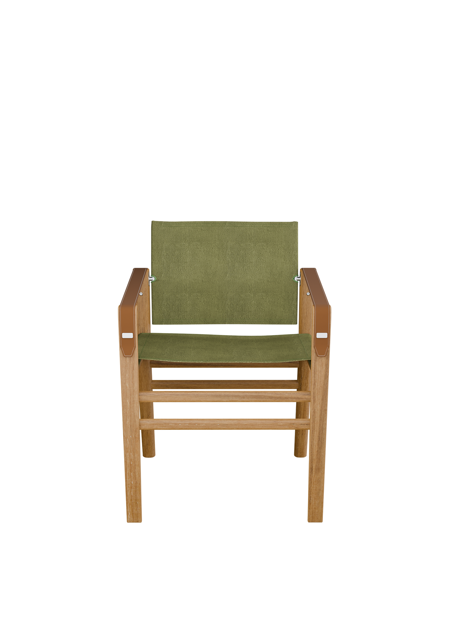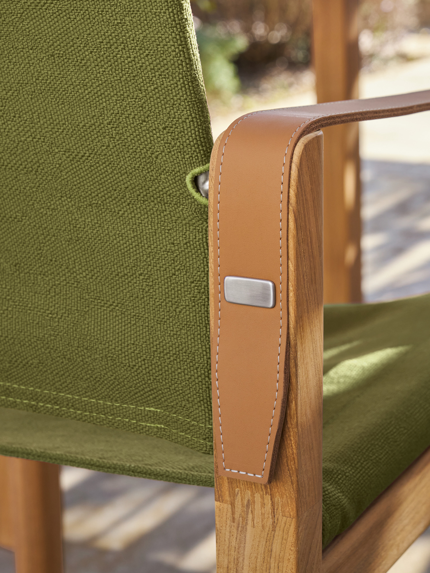 The chair is made from FSC-certified plantation teak and includes functional stainless-steel details. Its armrests in quilted genuine leather will develop a natural patina over time. We recommend using the chair in covered outdoor areas or protecting it outdoors with a separately available cover.