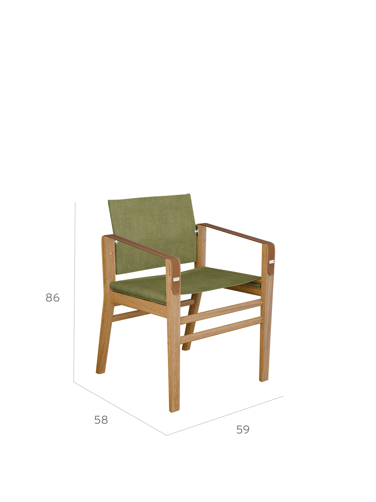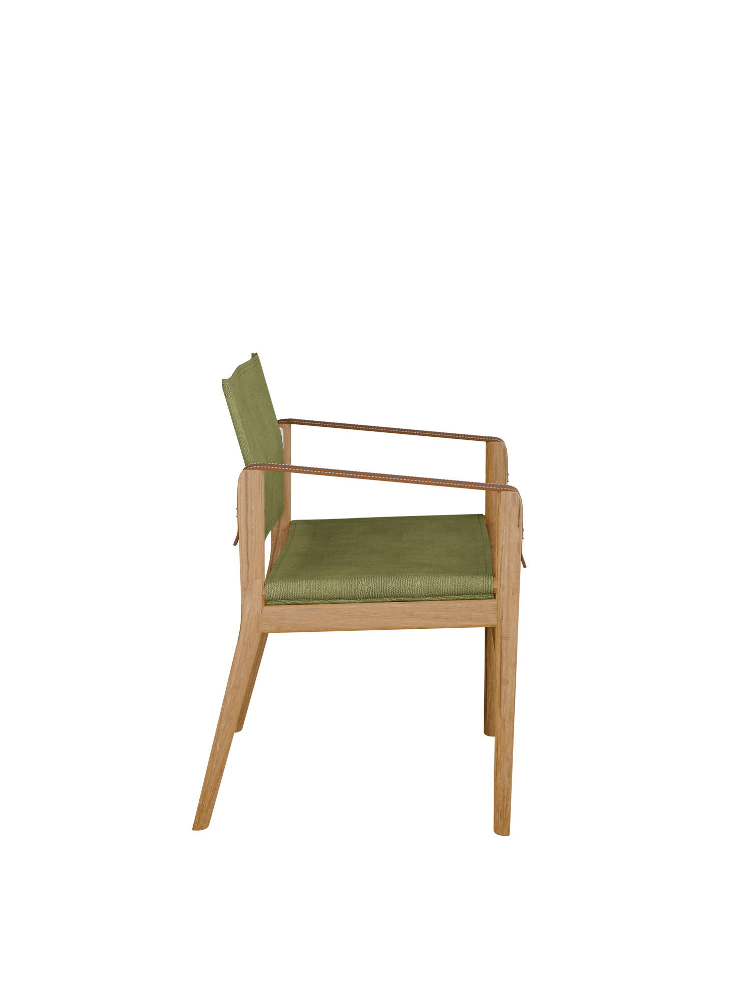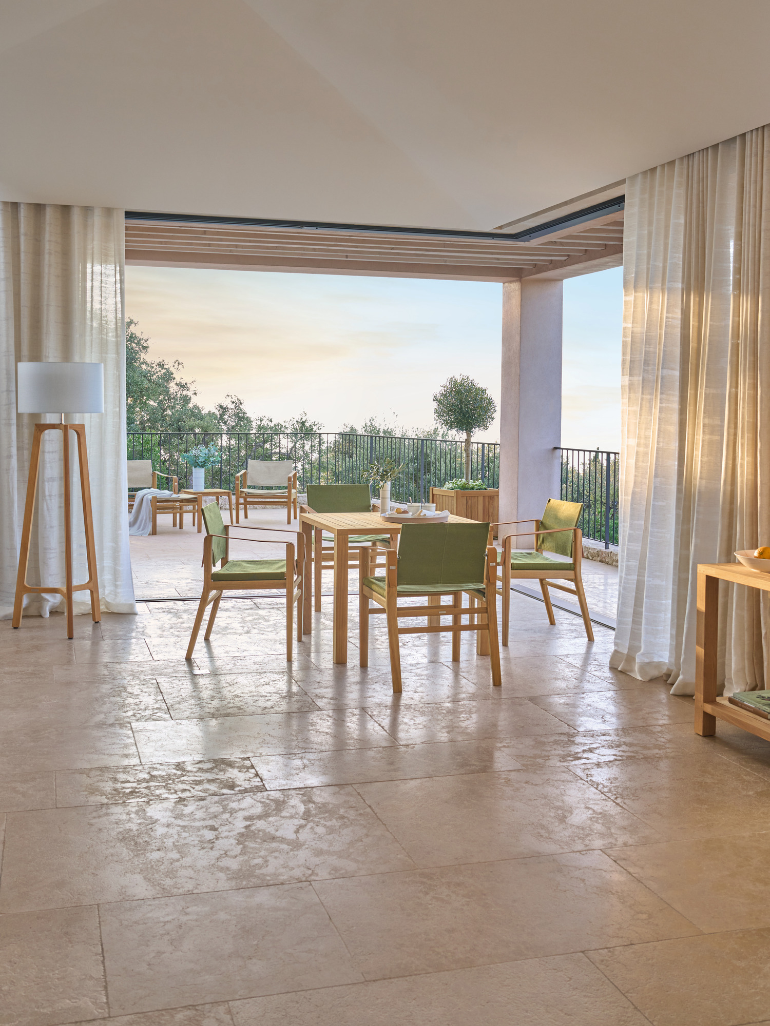 The chair is made from FSC-certified plantation teak and includes functional stainless-steel details. Its armrests in quilted genuine leather will develop a natural patina over time. We recommend using the chair in covered outdoor areas or protecting it outdoors with a separately available cover.