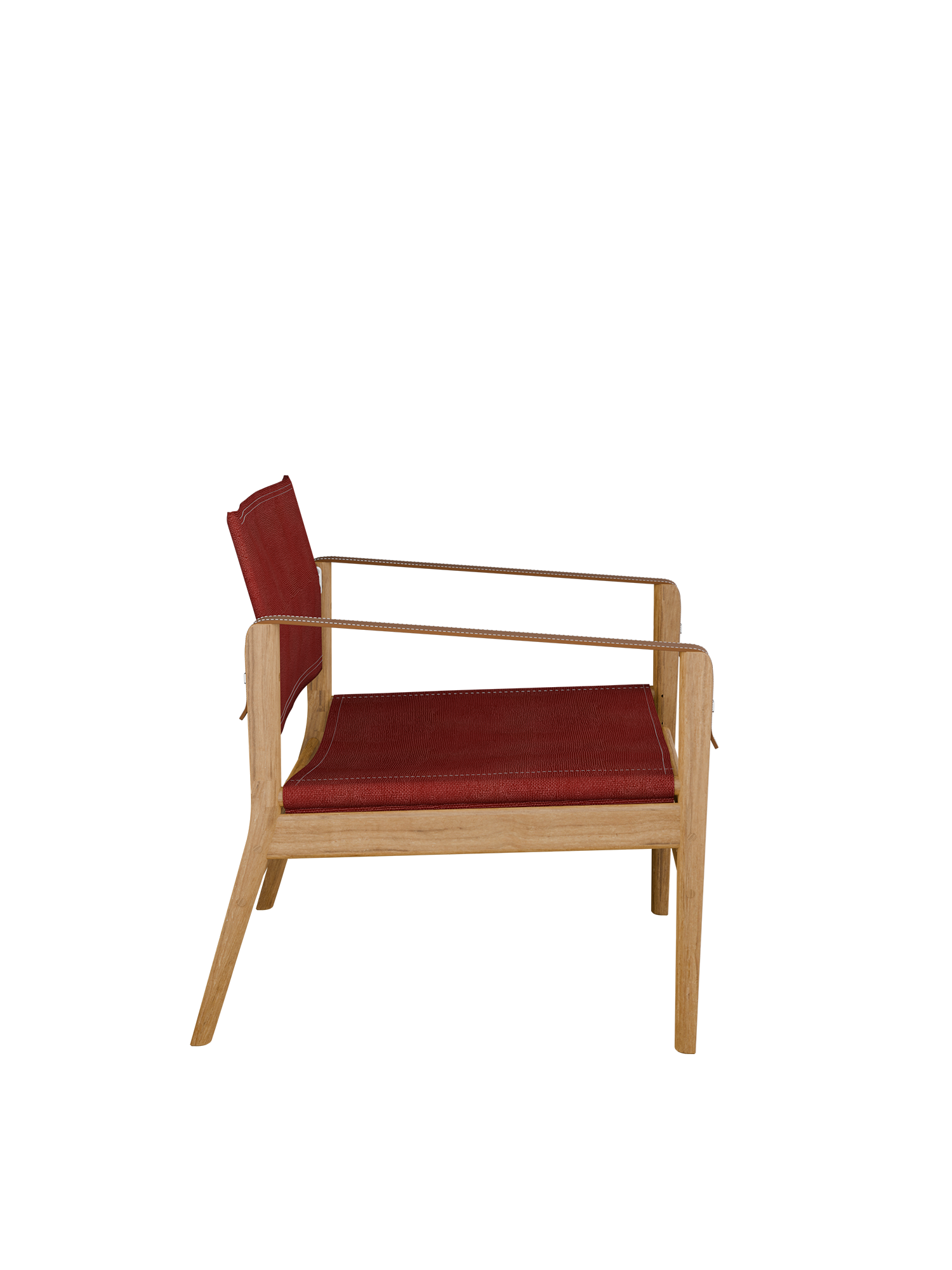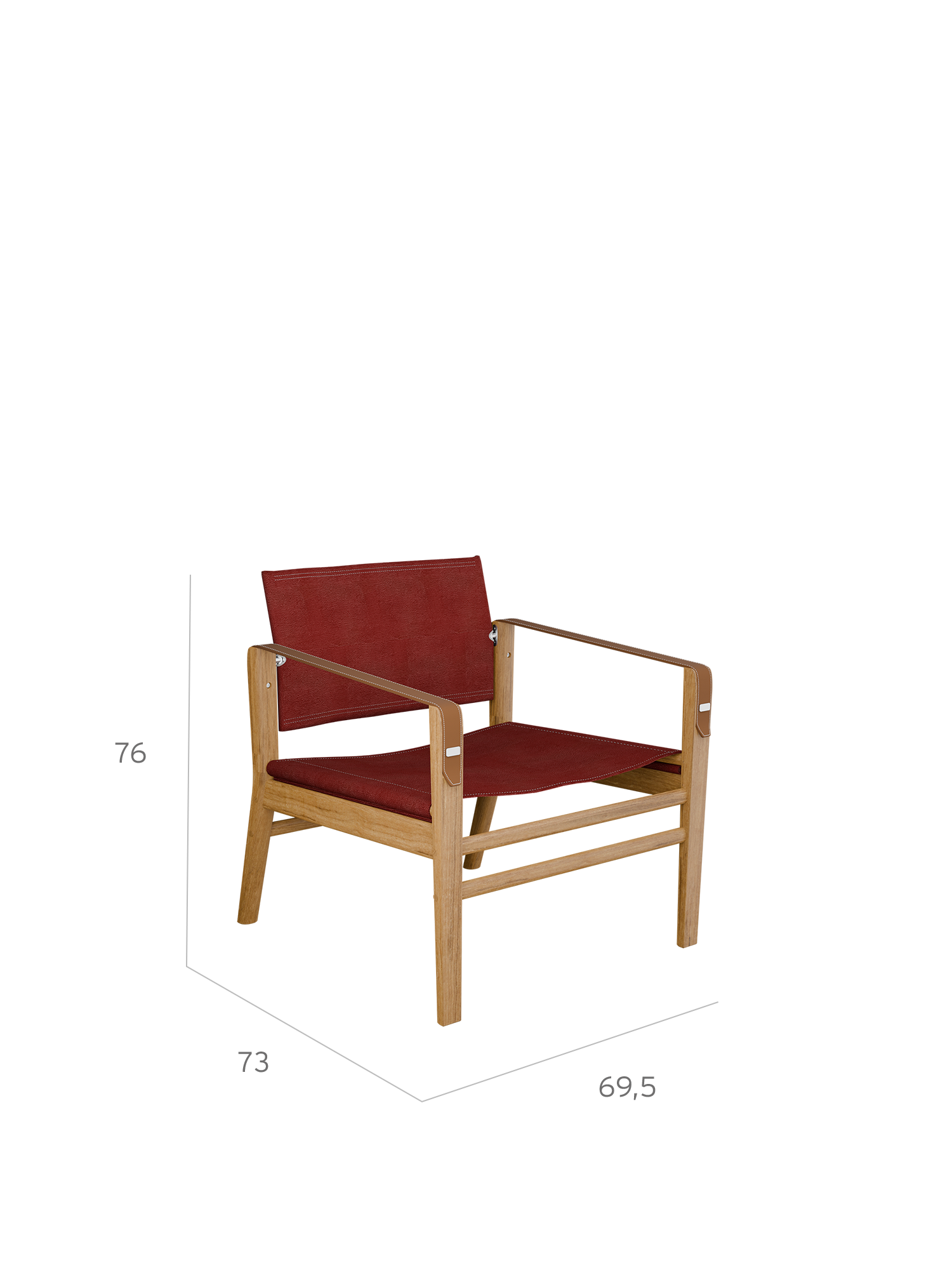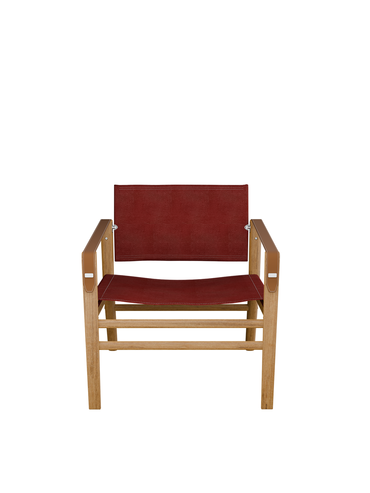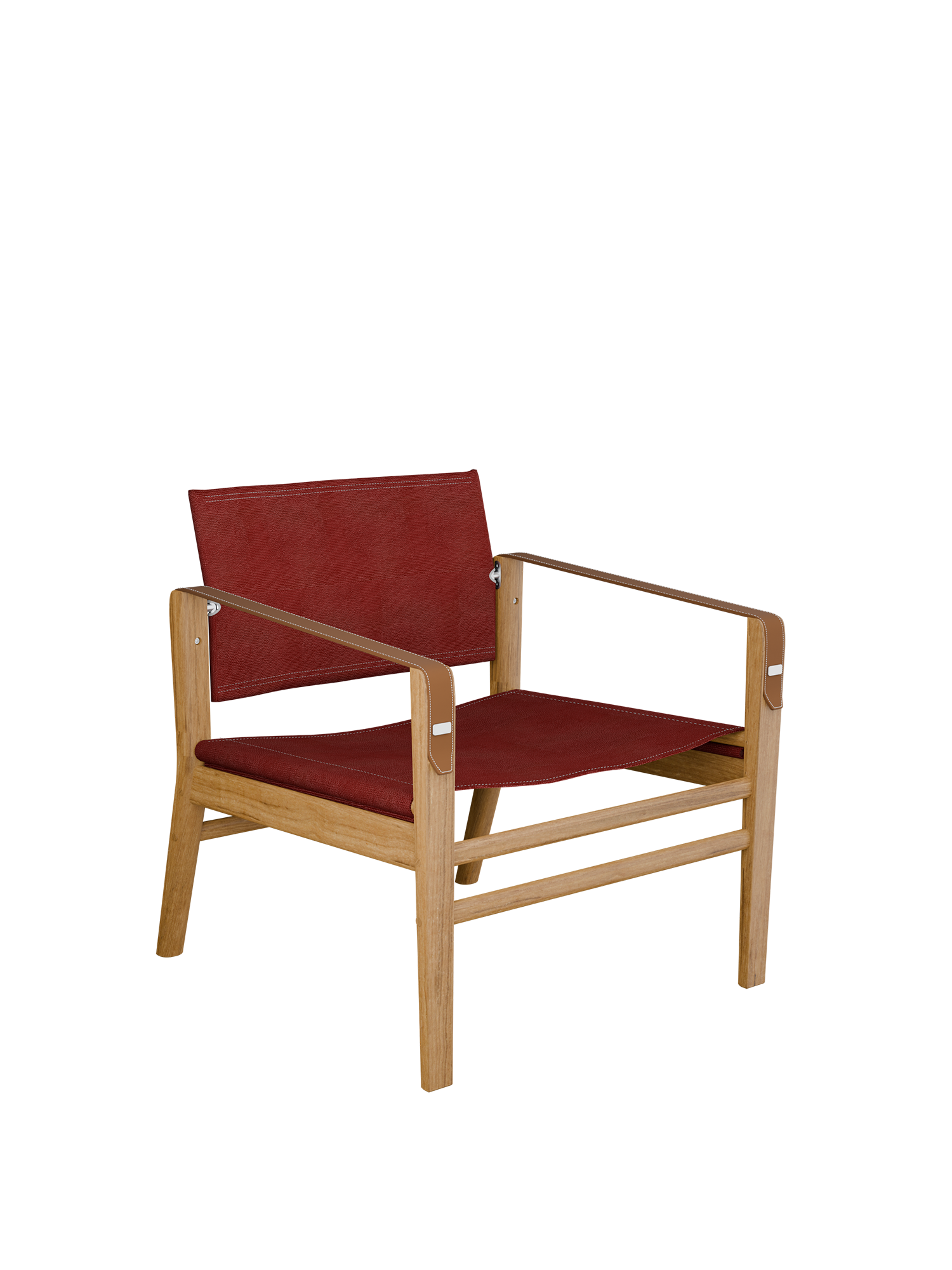 The armchair is made from FSC-certified plantation teak and includes functional stainless-steel details. Its armrests in quilted genuine leather develop a natural patina over time. We recommend using the chair in covered outdoor areas or protecting it outdoors with a separately available cover.