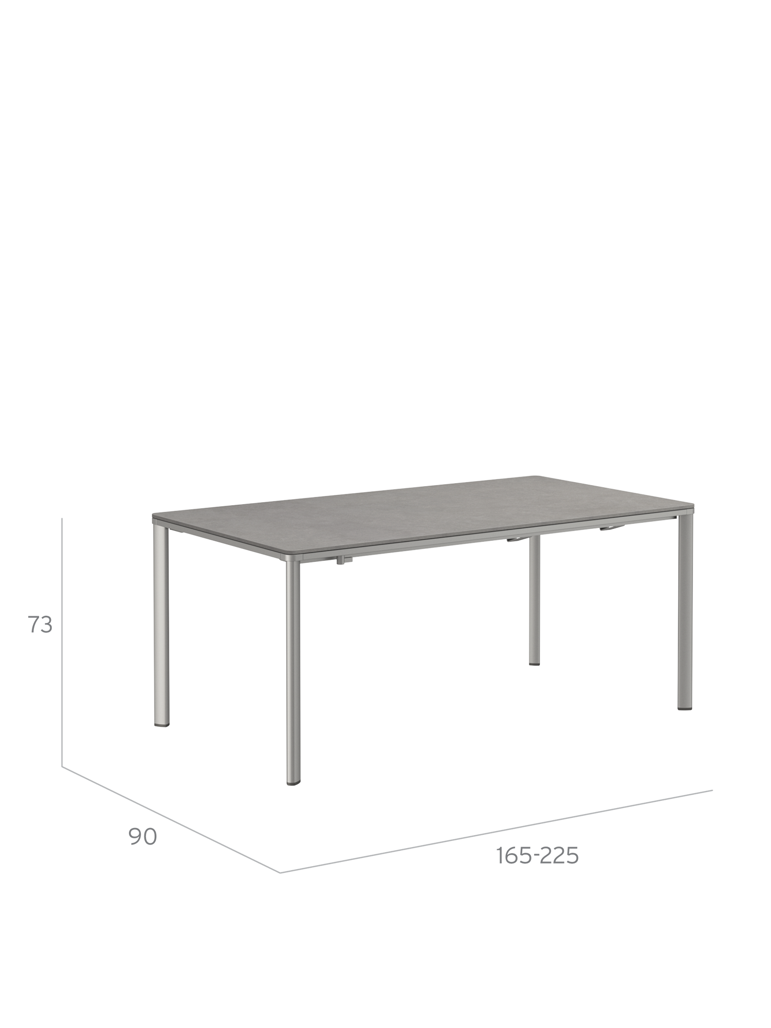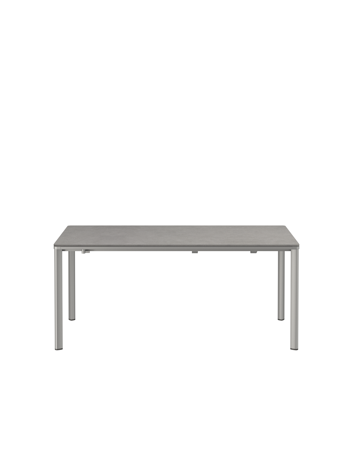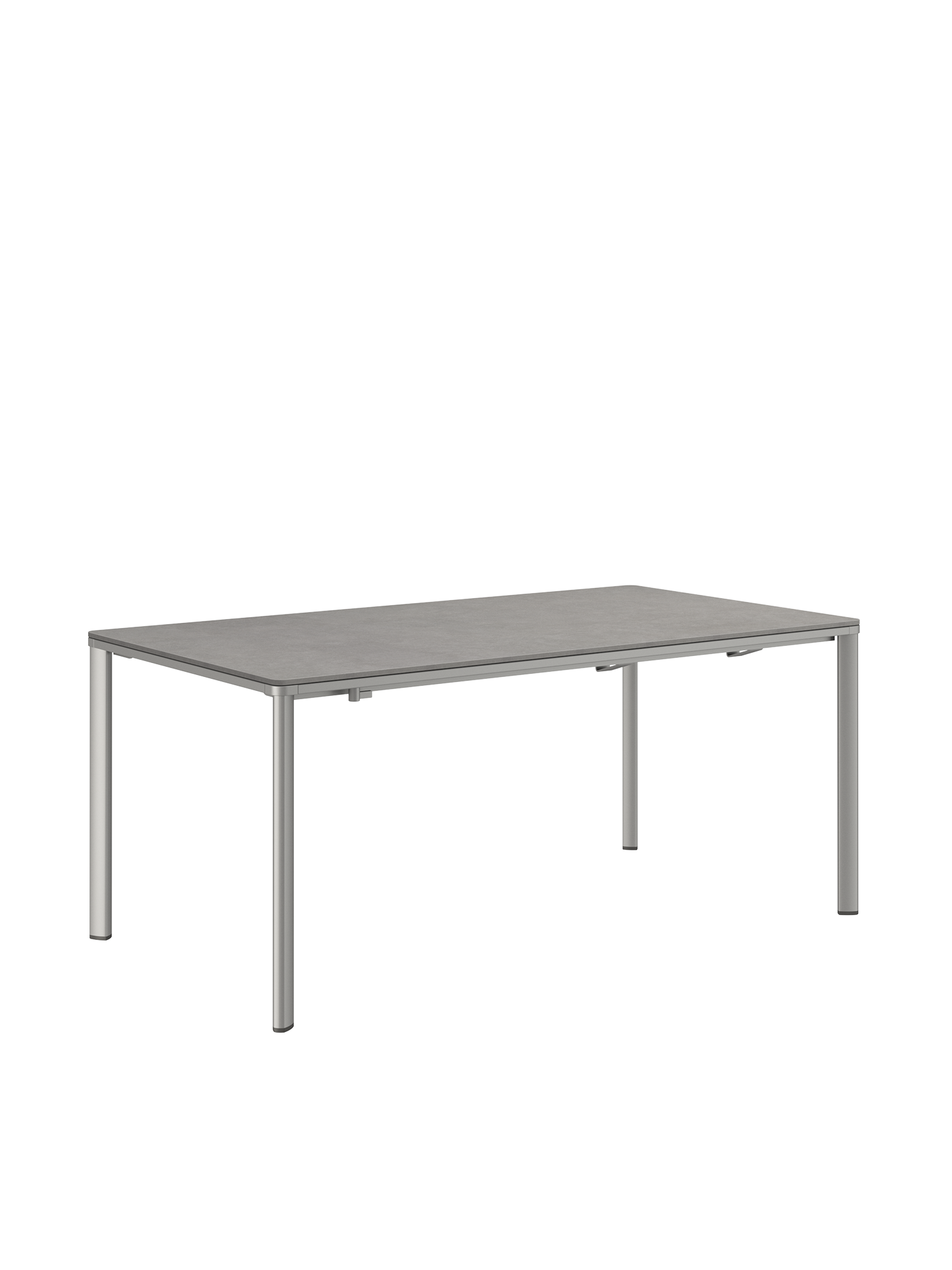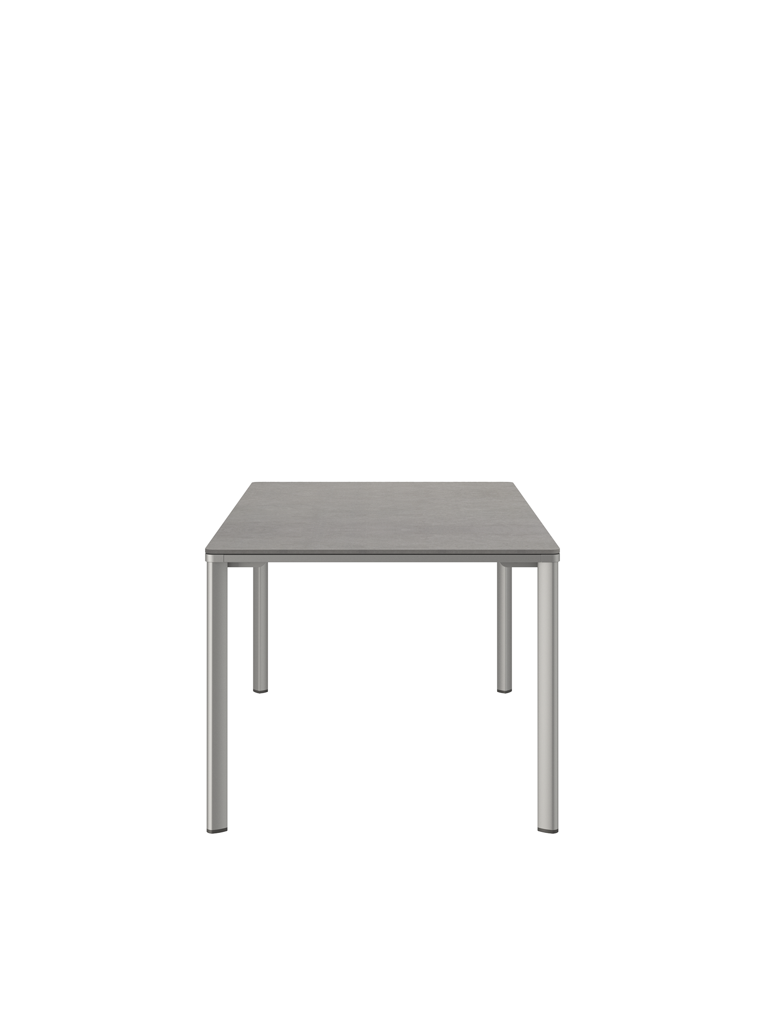 The specially anodised silk frames of the Portland table allows it to be combined with the chairs of the Temper series. Four slender legs carry a top with a frame that appears to be made of a single piece, and that follows the rounding of the legs in the corners. The surface is made of high-quality synthetic resin in the colour Shade.