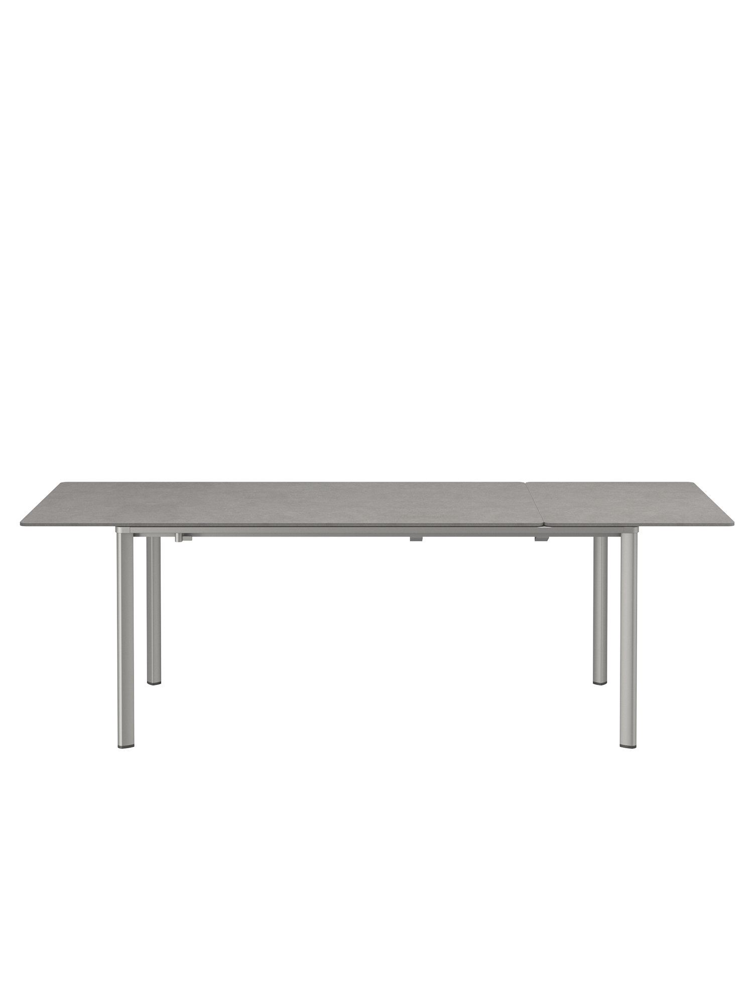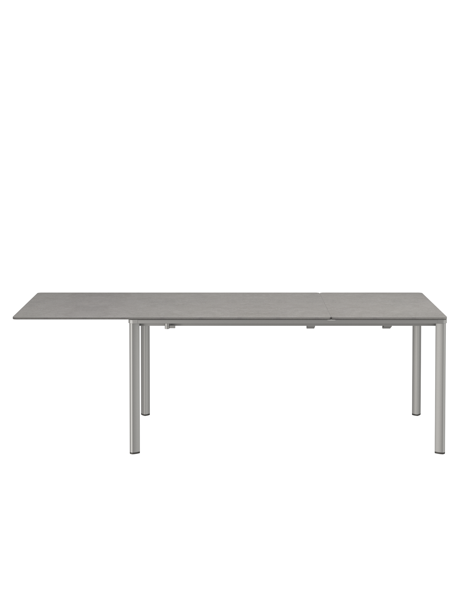 The easy operating action of the extending table ensures a smooth transition from occasional table to dining table. If more guests arrive, an extra section provides additional space. The table top of the extending table can be slid out and extended fully. The additional section of the table is mounted under the tabletop. The extended table top can be centred, or if more legroom is required, positioned to one side.