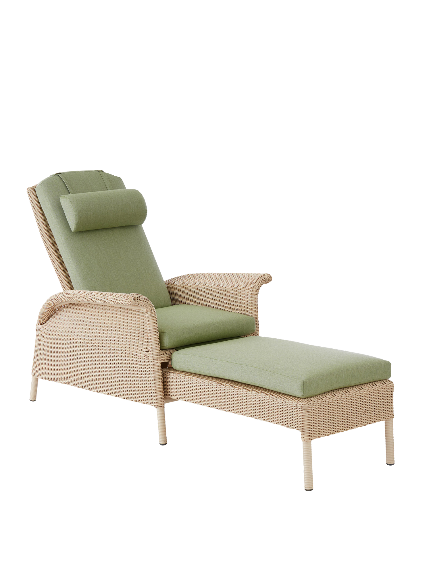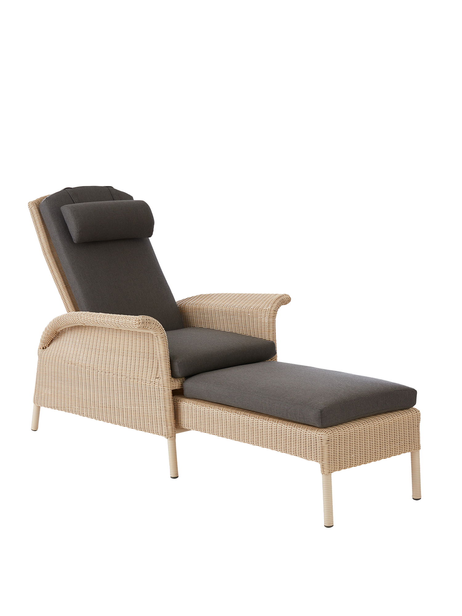 The shape of the steamer chair in high-quality, weatherproof synthetic fibre is reminiscent of the 1920's, of Art Deco, and the period in which its classic Loom forebears came into being. The seat is roomy, the backrest ia adjustable to seven postitions. With the foot section retracted, the steamer chair becomes a comfortable armchair.