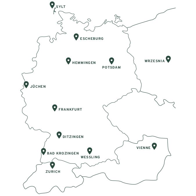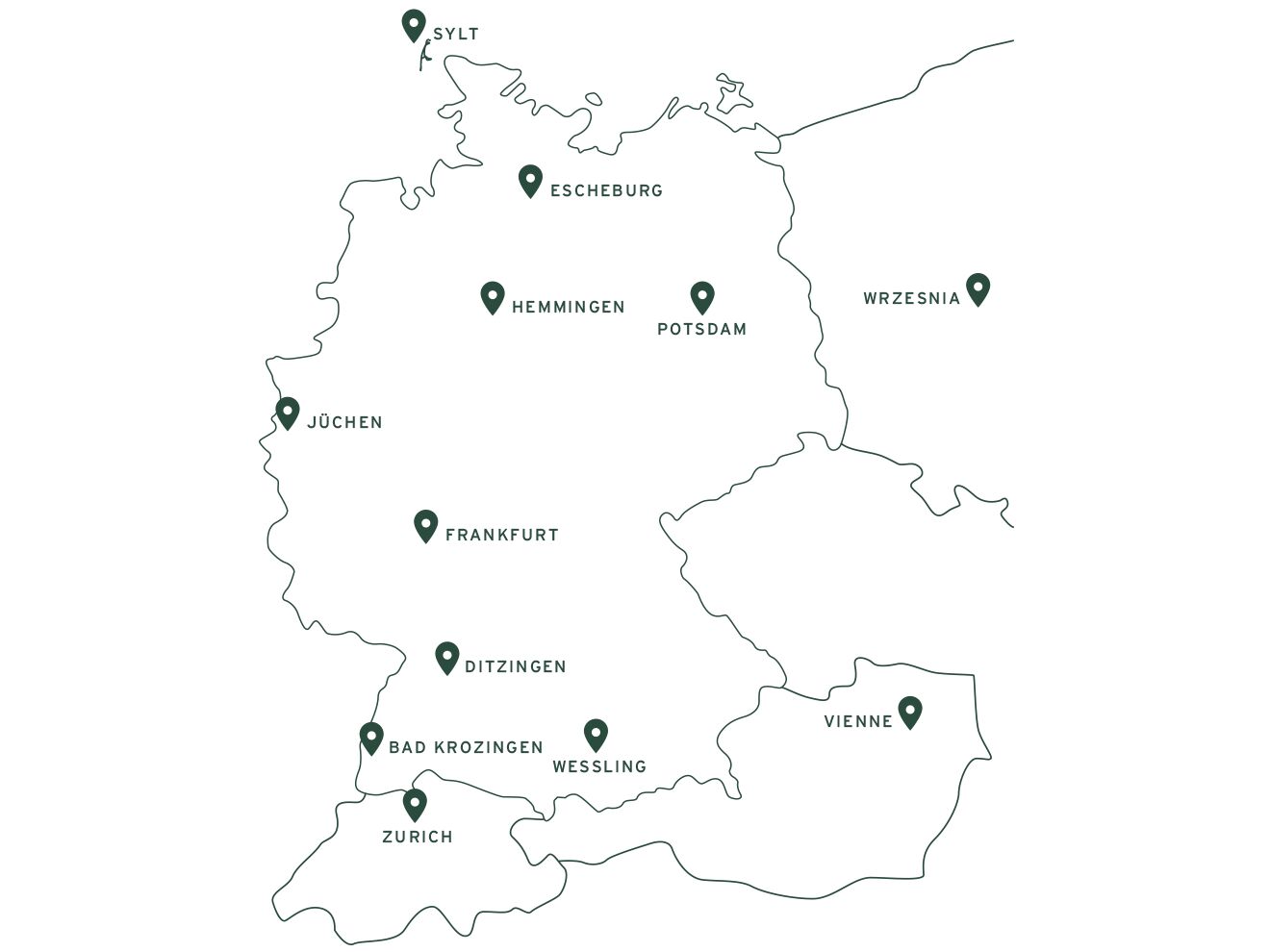 Travelling or planning a weekend getaway? The adjacent overview map shows the regional locations of our showrooms in Germany, Austria, Switzerland, and Poland.