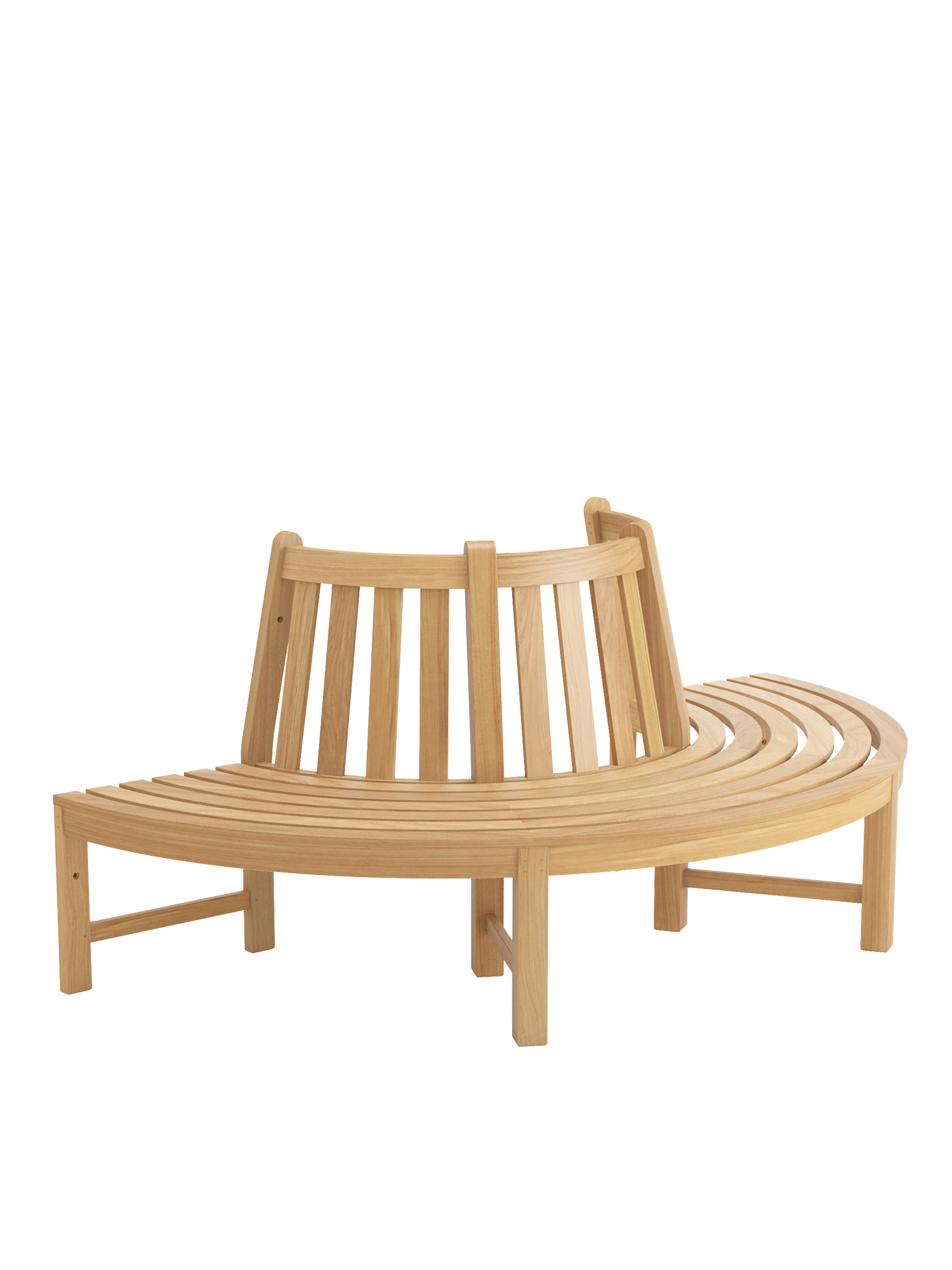 The tree seat of teak invites to a classic round. With an inner diameter of 84 cm and a seat depth of 48 cm, it embraces the tree – either in a semicircle or completely. It fits completely or half-way around the family tree. For a full circle, please order two semi-circles.