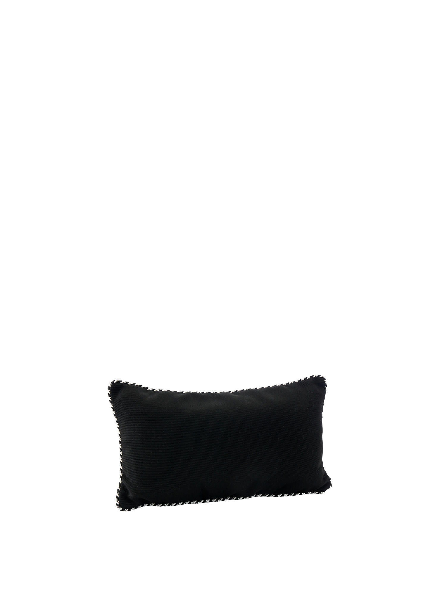 Das längliche Kissen mit einem schwarz-weißen Keder ist mit Naturfedern gefüllt.