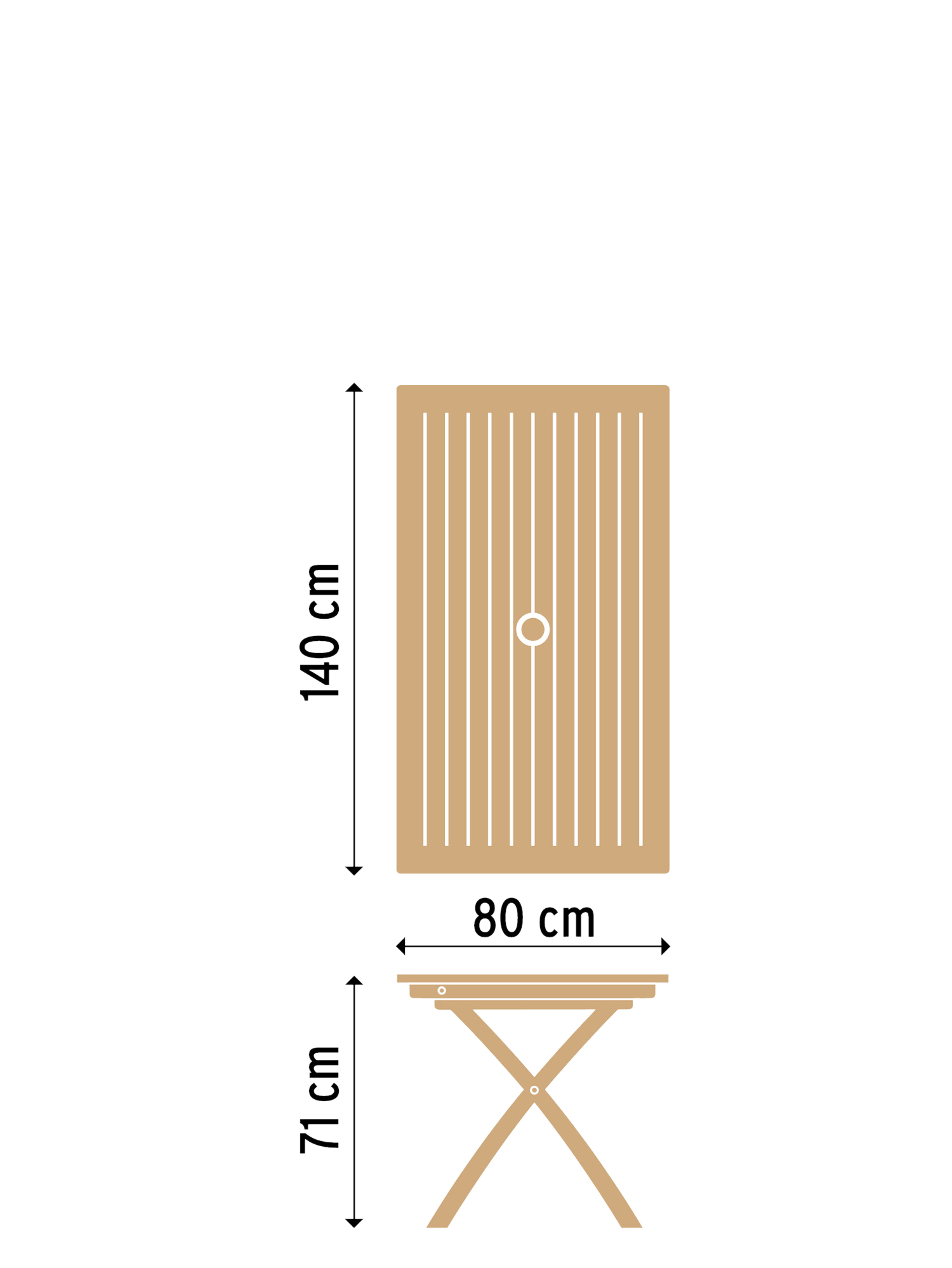 Aufgrund des simplen Klappmechanismus lässt sich der Tisch komfortabel transportieren und platzsparend verstauen. Das Schirmloch in der Mitte der Platte kann an sonnenärmeren Tagen mit einem Teakstopfen verschlossen werden.