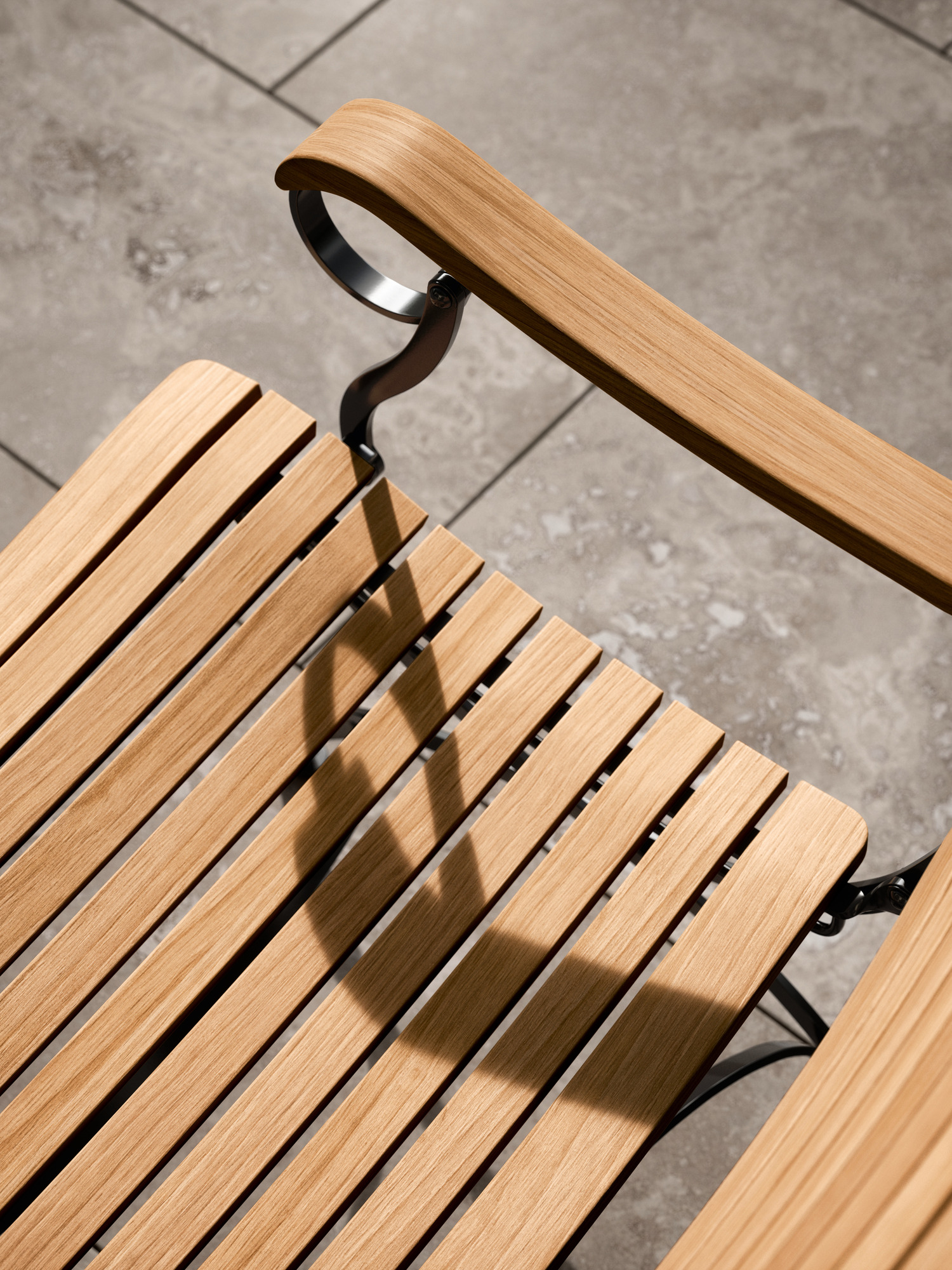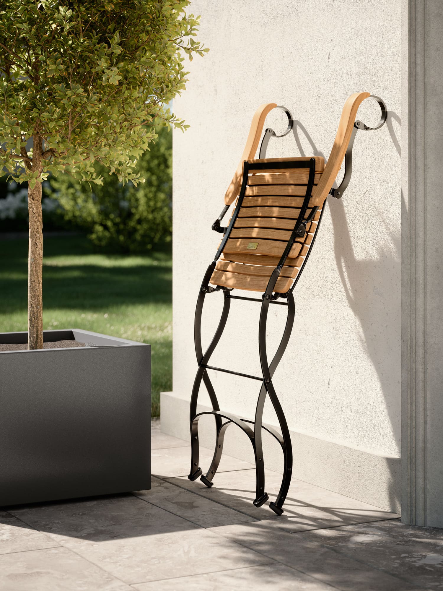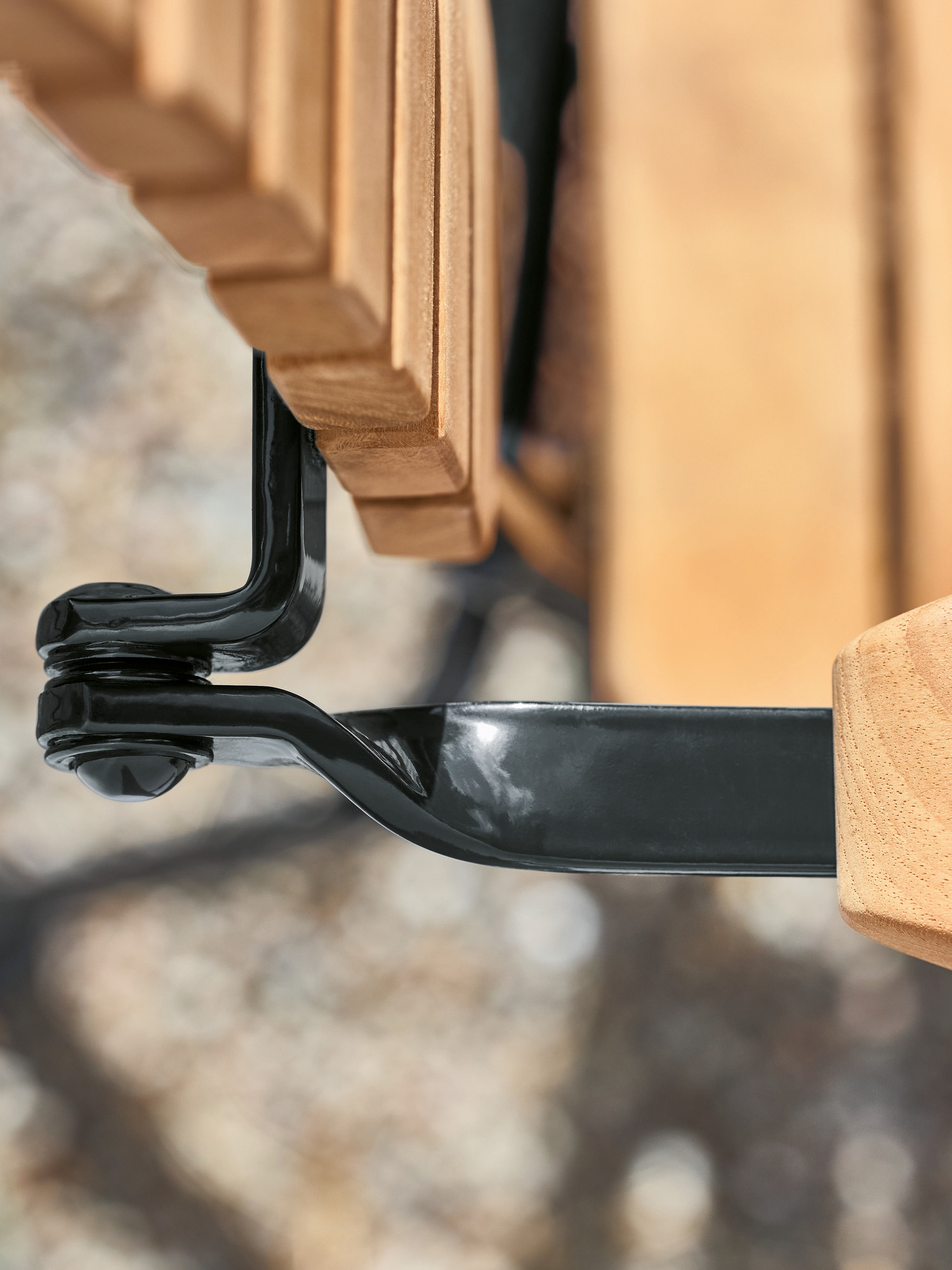 Alle Drehverbindungen aus Edelstahlbolzen sind rostfrei gelagert - für eine dauerhafte Funktion im Freien. Laufrollen aus hochwertigem Polyamid, die unter der Sitzfläche angebracht sind, unterstützen leichtgängiges Klappen und schonen die beschichteten Metallteile. Das Gestell besteht aus verzinktem und damit rostgeschütztem Stahl, graphitschwarz pulverbeschichtet. Zusammengefaltet ist der Armlehnstuhl nur 15 Zentimeter schmal. Fußgleiter aus abriebfestem Kunststoff schützen wertvolle Böden vor Kratzern.