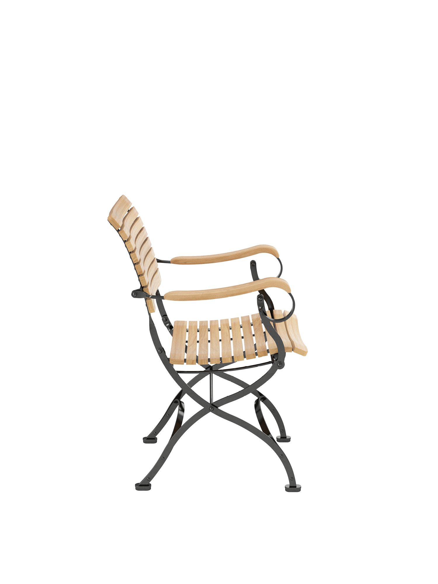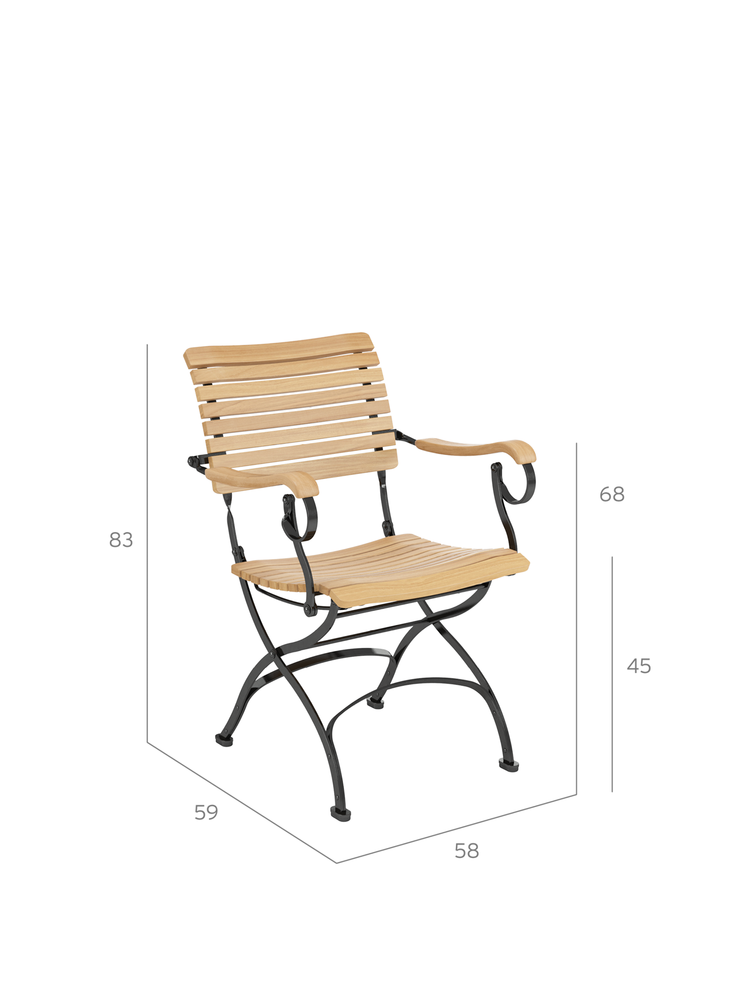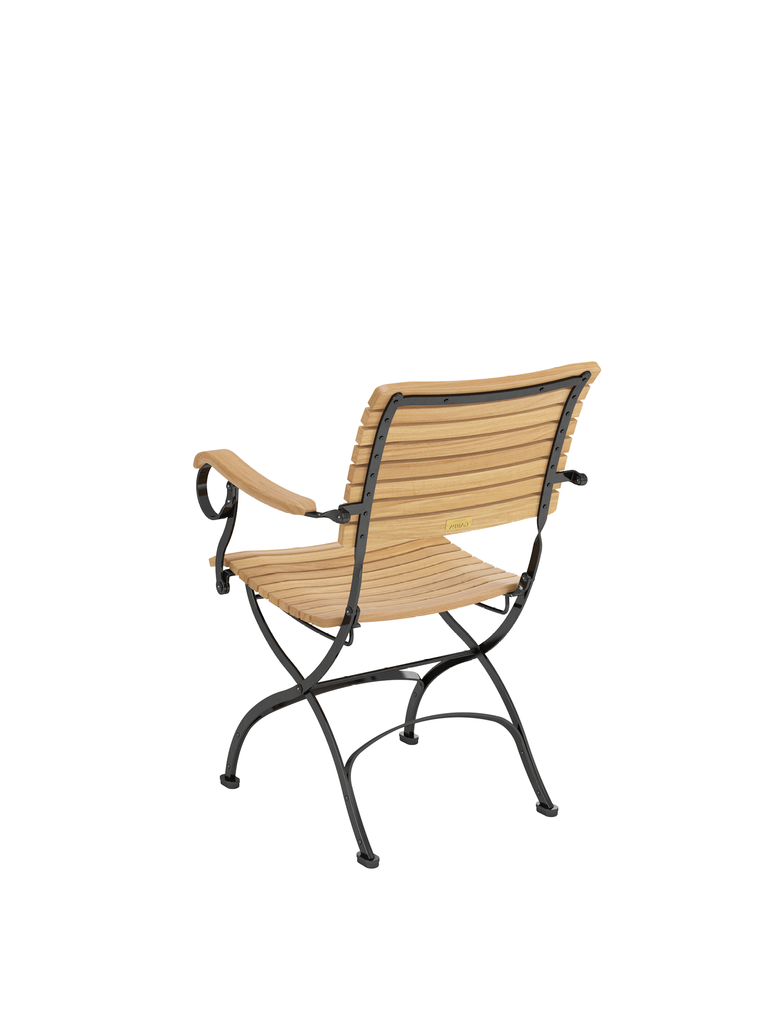 Er gilt als Prototyp des Gartenstuhls, nur sitzt man heutzutage ungleich bequemer. Garpa hat das Original für höchste Ansprüche perfektioniert. Die massiven Teakleisten von Sitz und Rückenlehne folgen der Anatomie des Körpers, die Armlehnen schmeicheln der Hand und entlasten den Körper. Das Gestell besteht aus verzinktem, pulverbeschichtetem Stahl. Zusammengefaltet ist der Armlehnstuhl nur 15 Zentimeter schmal.