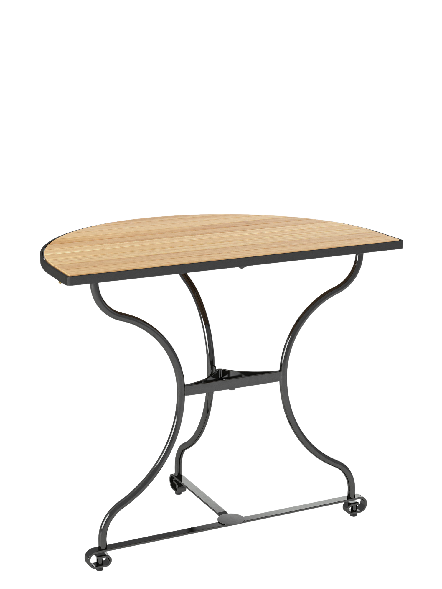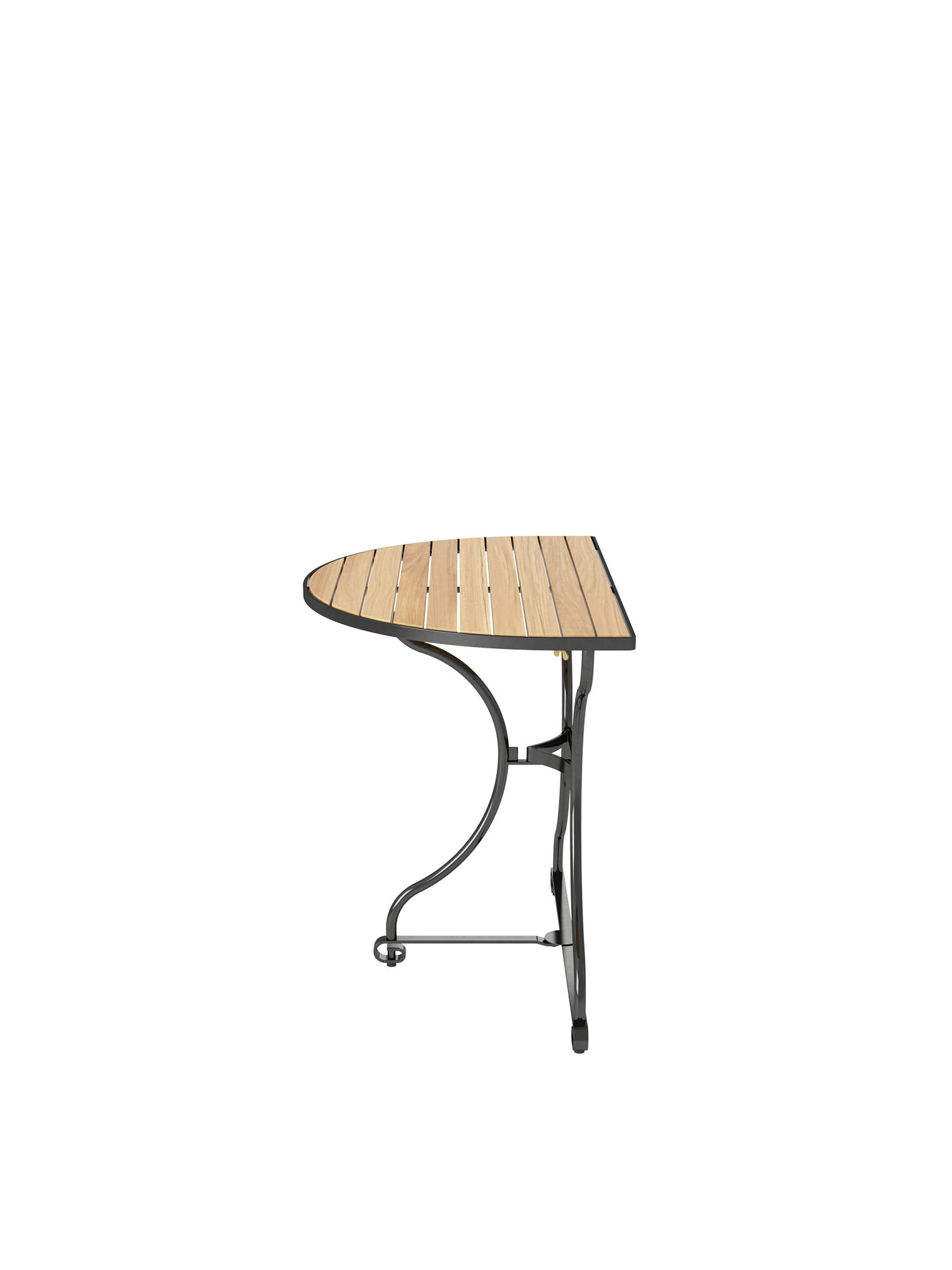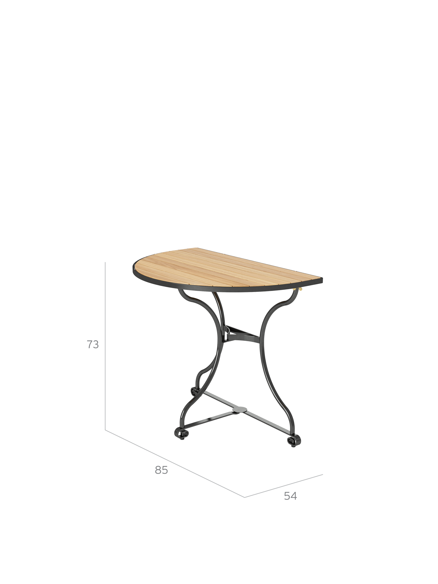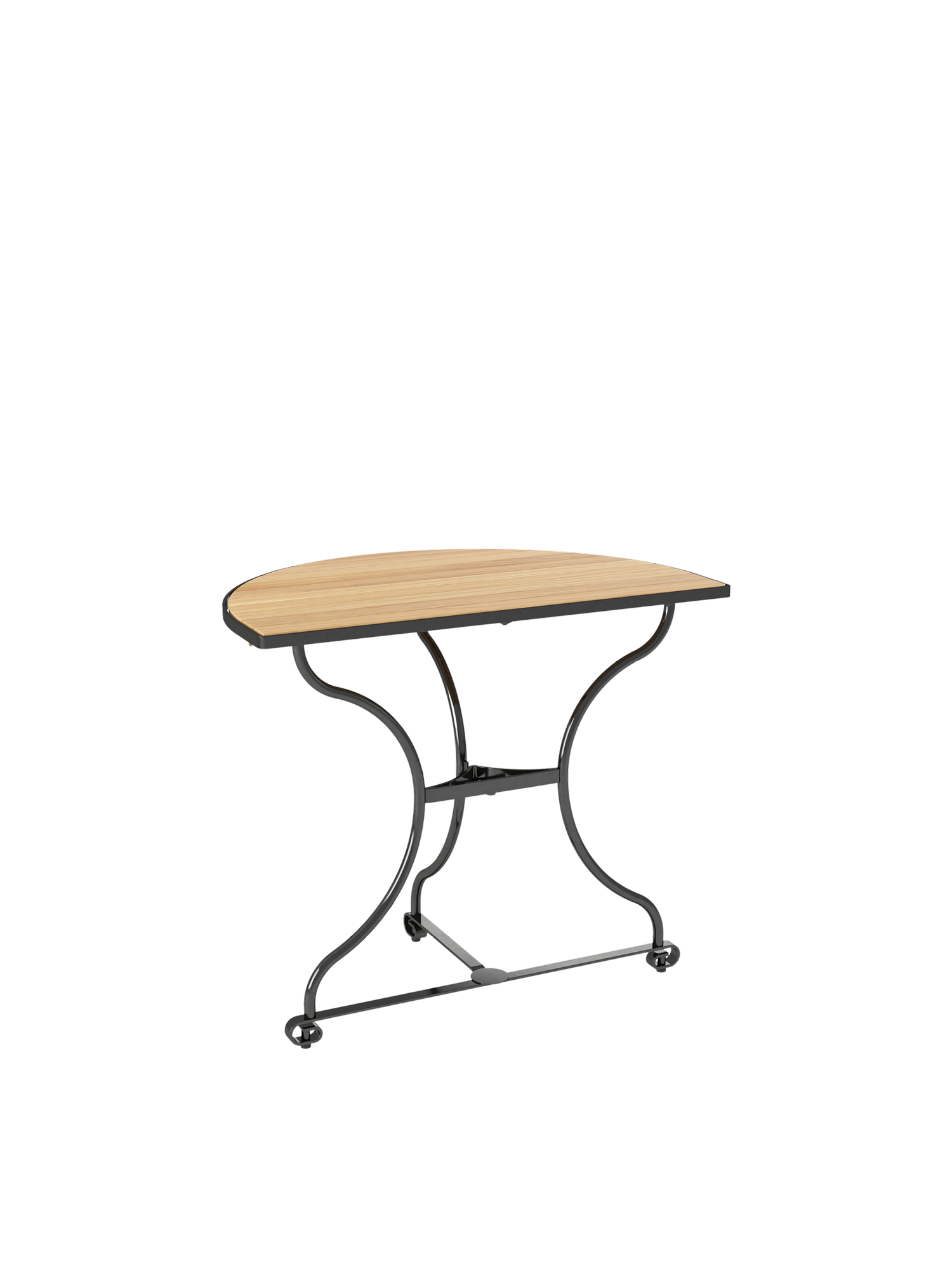 Der klappbare, halbrunde Tisch hat ein Gestell aus verzinktem, pulverbeschichtetem Stahl, die Tischplatte besteht aus Teakleisten, die in einem Stahlreif gelagert sind. Fußgleiter aus abriebfestem Kunststoff schützen wertvolle Böden vor Kratzern.