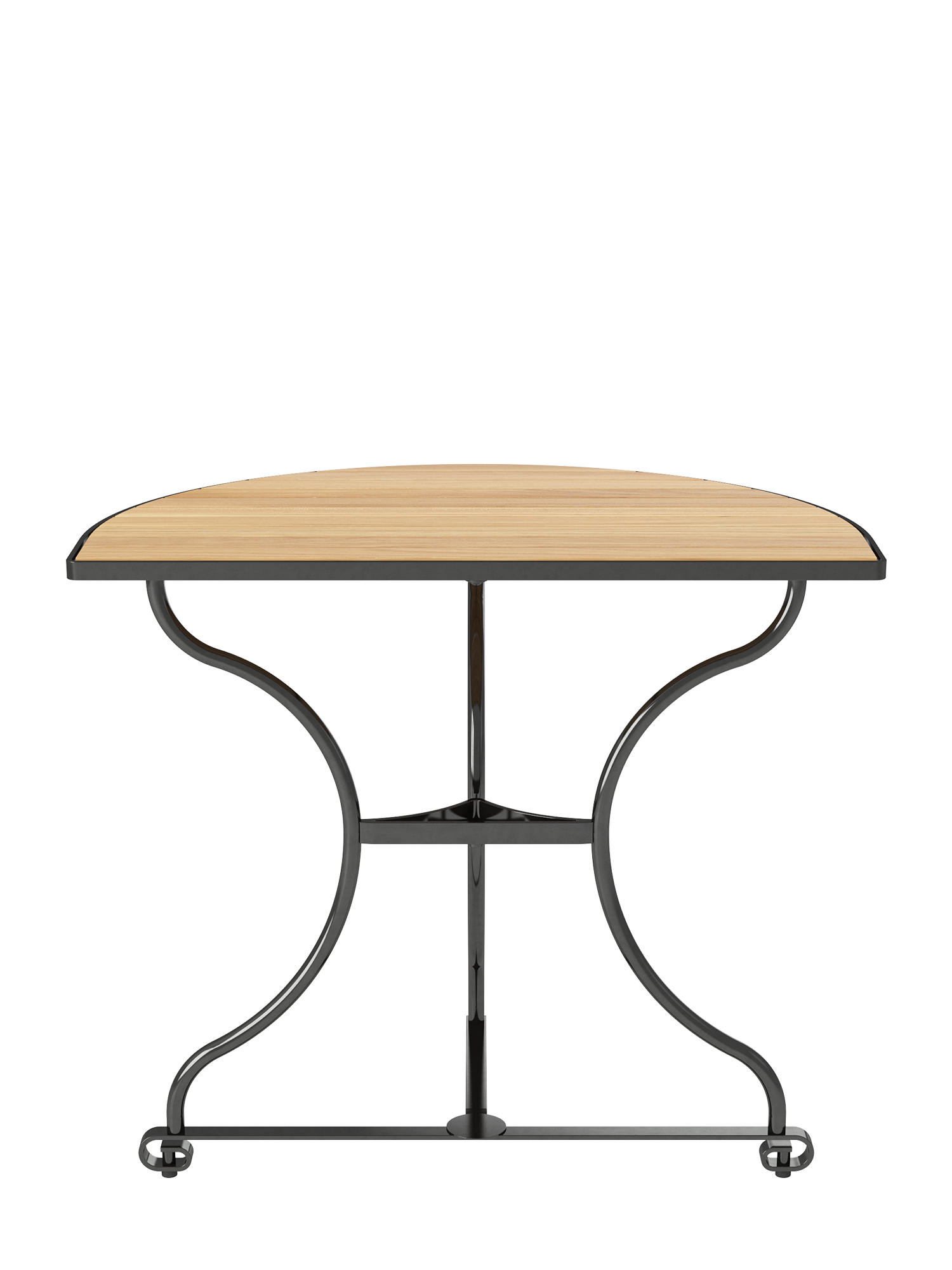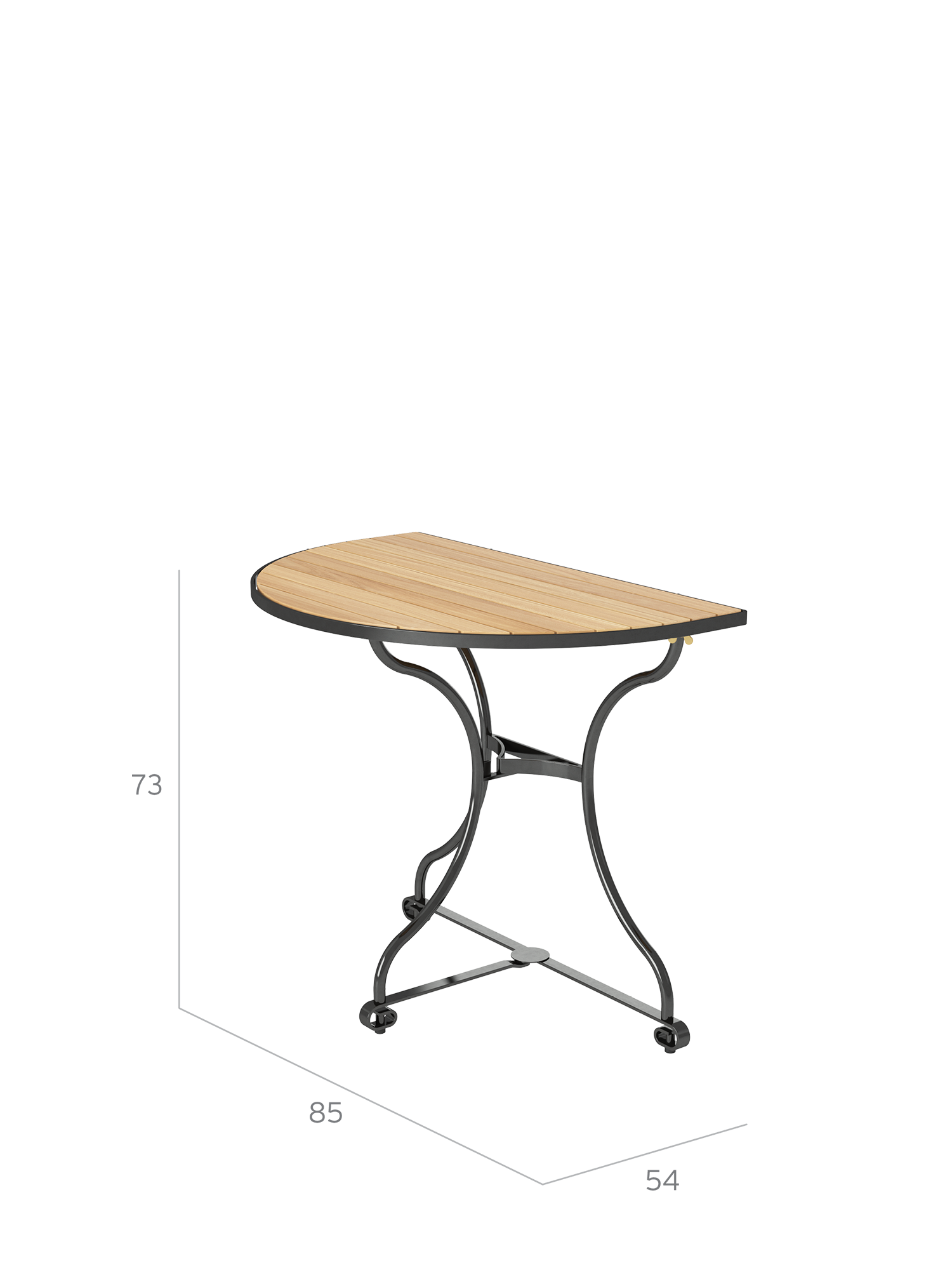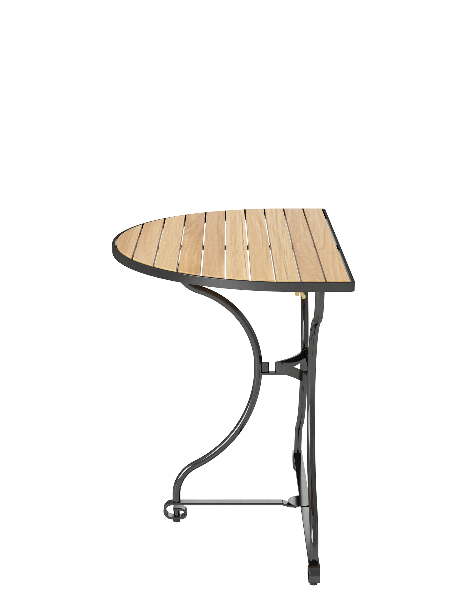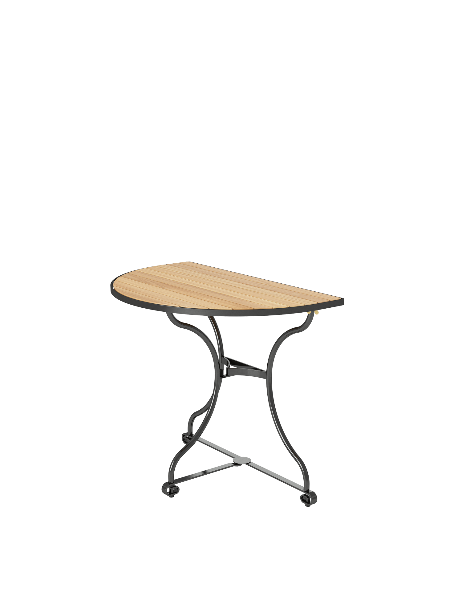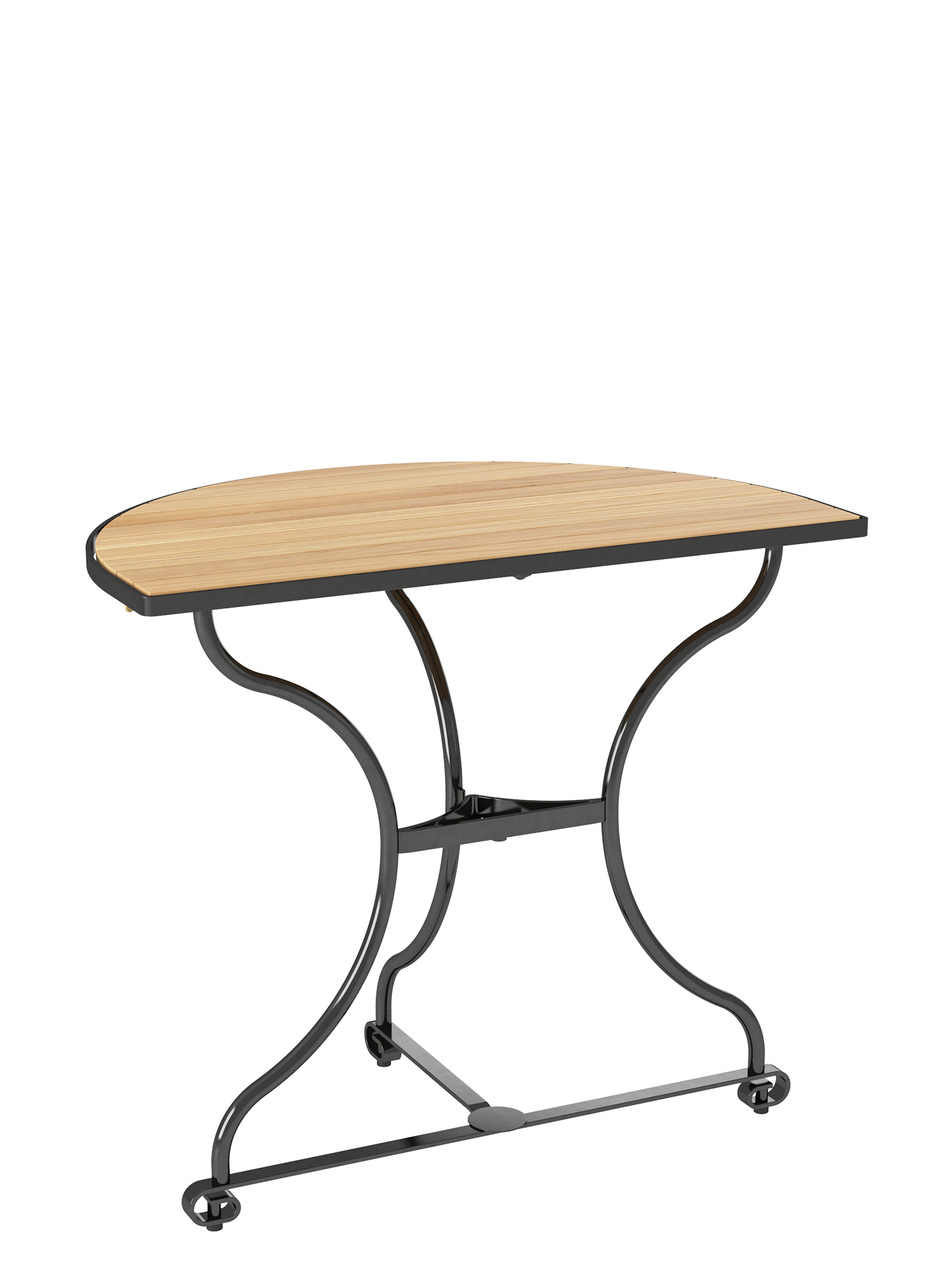 Der klappbare, halbrunde Tisch hat ein Gestell aus verzinktem, pulverbeschichtetem Stahl, die Tischplatte besteht aus Teakleisten, die in einem Stahlreif gelagert sind. Fußgleiter aus abriebfestem Kunststoff schützen wertvolle Böden vor Kratzern.