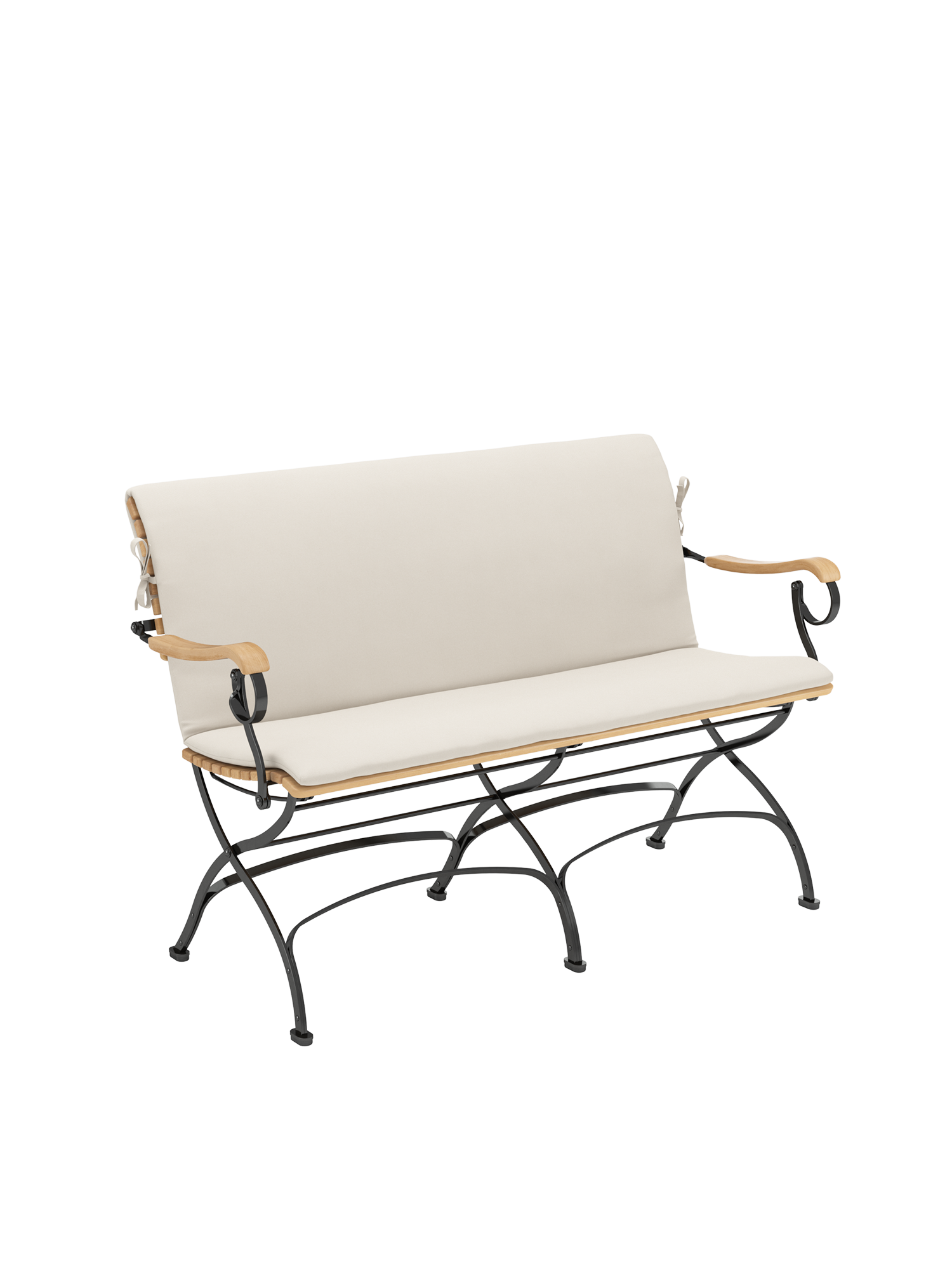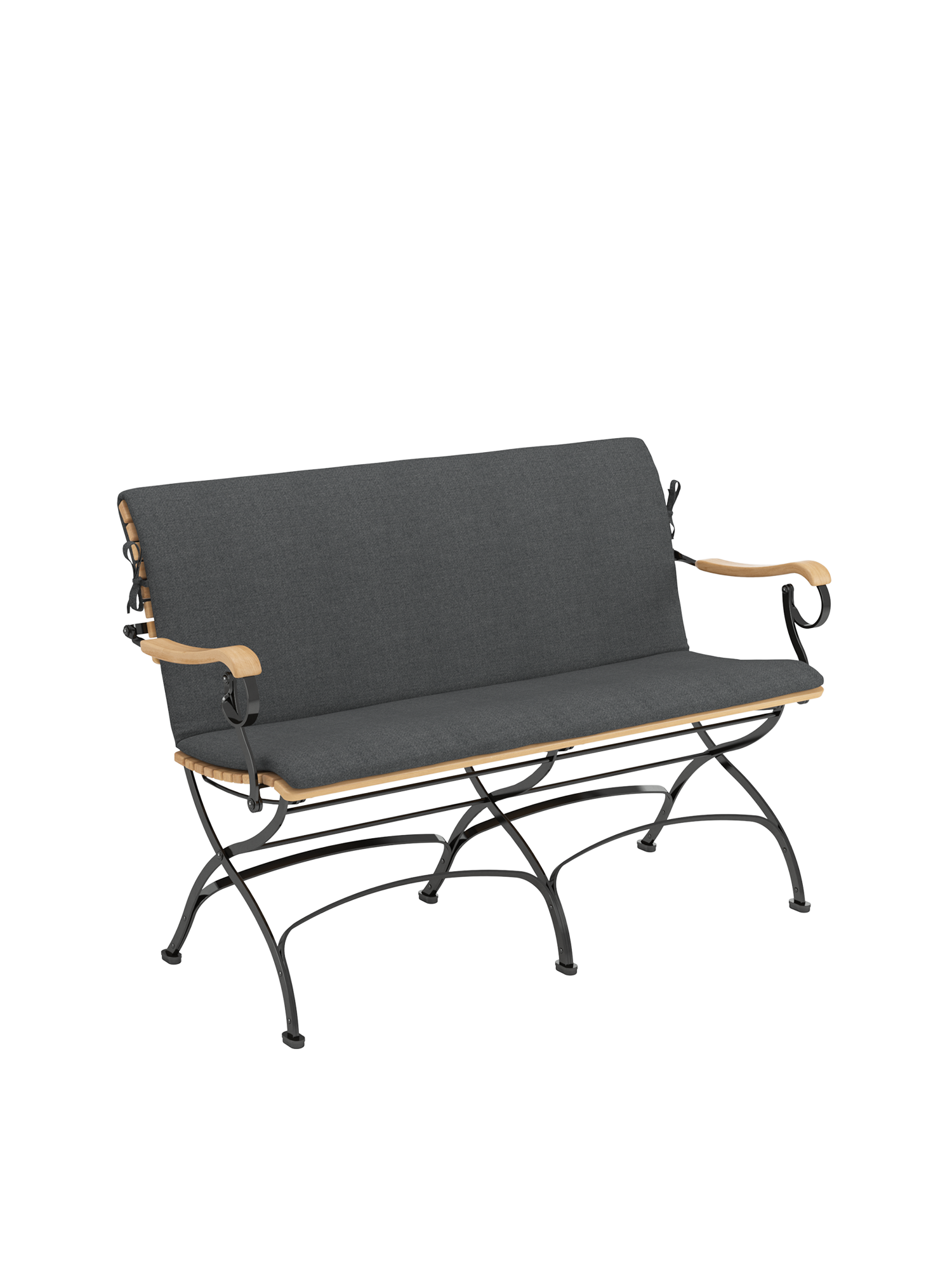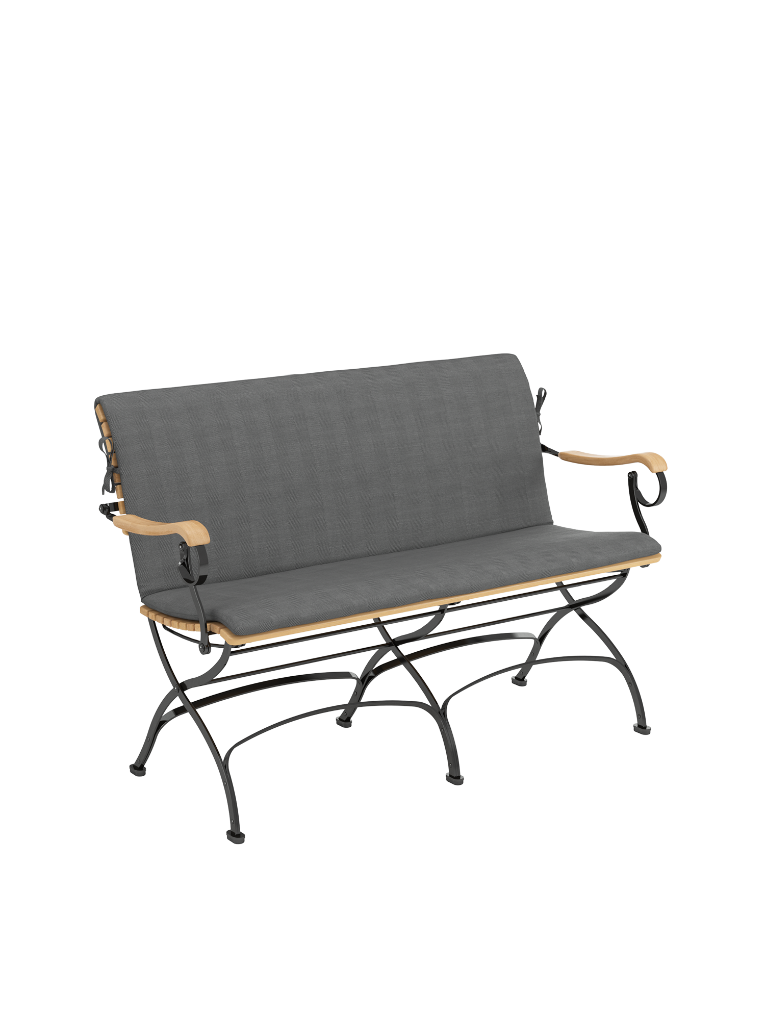 Die Rückenlehne der Bank besteht aus massiven Teakleisten, die in engem Abstand aufeinander folgen. Ihre Form ist nach einem der ungewöhnlichsten Kurvenverläufe modelliert: dem des menschlichen Rückens. Die geschwungenen Armlehnen aus Plantagenteak schmeicheln der Hand und entlasten den Körper. Die große Sitzfläche aus Teak ist dreidimensional geformt, so dass sie sich dem Körper anschmiegt. Vorn ist sie zur besseren Schenkelauflage abgerundet. Auflagen in verschiedenen Farbtönen erhöhen noch die Bequemlichkeit der Möbel und setzen feine Akzente.