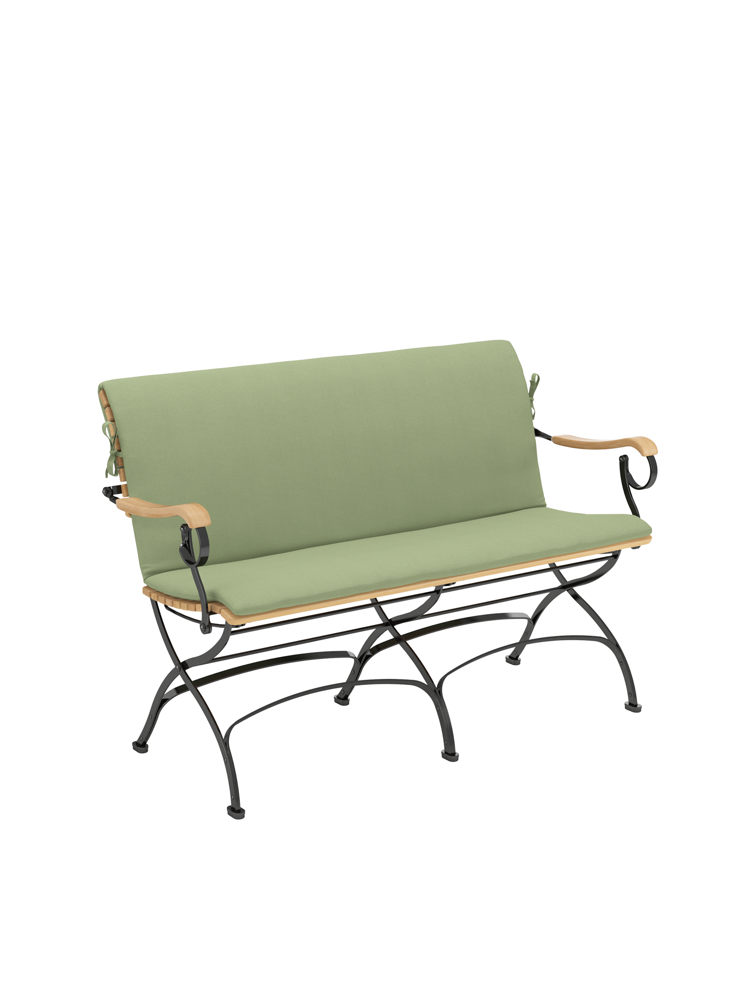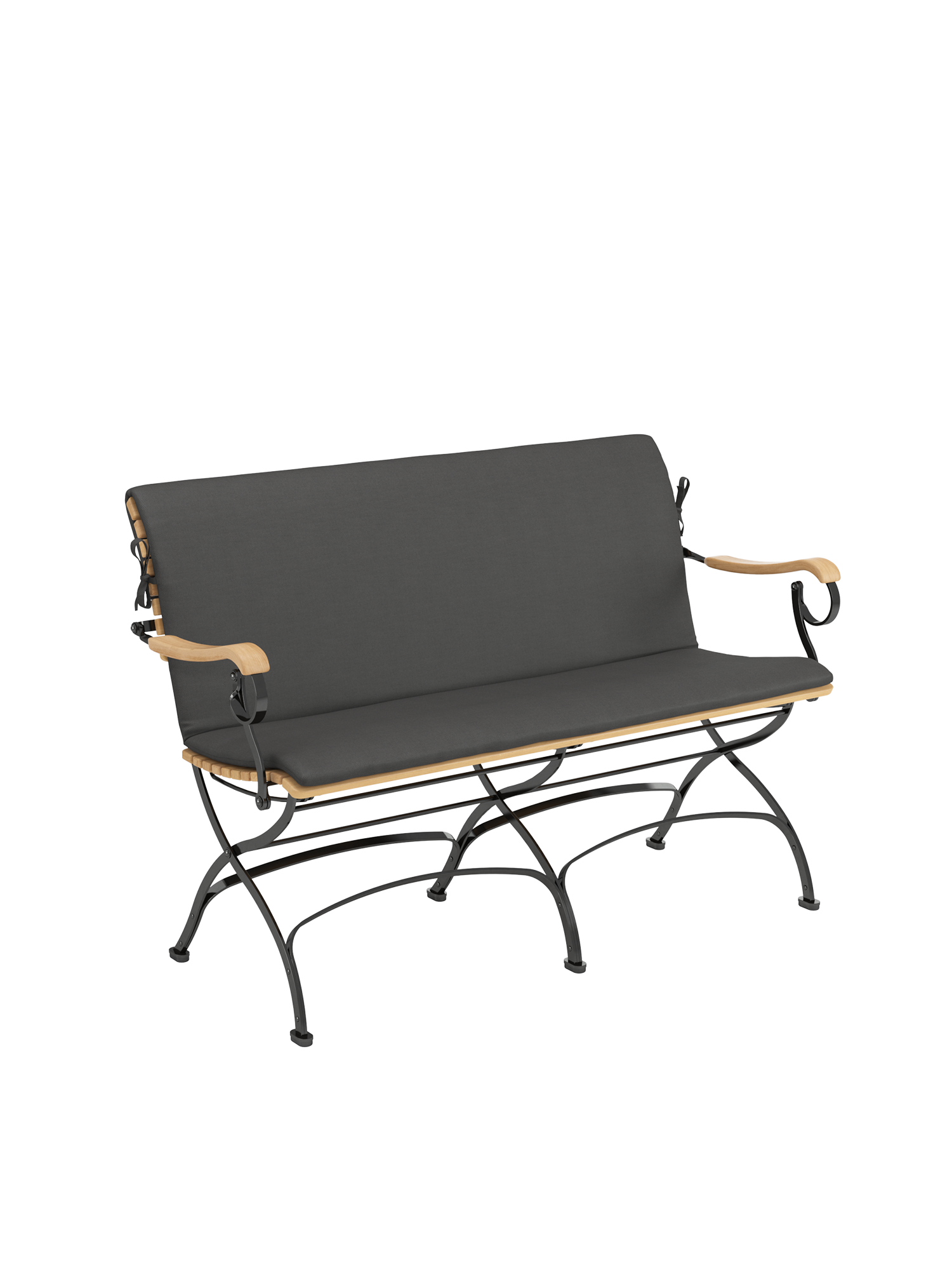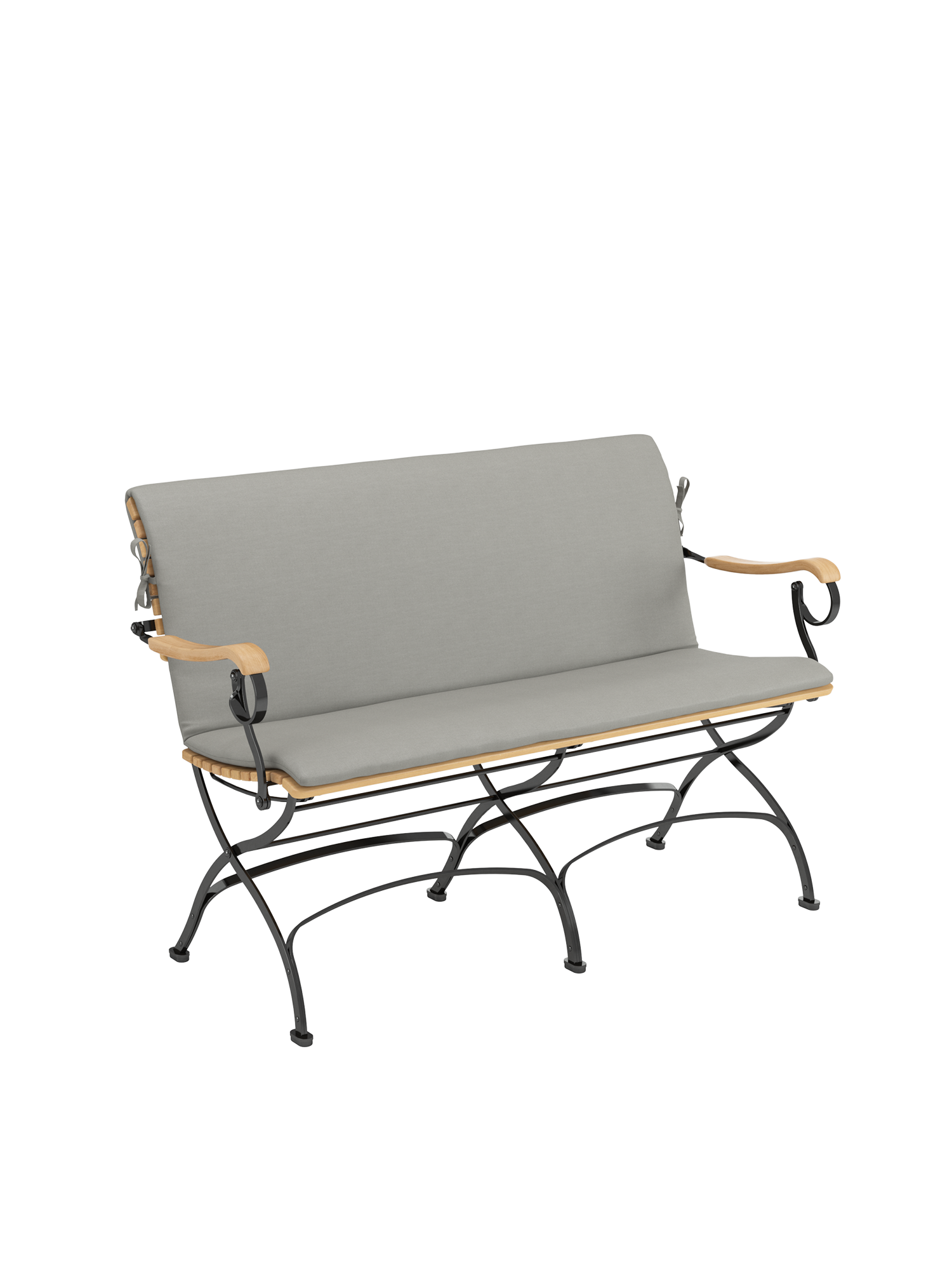 Die Rückenlehne der Bank besteht aus massiven Teakleisten, die in engem Abstand aufeinander folgen. Ihre Form ist nach einem der ungewöhnlichsten Kurvenverläufe modelliert: dem des menschlichen Rückens. Die geschwungenen Armlehnen aus Plantagenteak schmeicheln der Hand und entlasten den Körper. Die große Sitzfläche aus Teak ist dreidimensional geformt, so dass sie sich dem Körper anschmiegt. Vorn ist sie zur besseren Schenkelauflage abgerundet. Auflagen in verschiedenen Farbtönen erhöhen noch die Bequemlichkeit der Möbel und setzen feine Akzente.